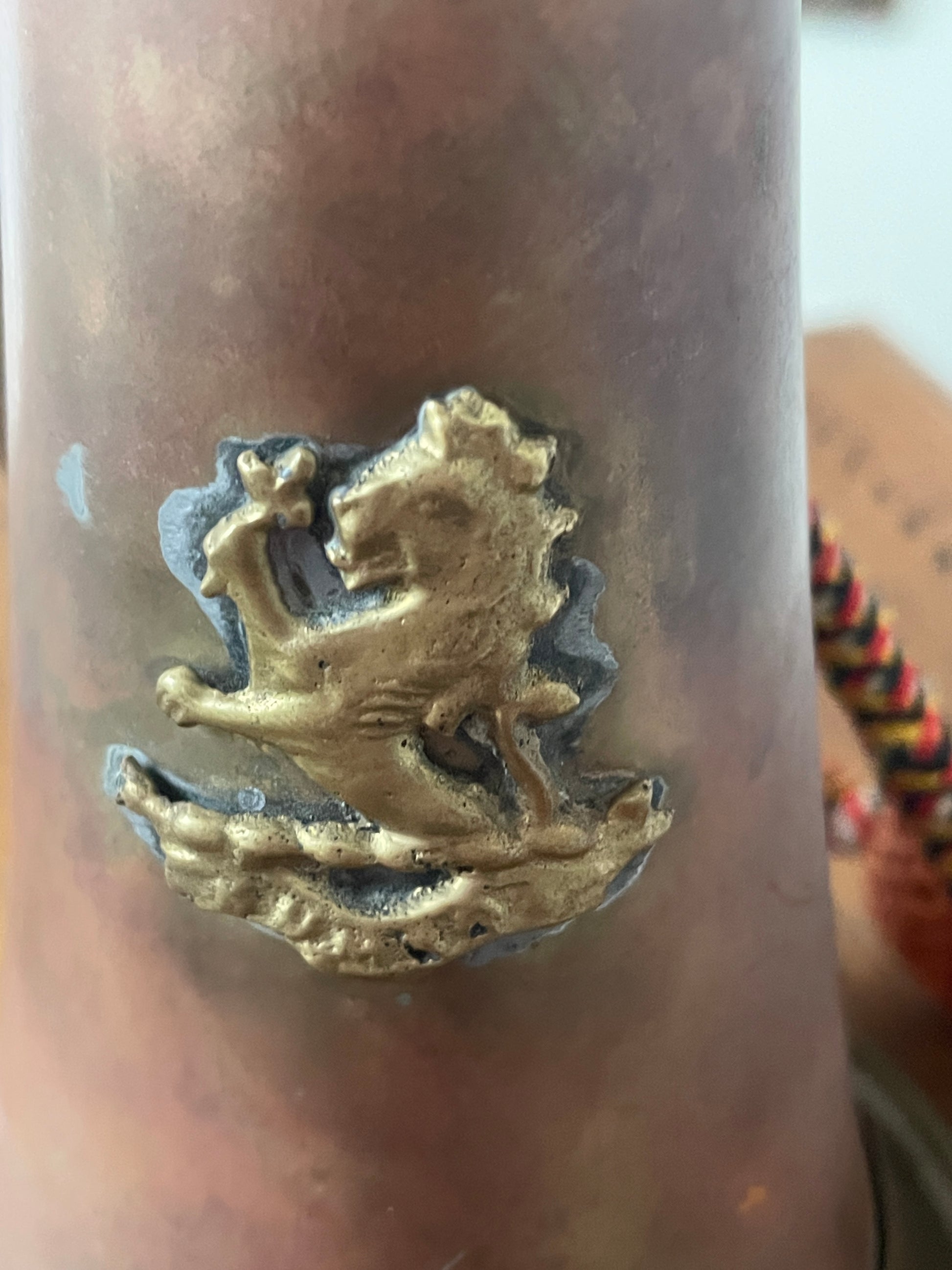 An applied decorative brass badge featuring an animal motif is fixed to the body, adding a heraldic and ceremonial element typical of hunt equipment rather than utilitarian signalling devices. A short chain retainer is also present, consistent with practical use while mounted.