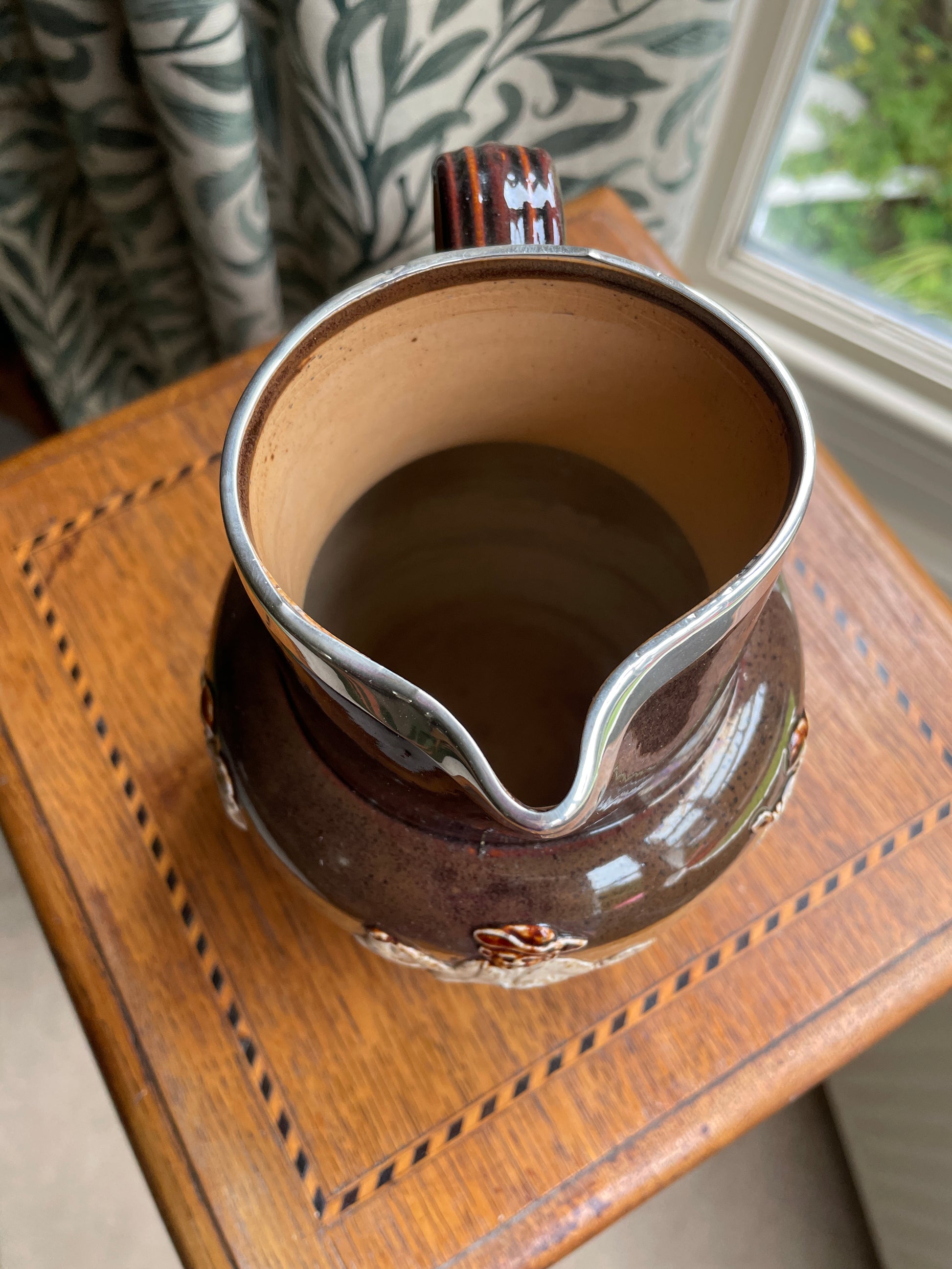 A fine antique Doulton Lambeth stoneware jug, with a sterling silver rim hallmarked for Birmingham, 1899, maker JH (James Hutton).