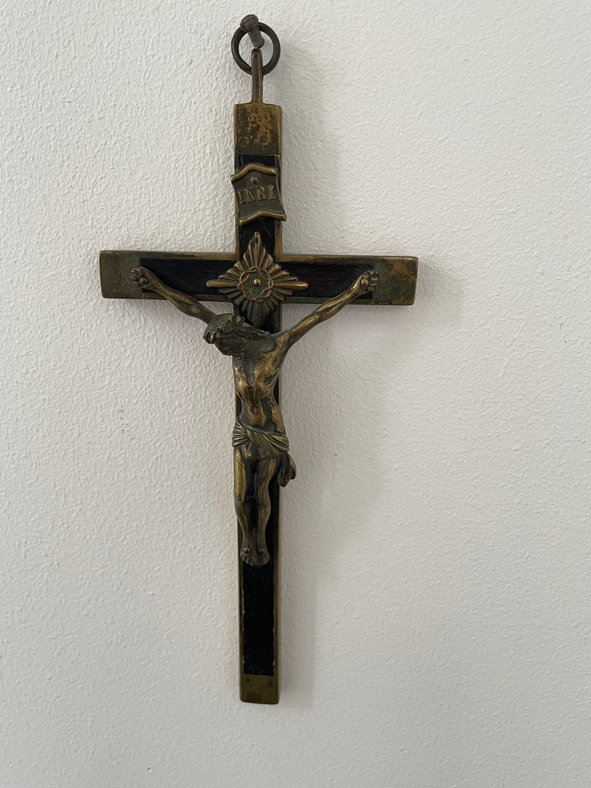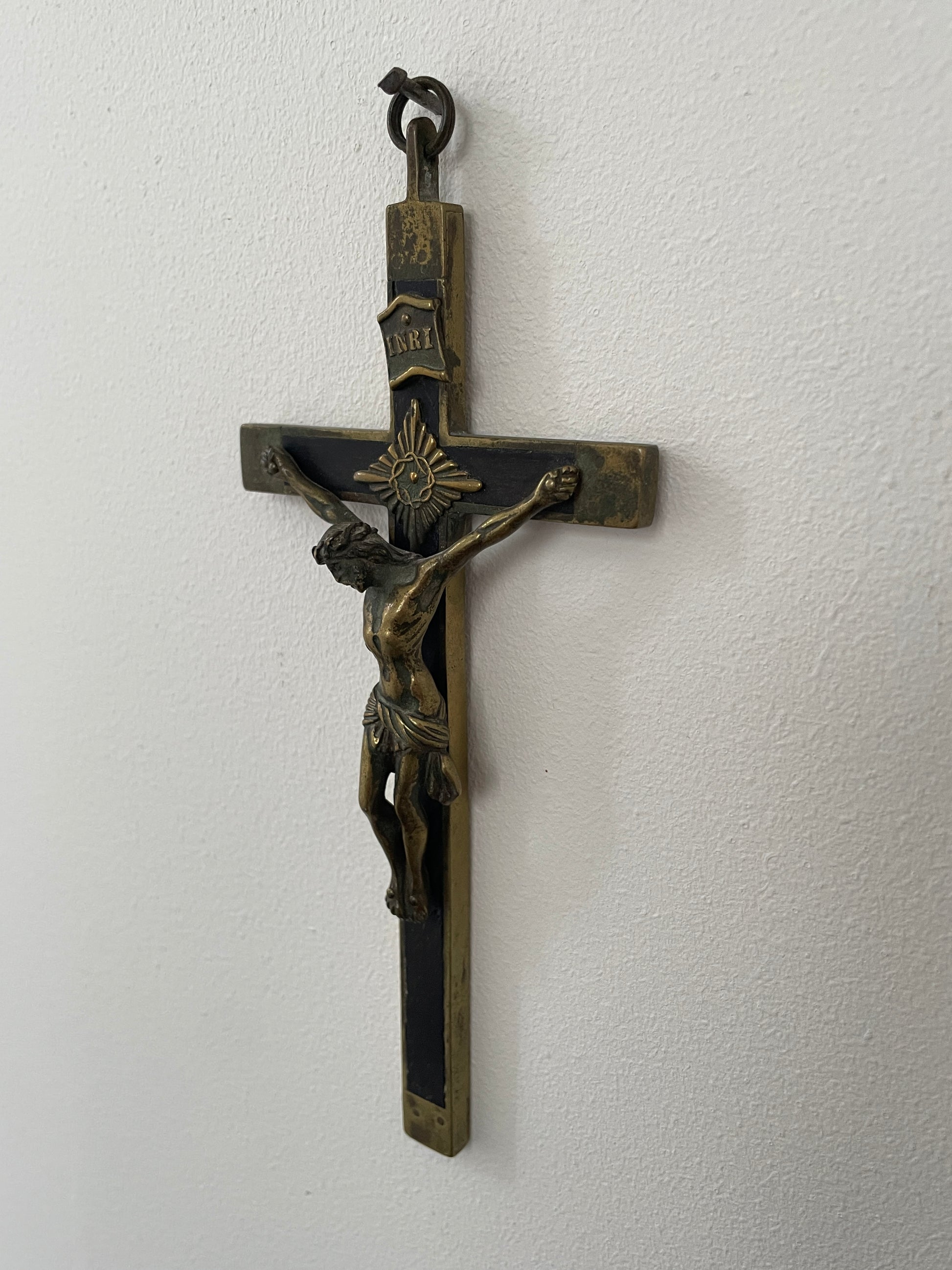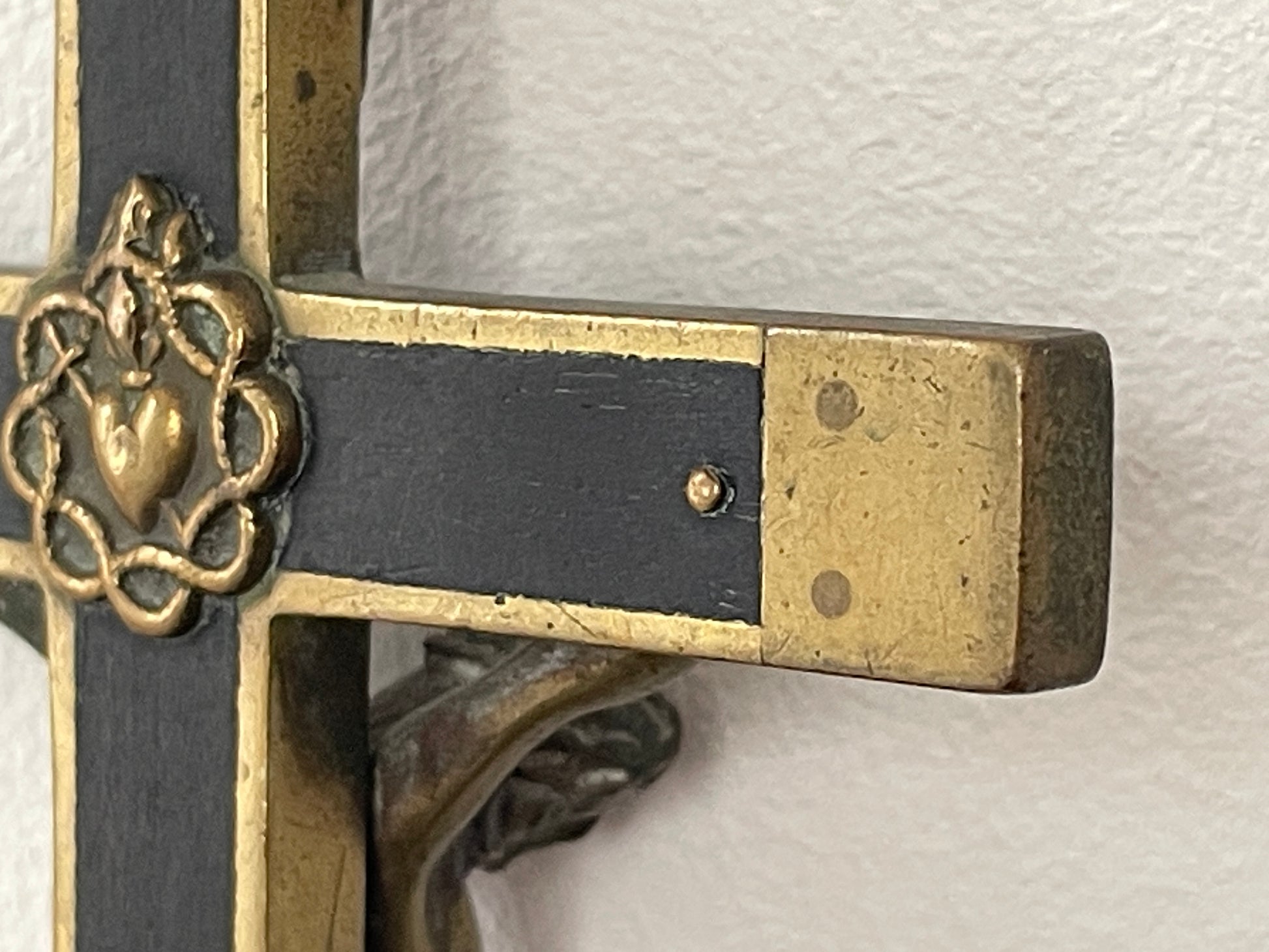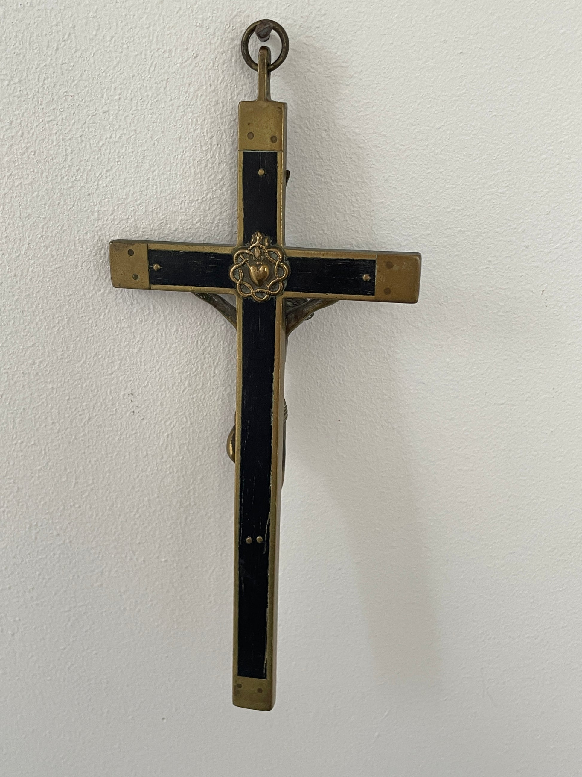 Antique French Brass and Ebonised Wood Crucifix – Cast Corpus Christi and Sacred Heart Motifs (c.19th Century)