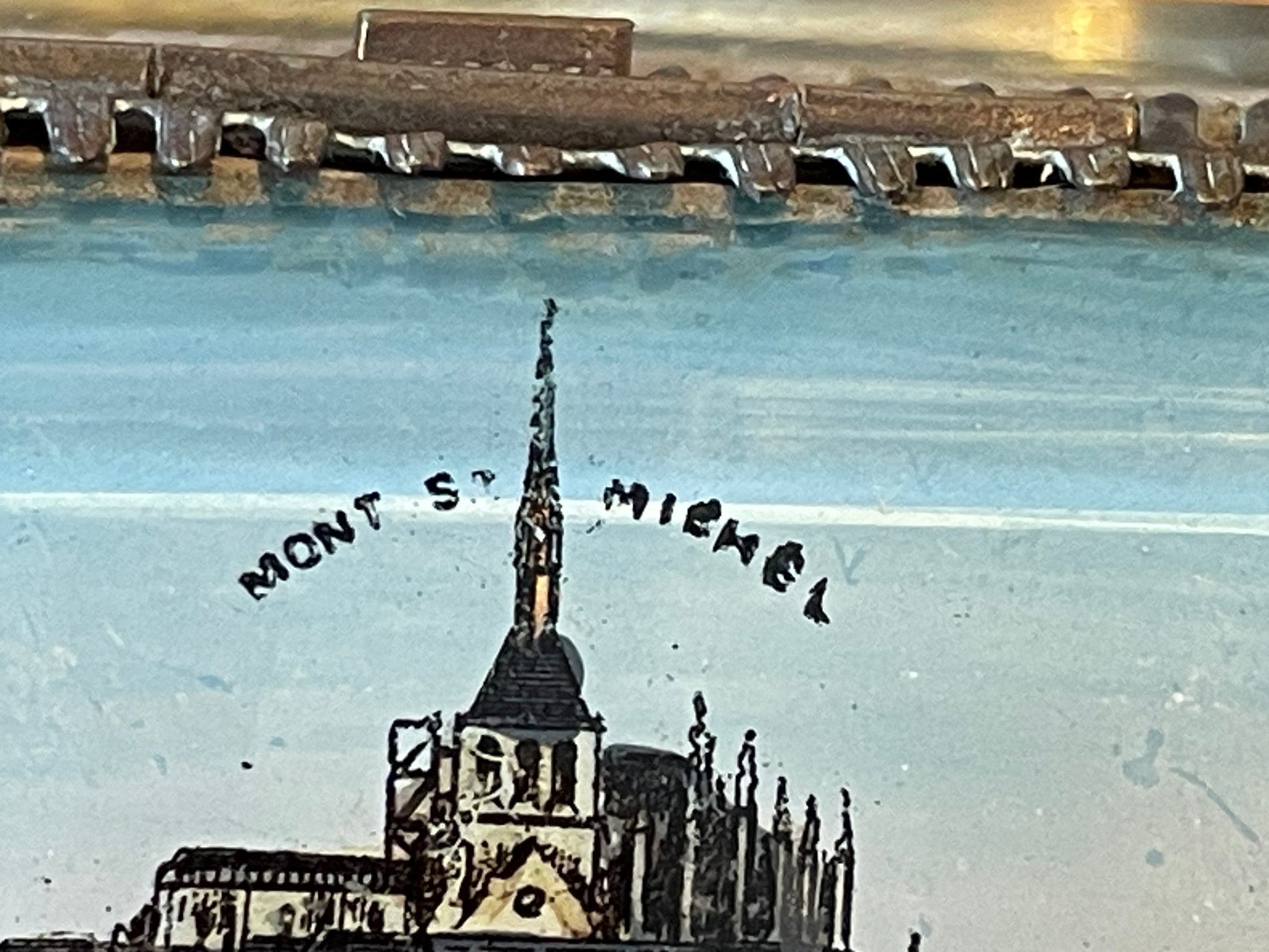 A charming antique French glass casket dating to the early 20th century, featuring deeply bevelled faceted glass panels set within ornate brass mounts and raised on small decorative feet. The lid is topped with a finely printed and hand-tinted view of Mont St Michel, making this an appealing example of the souvenir caskets sold in France during the Belle Époque and early tourist era.