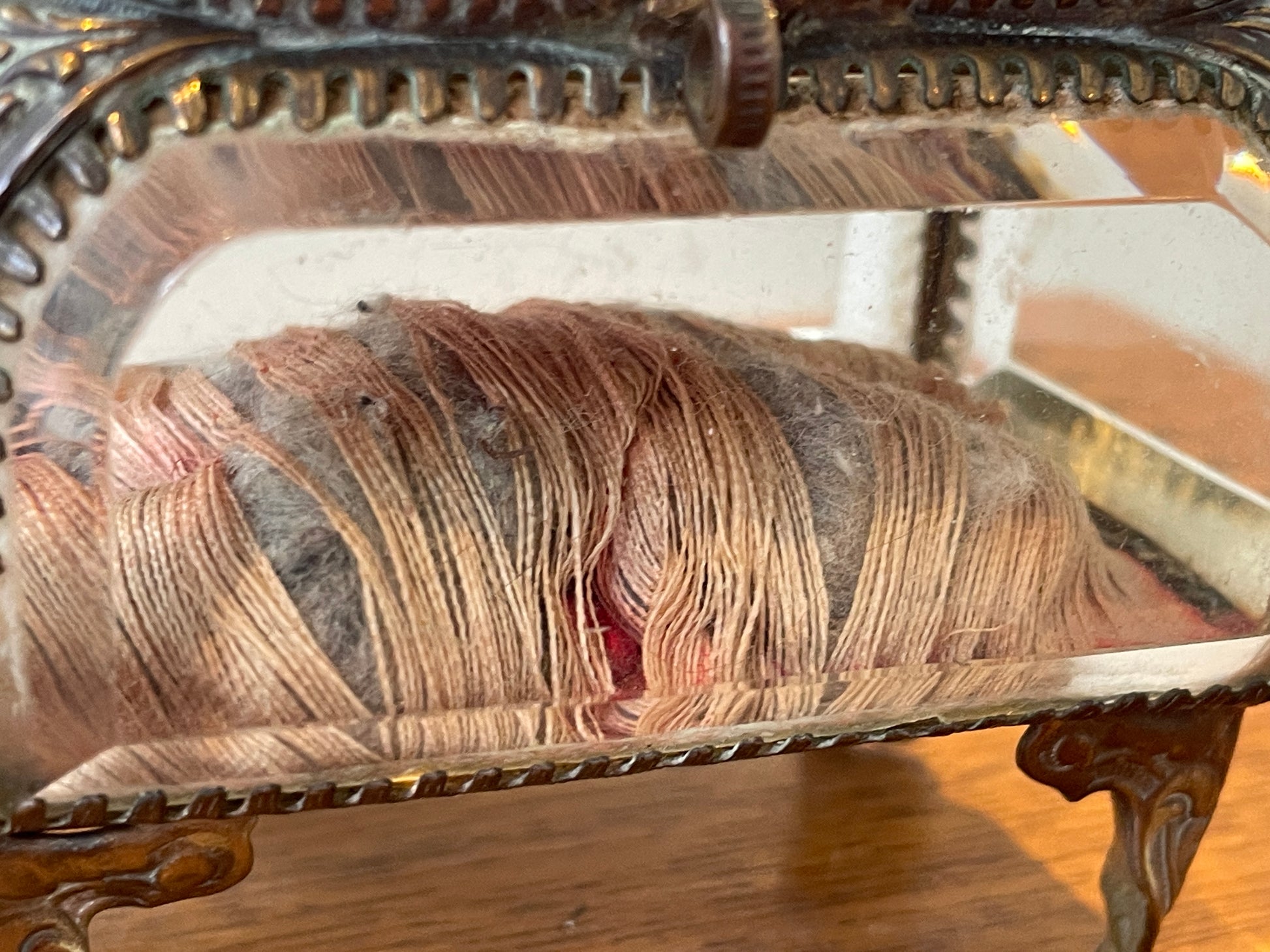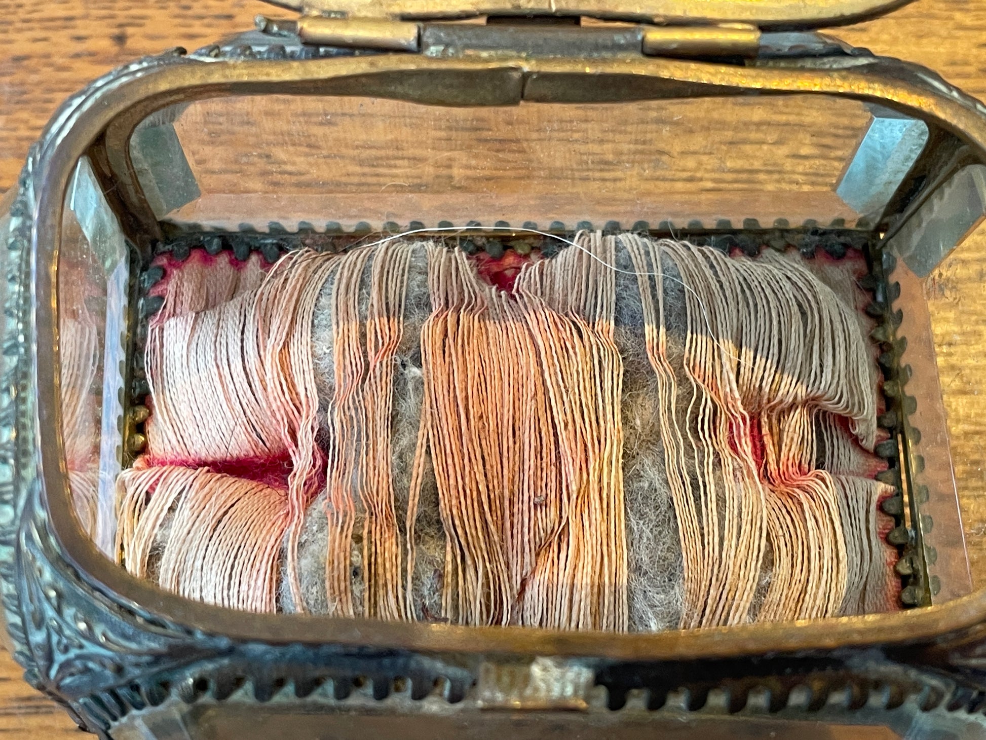 The interior retains its original padded silk cushion, now time-faded to soft rose and grey tones, adding to its period character. These caskets were traditionally used for rings, keepsakes and small adornments, and remain highly collectible today for their elegant form, craft-based construction and evocative continental charm.