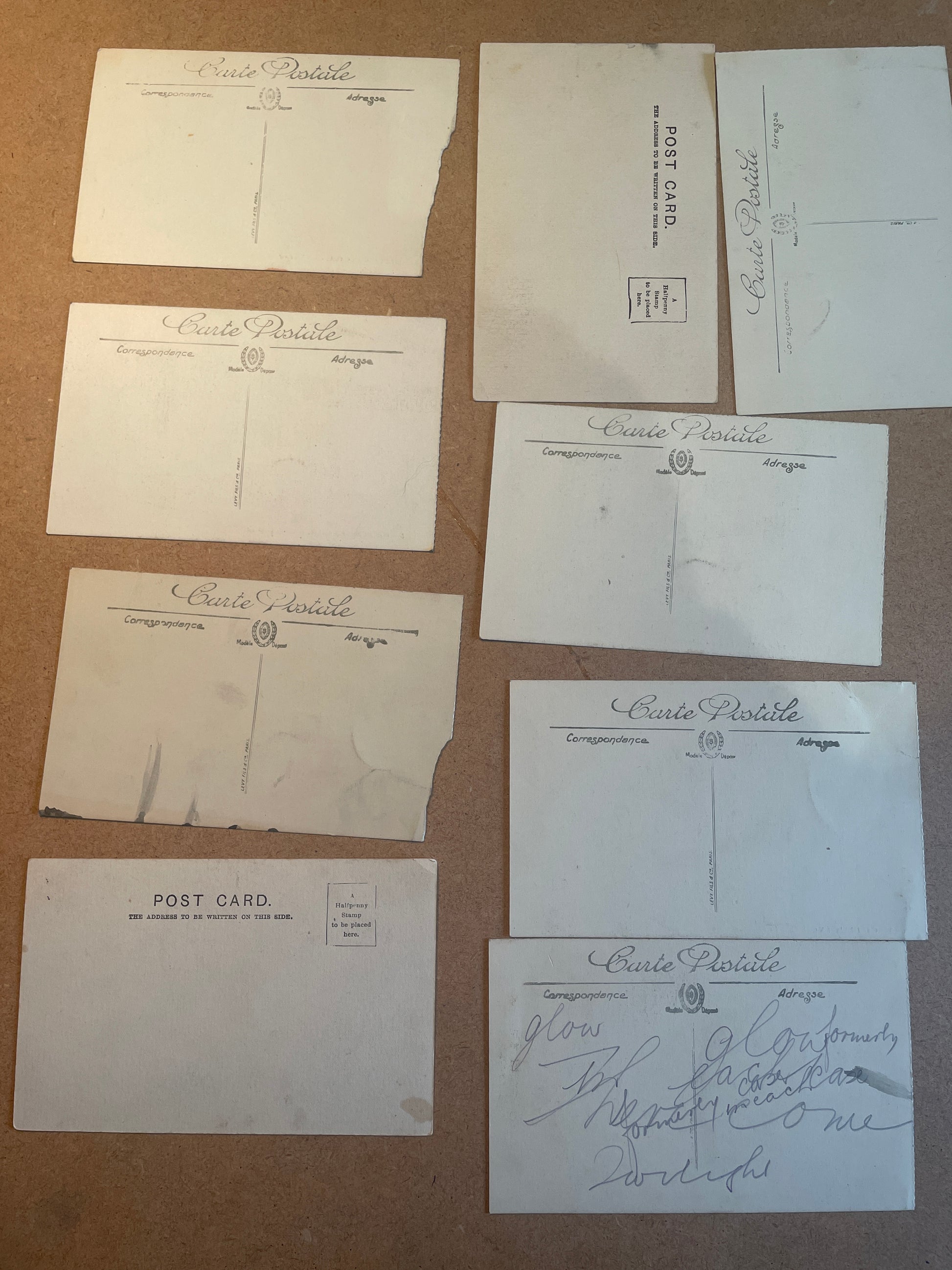 A remarkable set of original antique French postcards (circa 1900–1920), discovered within the Eric Morecambe family photo album that formed part of The Eric Morecambe Collection auctioned by Hansons in January 2025.