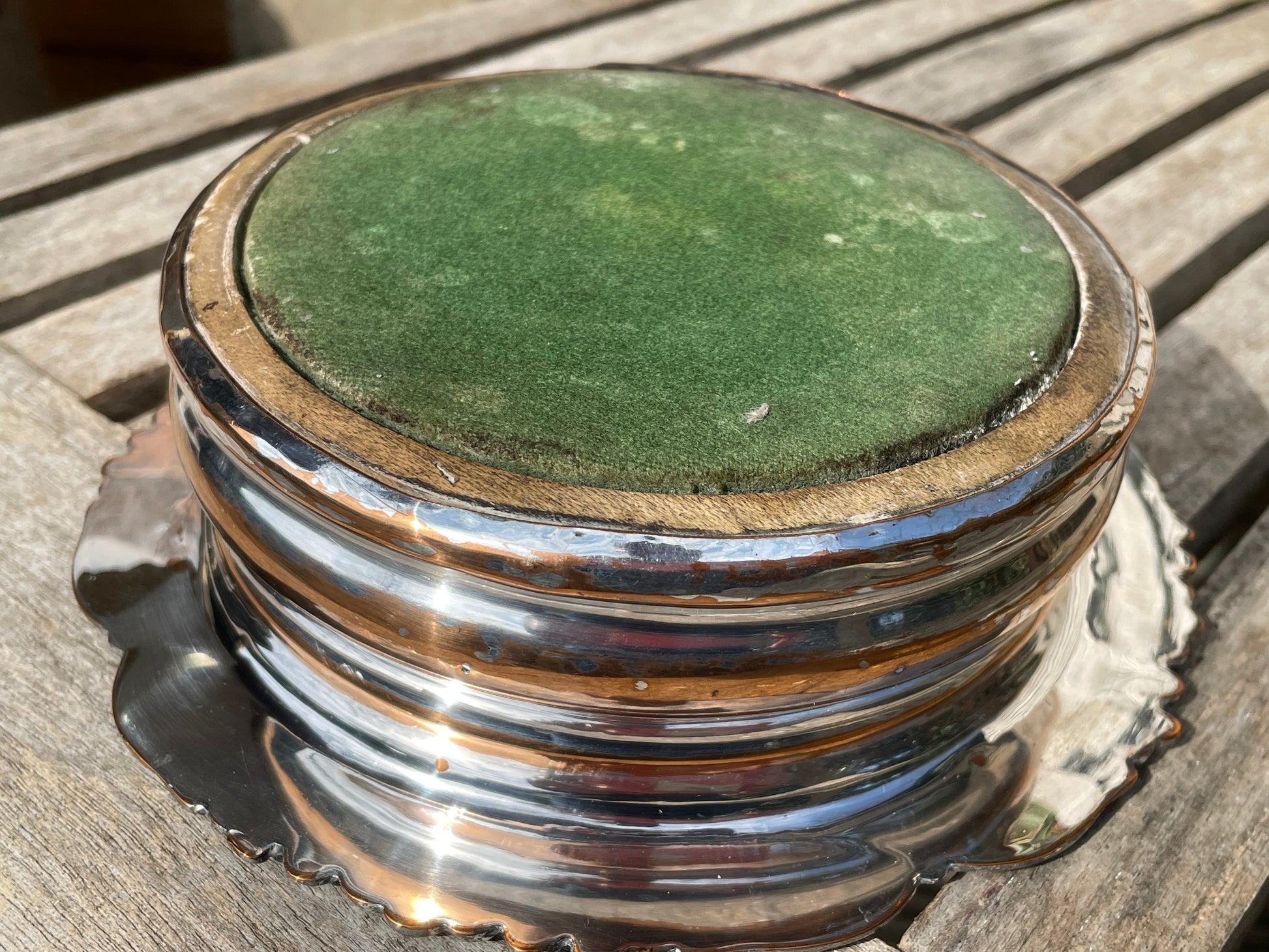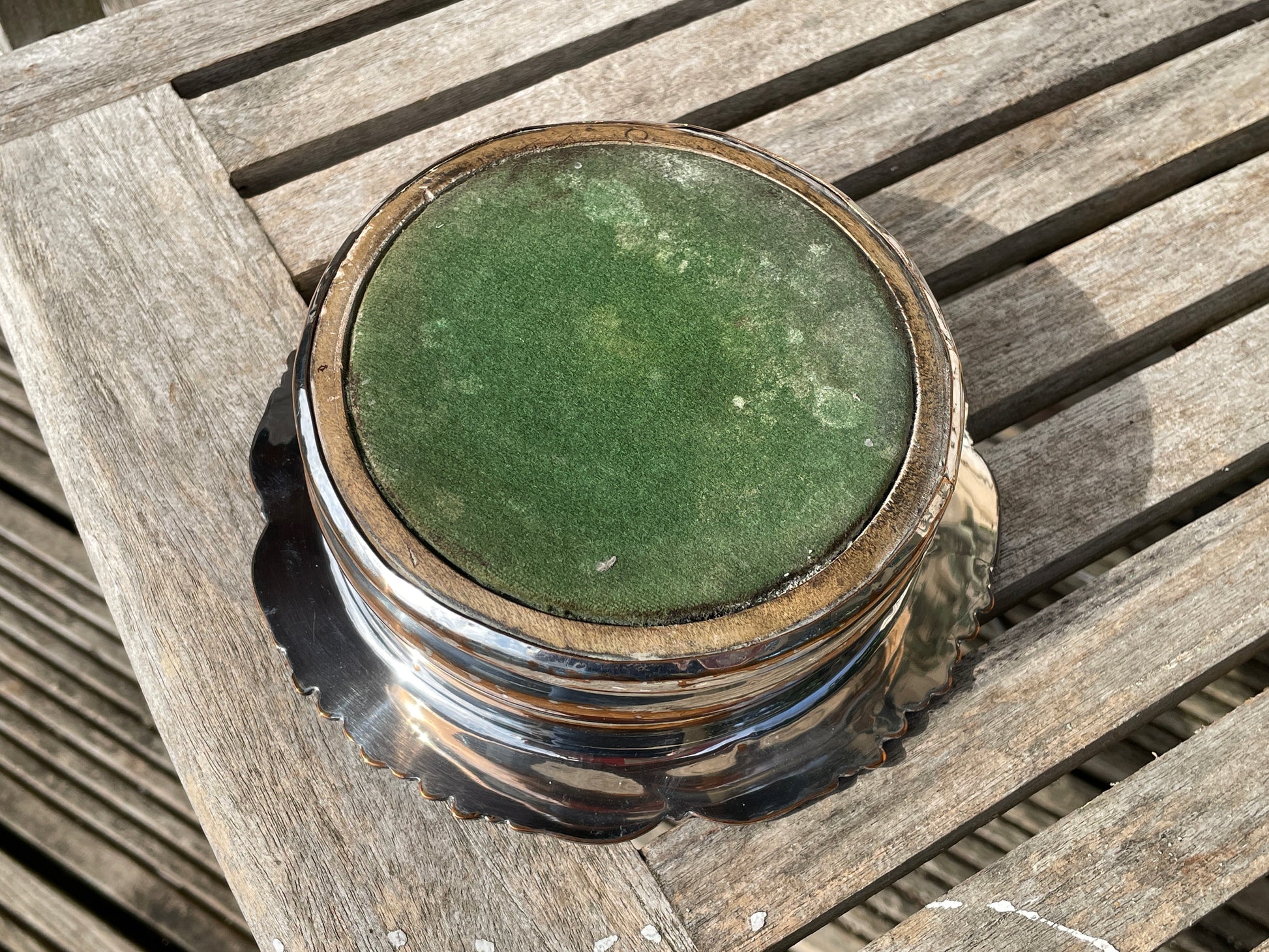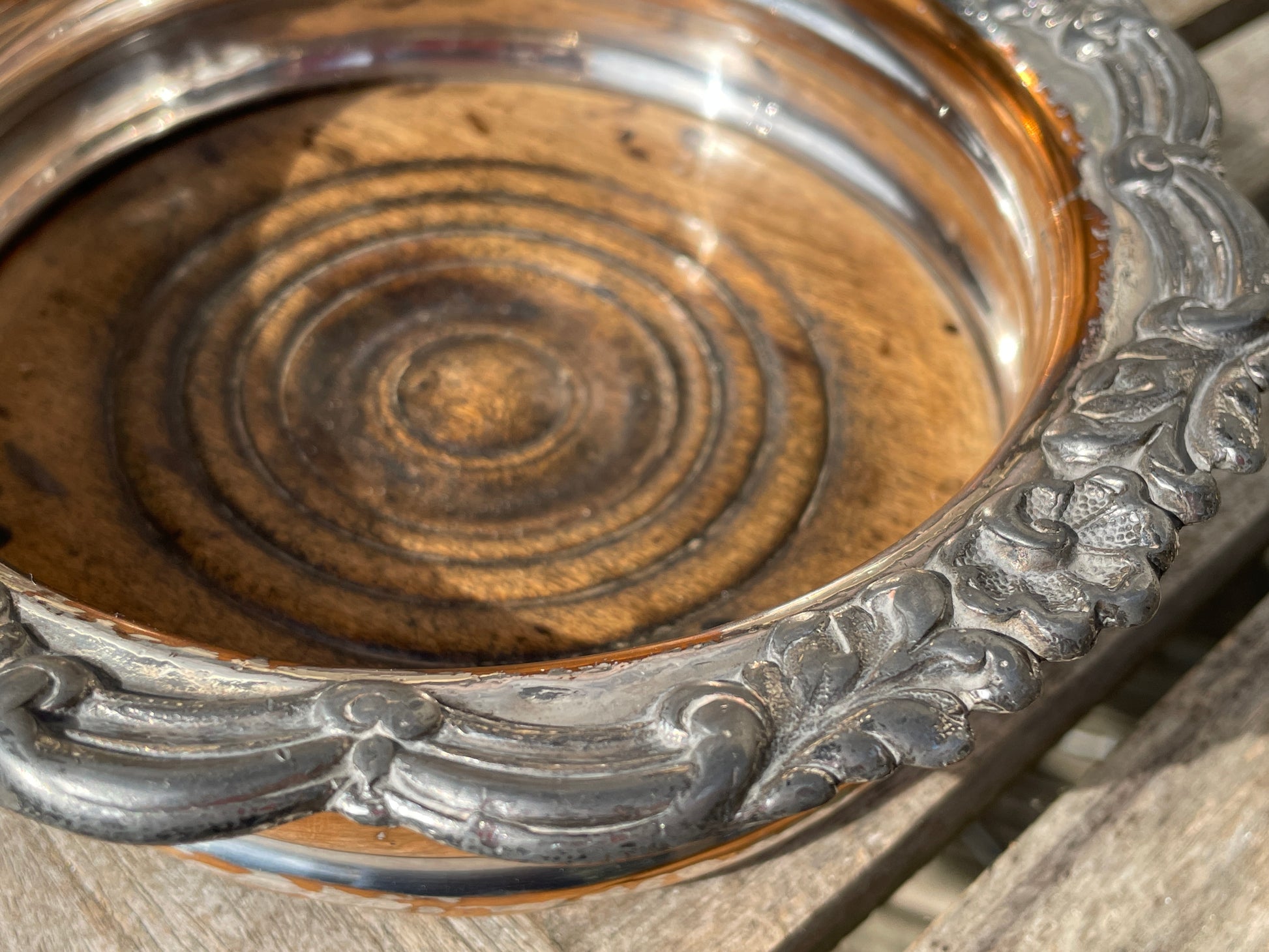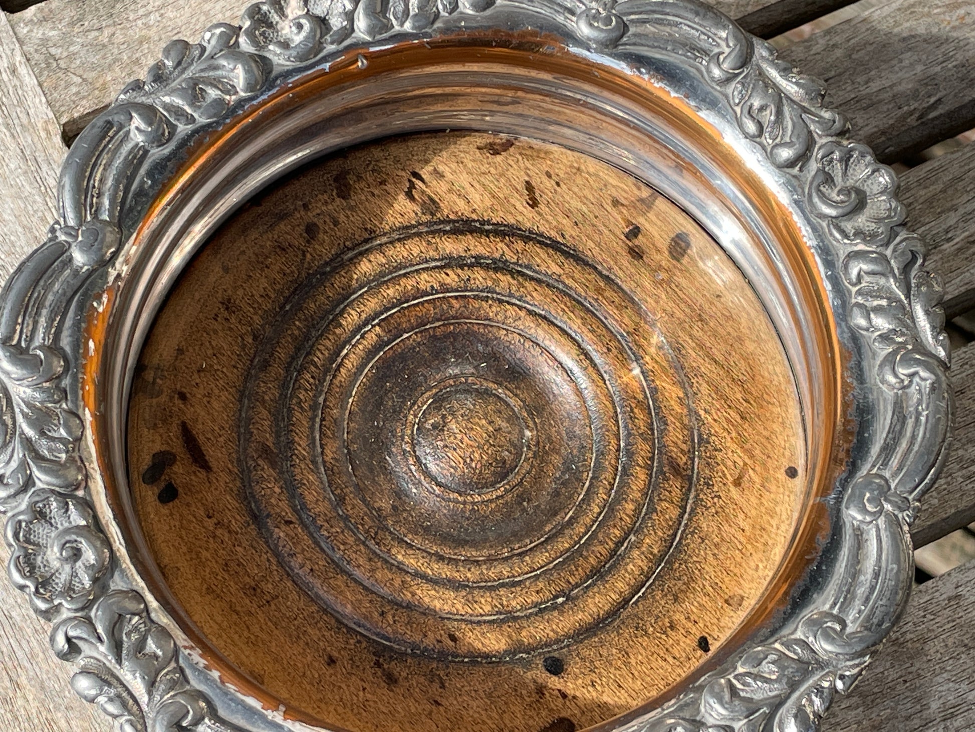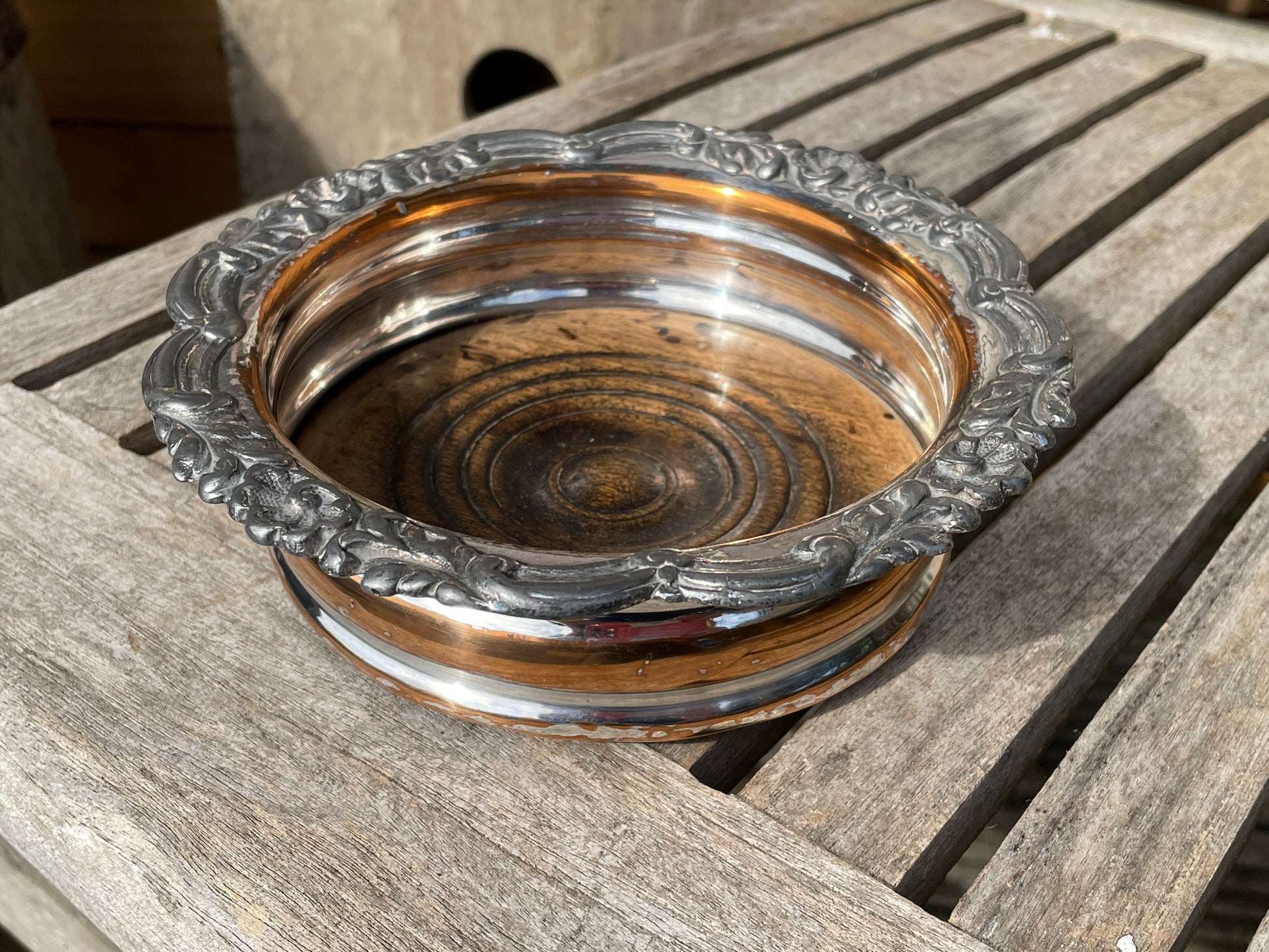 Silver plated and oak wine bottle coaster - lovely old marks to the wooden base , original worn green felt base