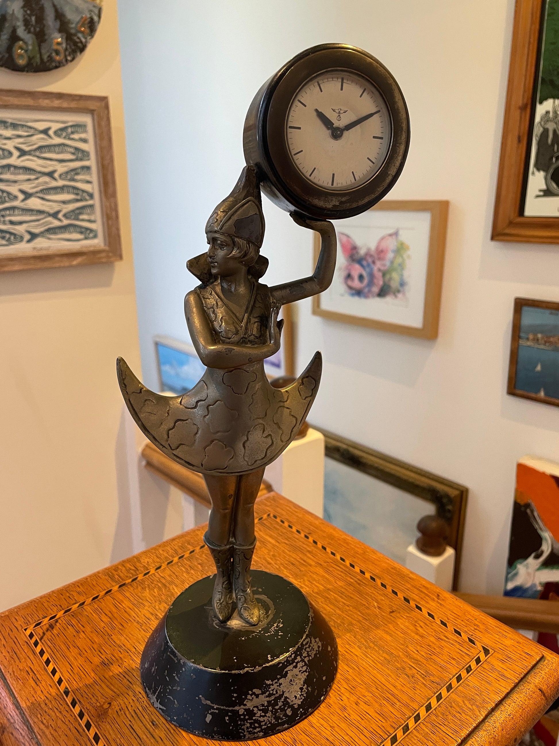 A striking and atmospheric Art Deco figural clock, modelled as a stylised dancing girl poised mid-step with a dramatic crescent moon–shaped skirt, holding aloft a circular drum clock. The figure is cast in a silvered-metal alloy with an ebonised base, displaying classic 1930s design cues — sculptural boots, angular hat, and an elegant theatrical pose full of movement and charm.