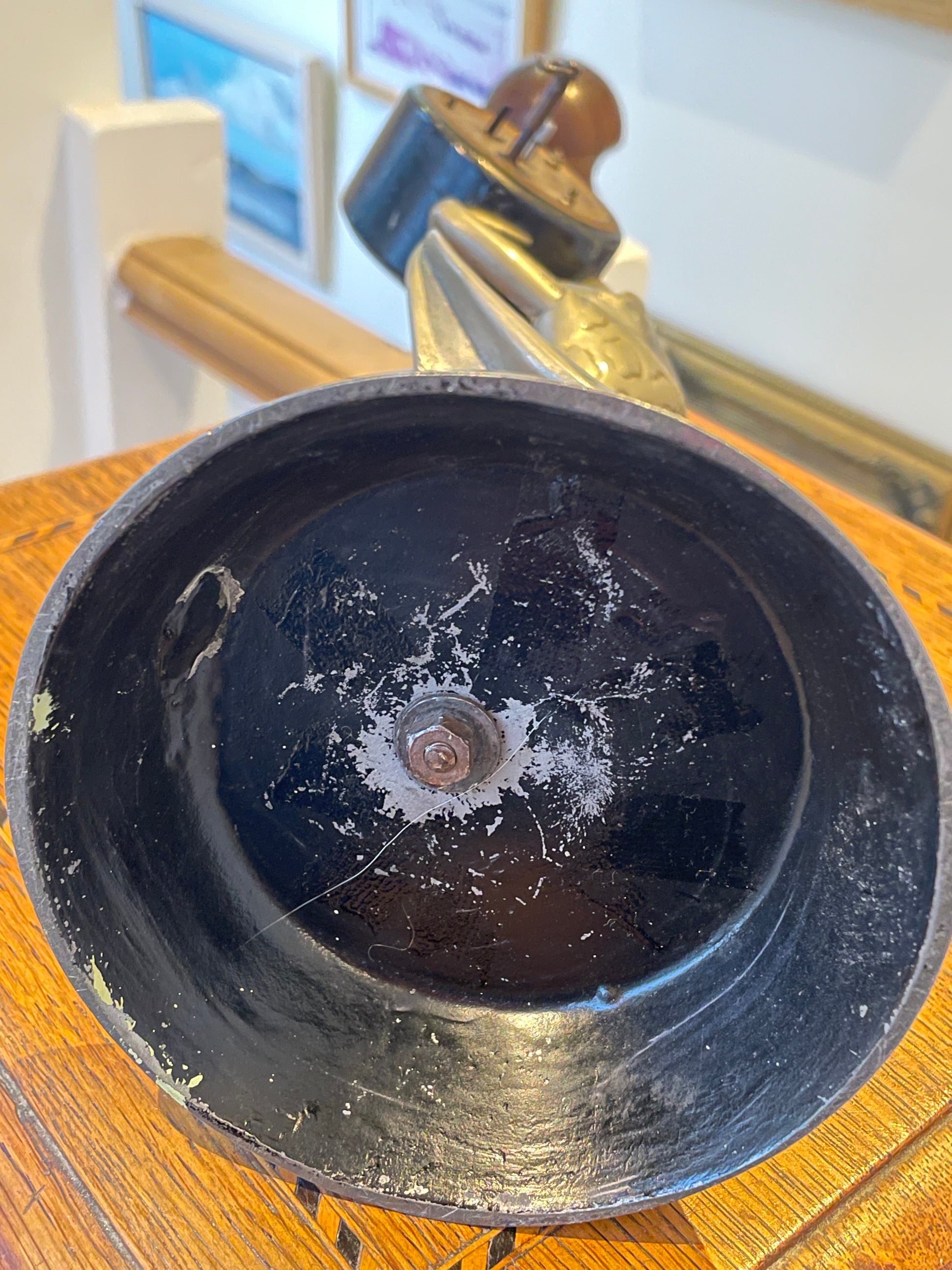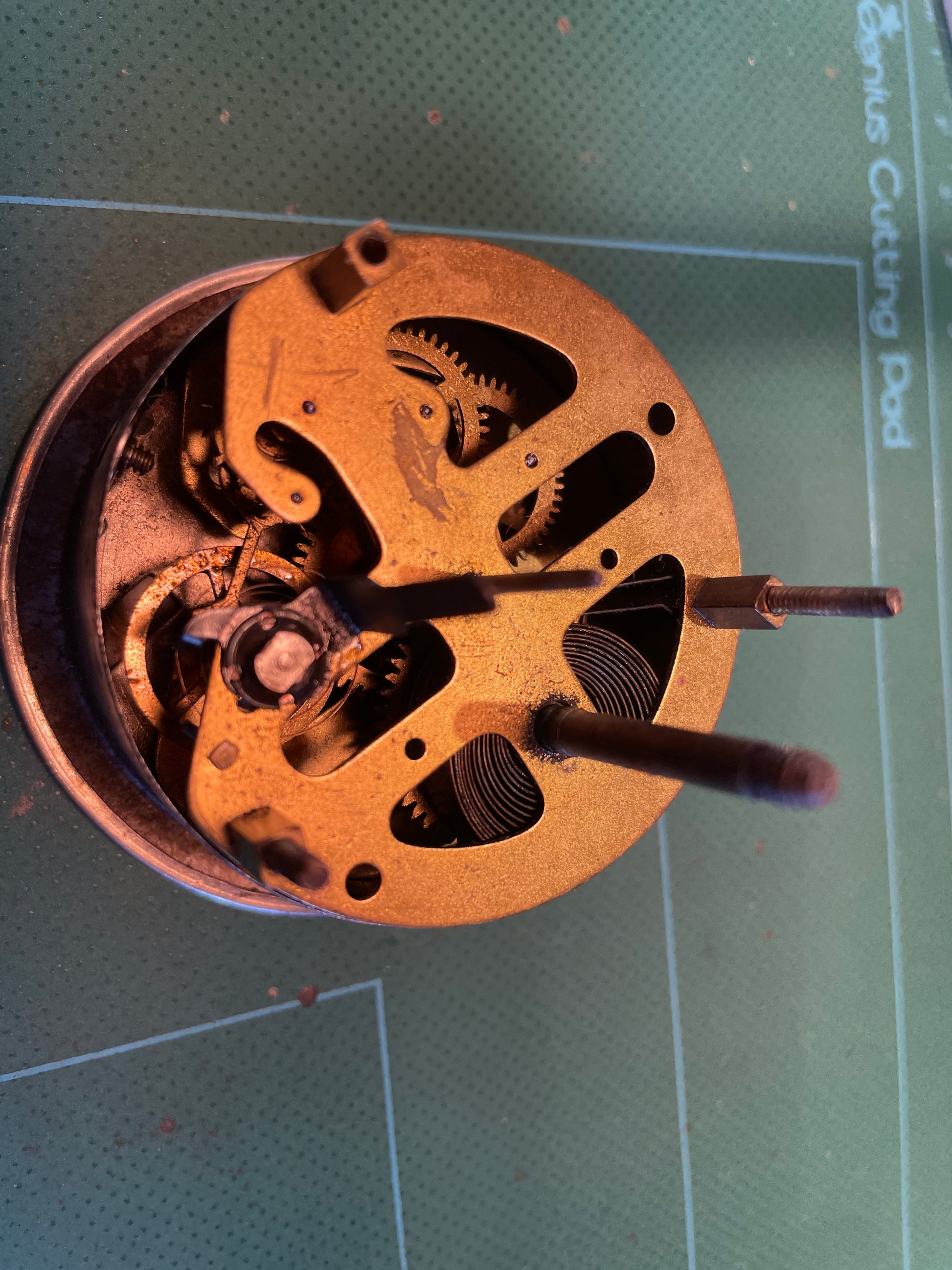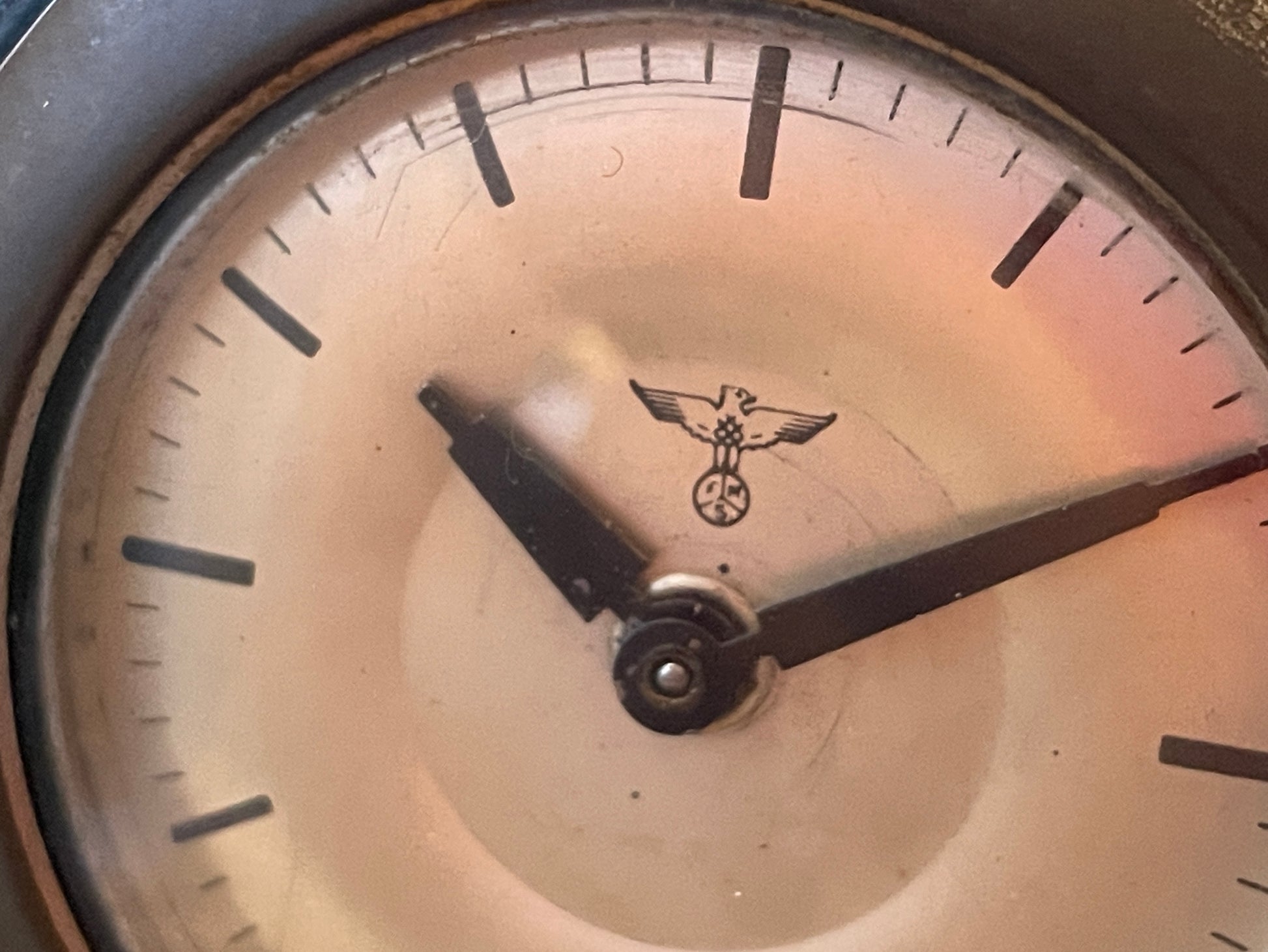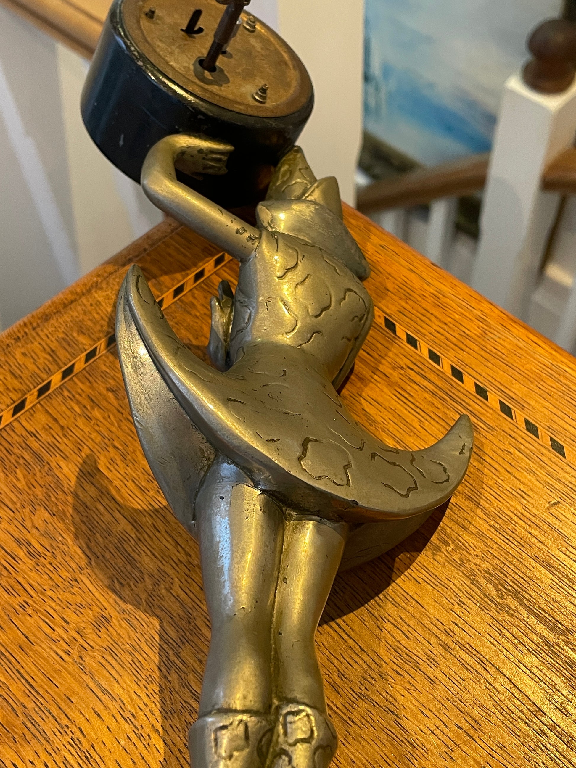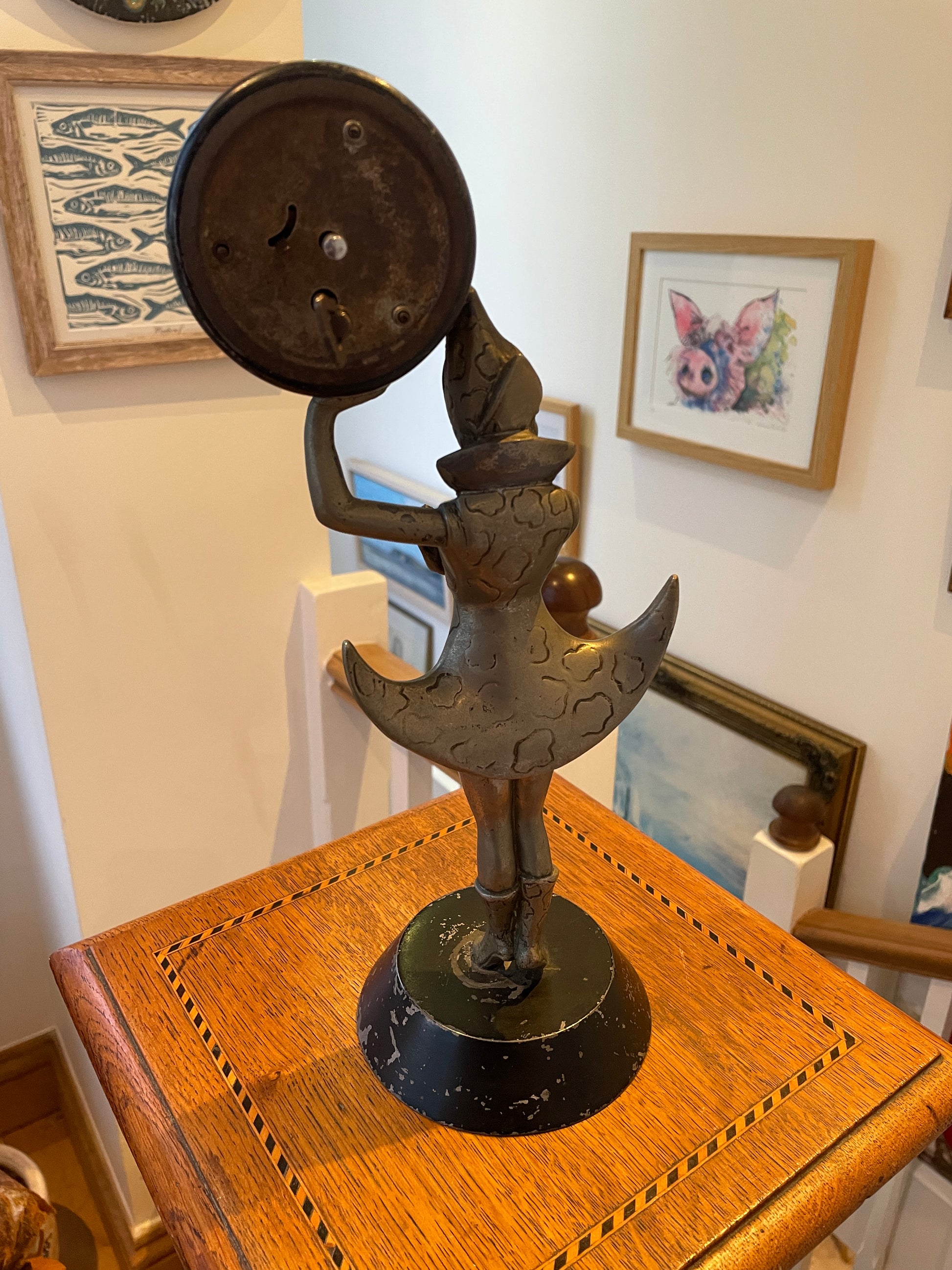 The clock itself is a genuine early–mid 20th-century German FMS Mauthe movement, housed within the drum. The dial bears the Mauthe eagle emblem with the ‘FMS’ monogram worked discreetly into the central roundel — the abbreviation for Friedrich Mauthe, Schwenningen, a major German clockmaker active from the 19th century through the 1940s. This emblem type was in use during the 1930s–40s, perfectly aligning with the styling of the figure.
