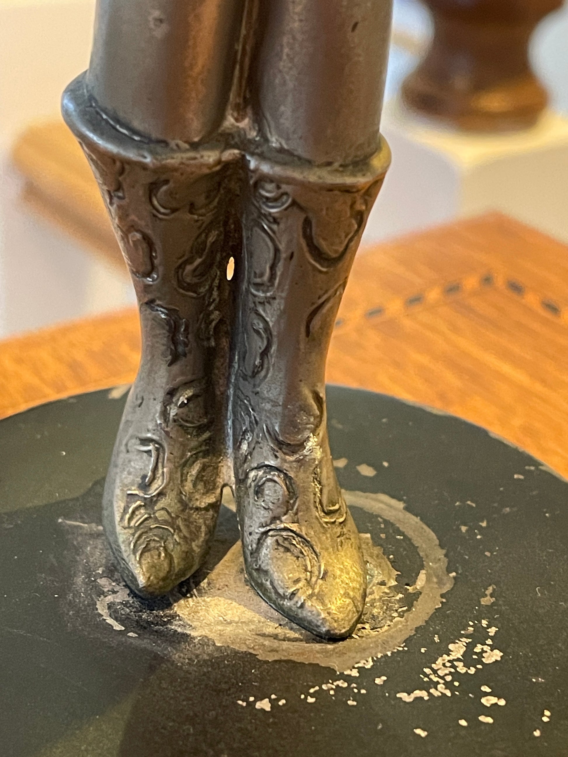 There are losses to the lacquer on the head and hat, together with areas of surface wear and patina across the figure. The ebonised base shows paint loss and rubbing consistent with age and handling. The clock is currently running but has not been assessed for long-term accuracy and may benefit from routine servicing. The dial clearly displays the FMS Mauthe eagle monogram, confirming the maker. Please refer to the detailed photographs for a complete visual record of condition.