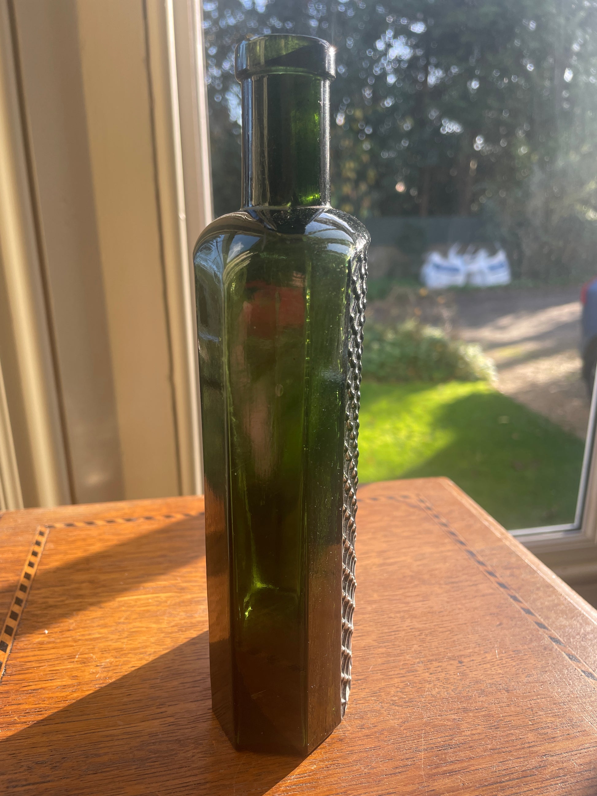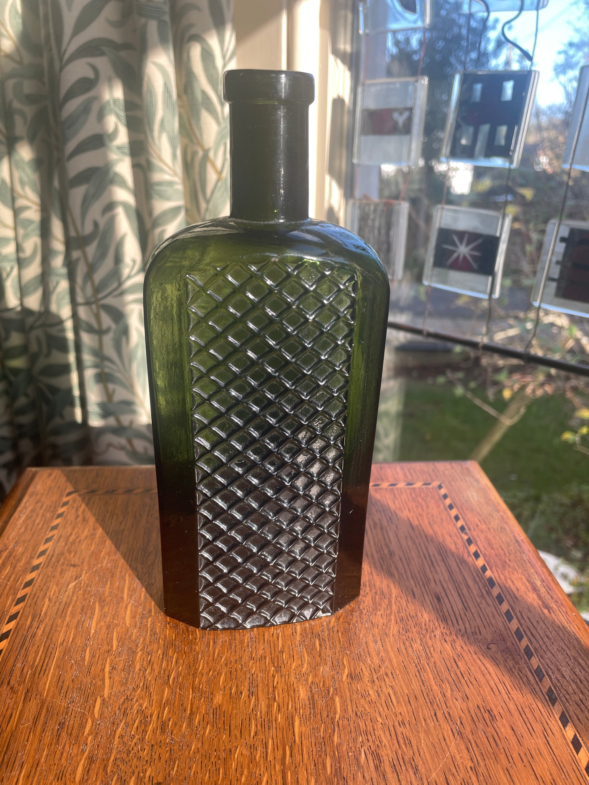 A superb late-Victorian to early-Edwardian chemist’s poison bottle in deep olive-green glass, featuring the classic raised cross-hatched warning panel used from the 1880s–1910s to signal hazardous contents. This large 12oz example stands an impressive 19.5cm tall, with sharply moulded diamond ribbing to the front face and plain panels to the sides and reverse — a typical format for early poison bottles made for chemists and dispensaries.