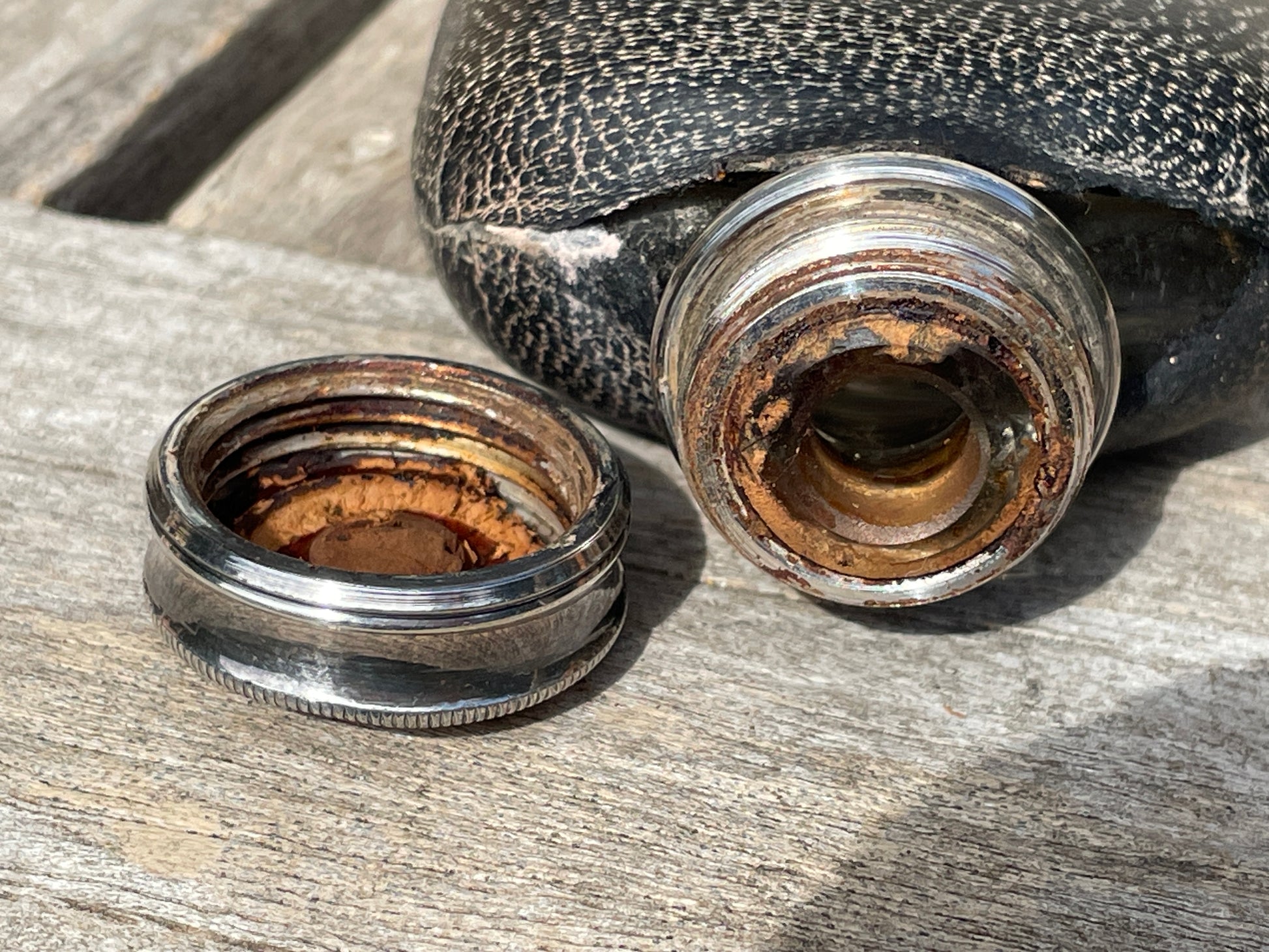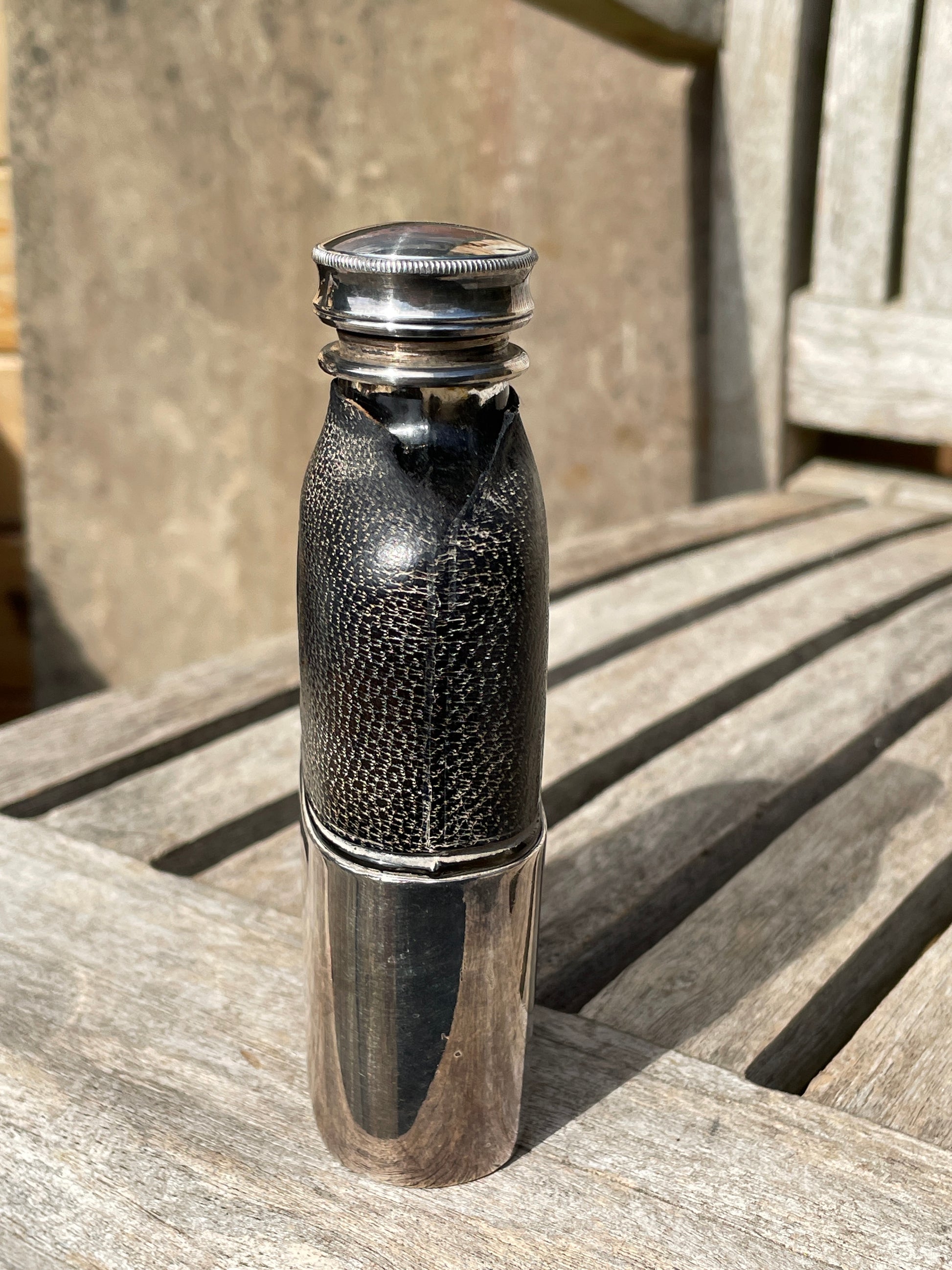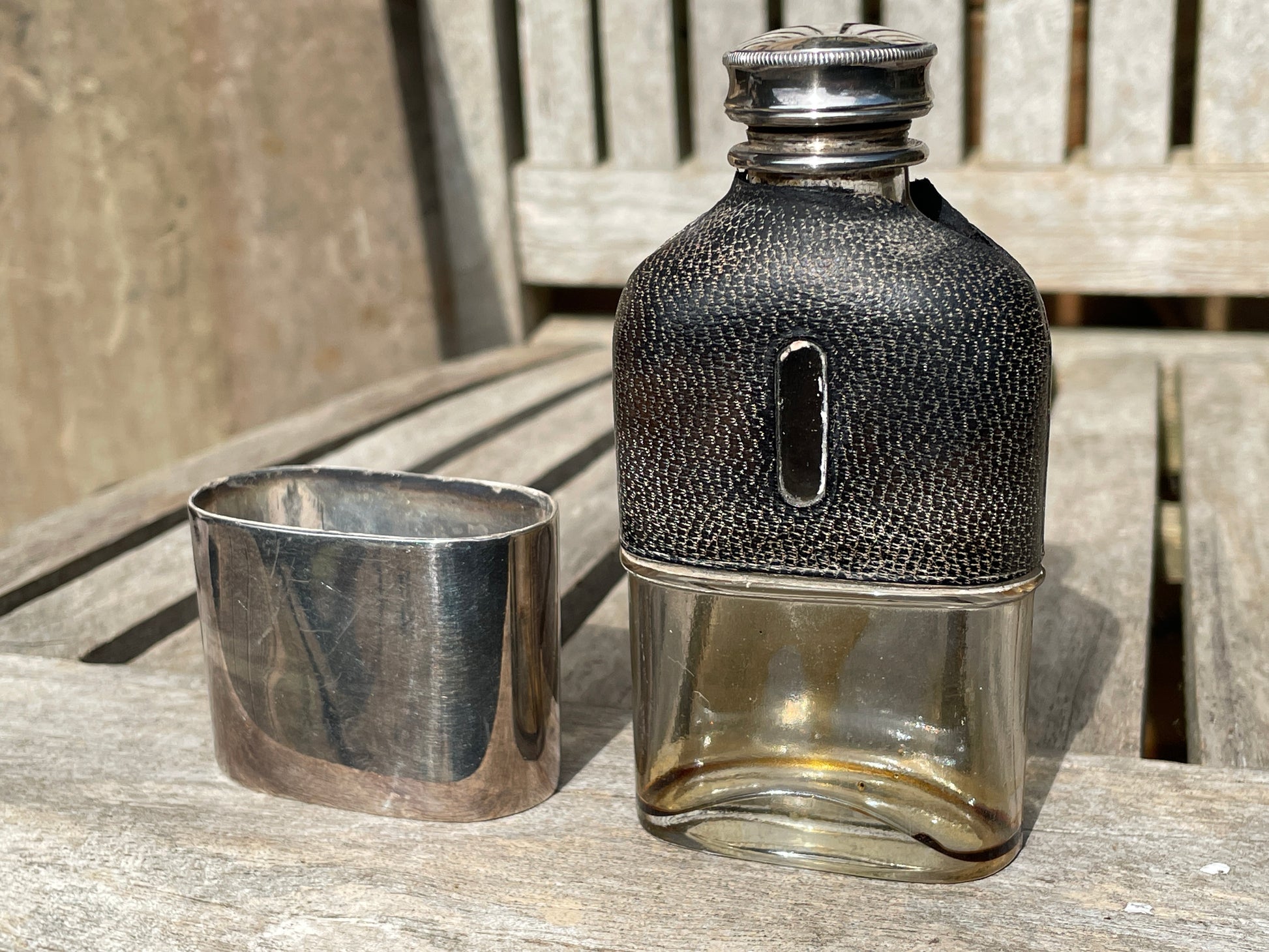 Condition: good for age, with some wear to the leather covering and expected signs of use to the cap and glass interior. The cup fits well, and the marks are clear.