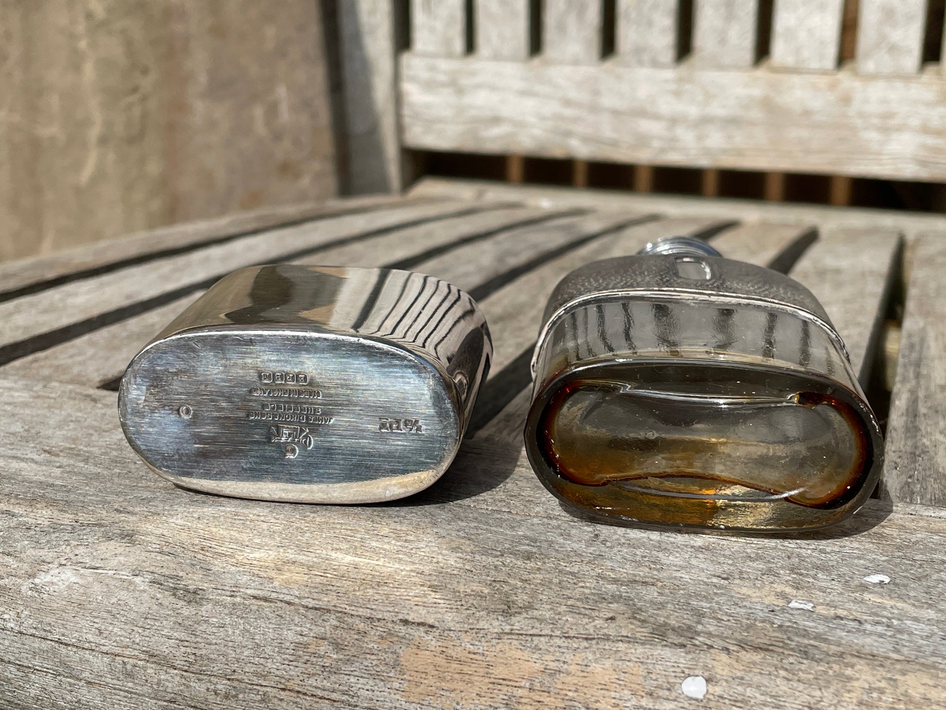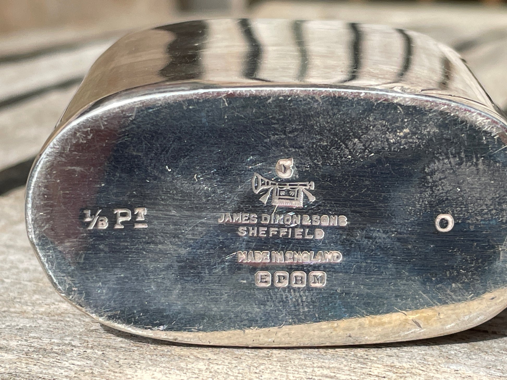 The base is stamped with the Dixon trumpet mark, EPBM, and “MADE IN ENGLAND”, the latter being a key dating feature as this designation was only introduced after 1921 for export. Earlier Victorian examples (1880s–1890s) would carry only the “England” stamp or no country mark at all. This confirms the flask as an interwar period piece rather than a late Victorian one.
