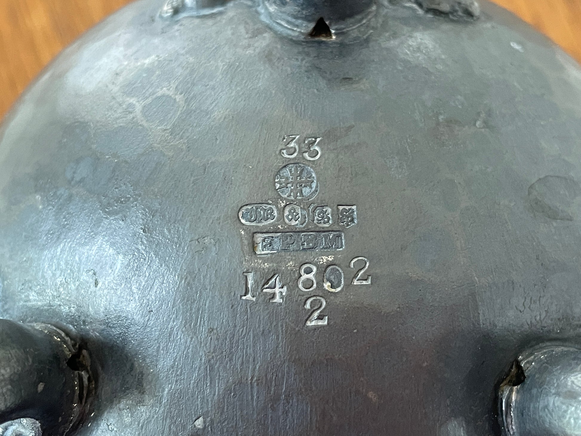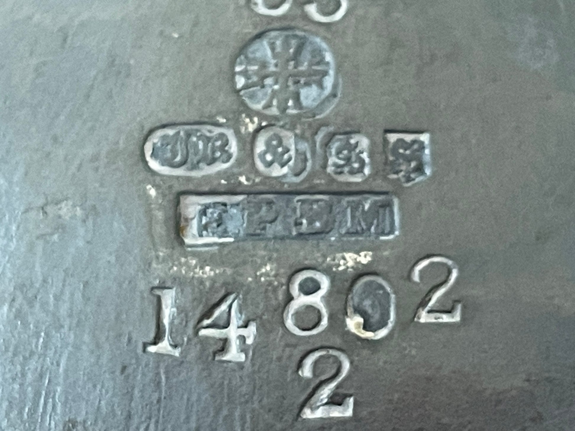 The underside is stamped with the maker’s mark JR & S, together with a cross symbol, EPBM (Electro Plated Britannia Metal), and pattern number 14802/2. The mark can appear as “JR & SS” due to the deep strike, but it correctly reads JR & S for John Round & Son Ltd, a respected Sheffield silversmith and metalware manufacturer of the late 19th and early 20th centuries.