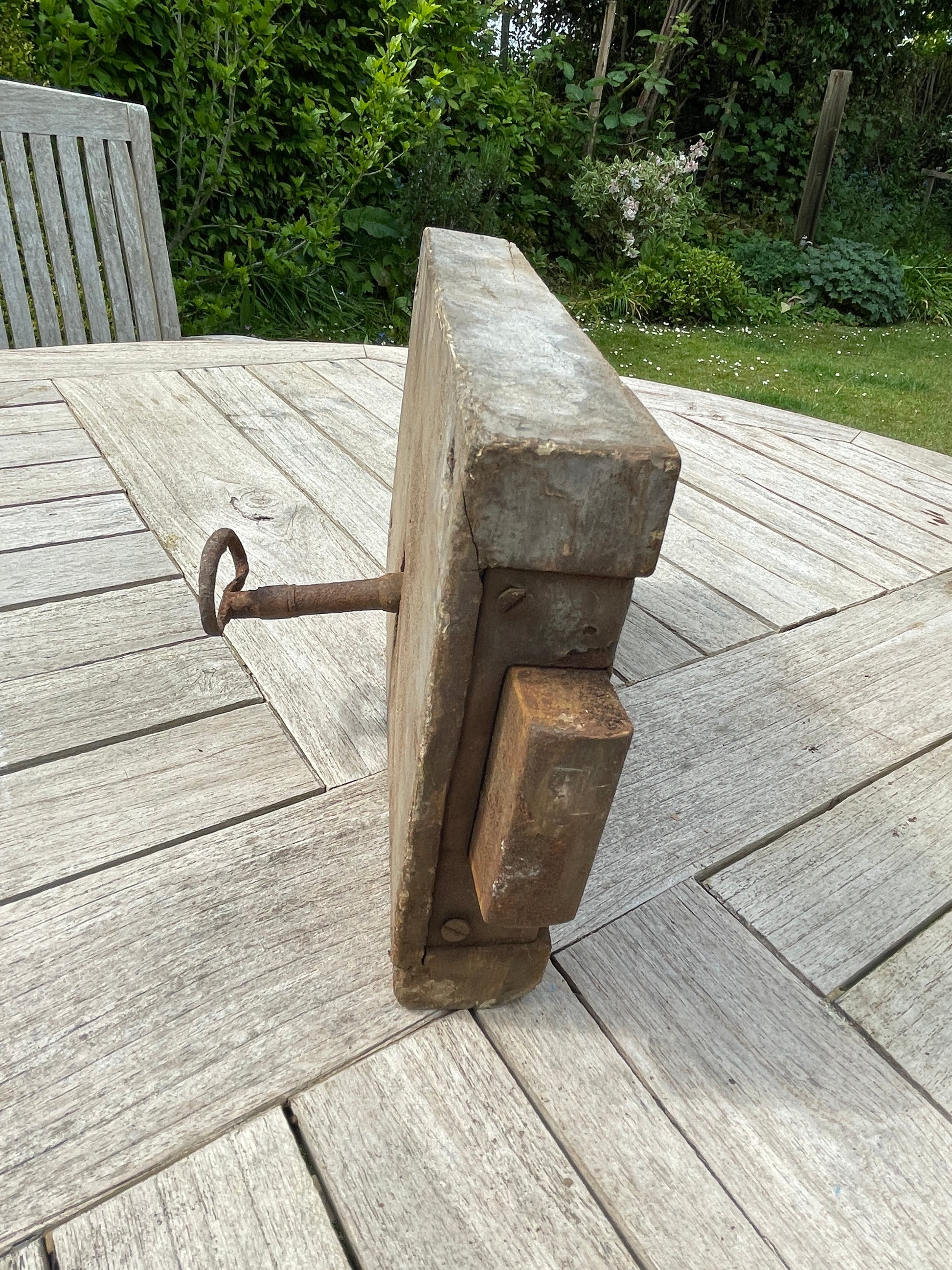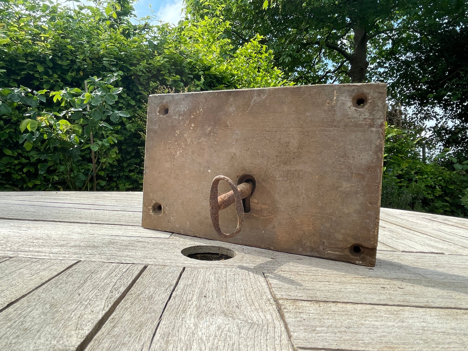 Antique Rim Lock from Church – Vintage Metal Construction with Hardwood Framing – Original Key & Working Mechanism
