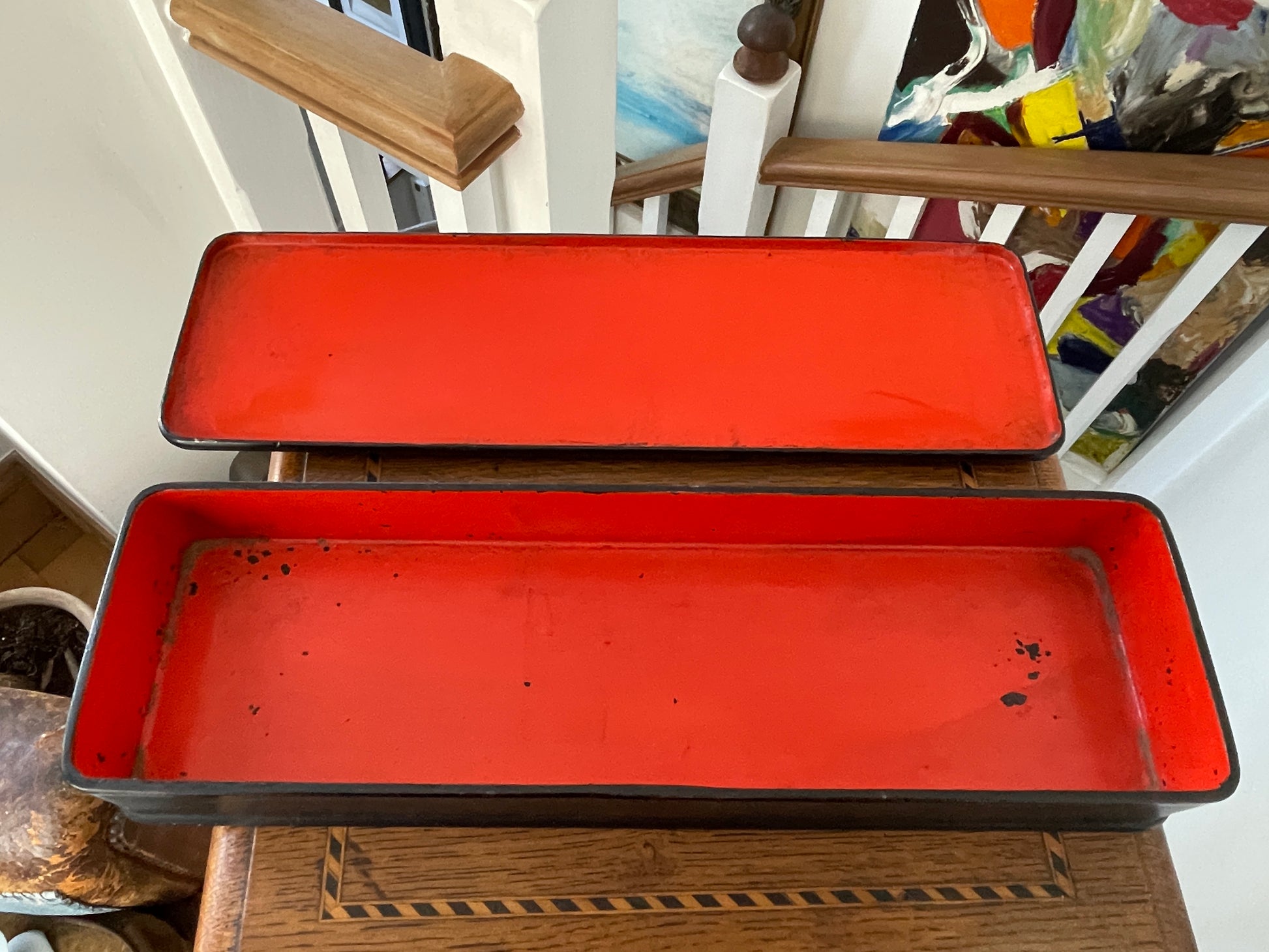The long, gently domed lid lifts to reveal a vivid orange-red lacquer interior, creating a dramatic contrast with the dark exterior. Measuring 30.5cm, the box is perfectly sized for storing artist’s brushes, writing tools, knitting notions, jewellery or keepsakes. The softly rounded edges and smooth lacquer finish give it a refined, tactile quality.