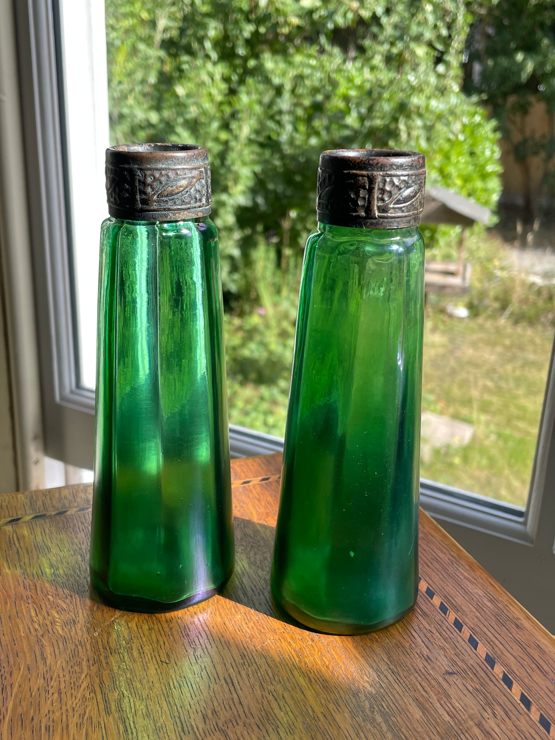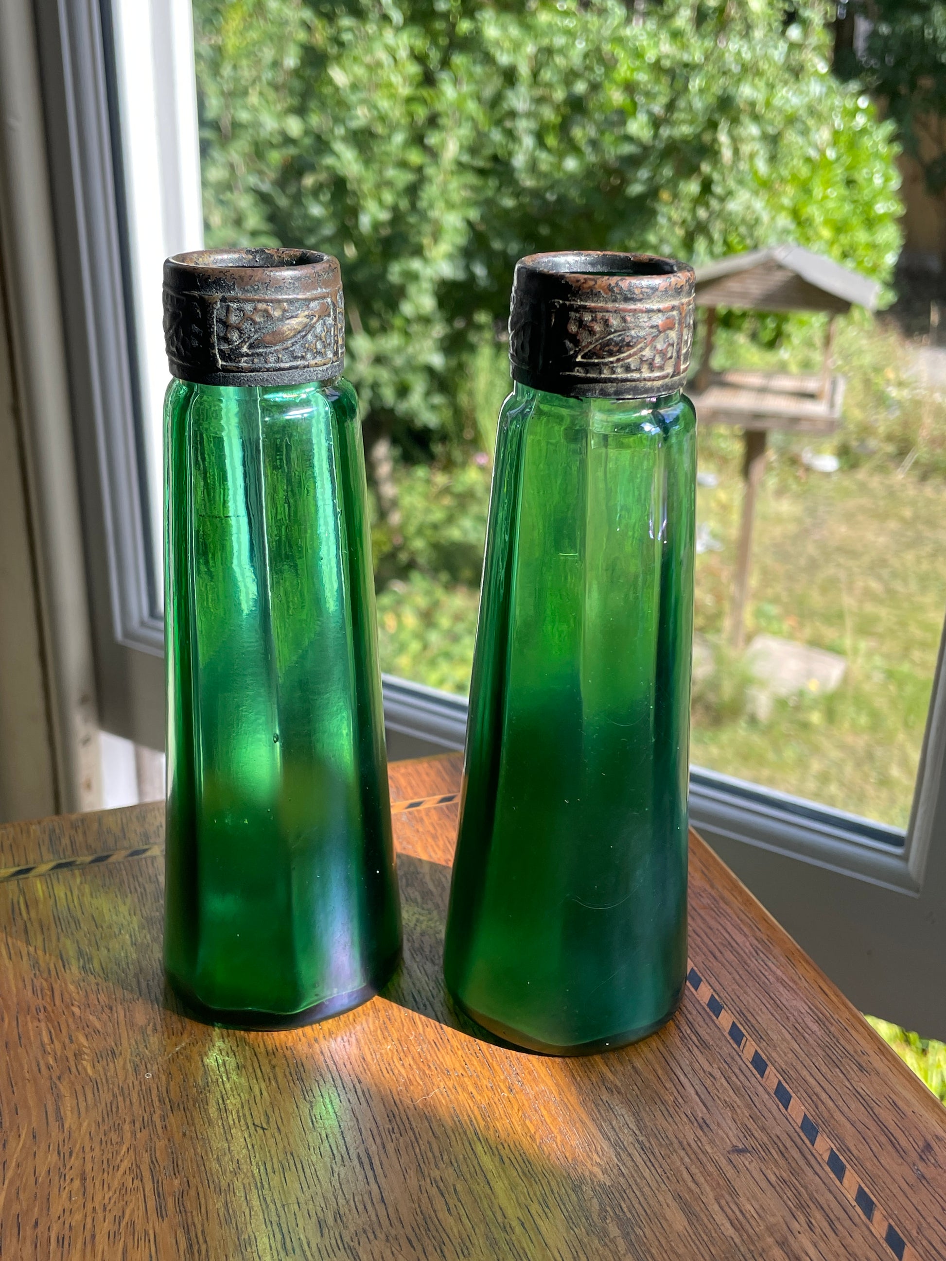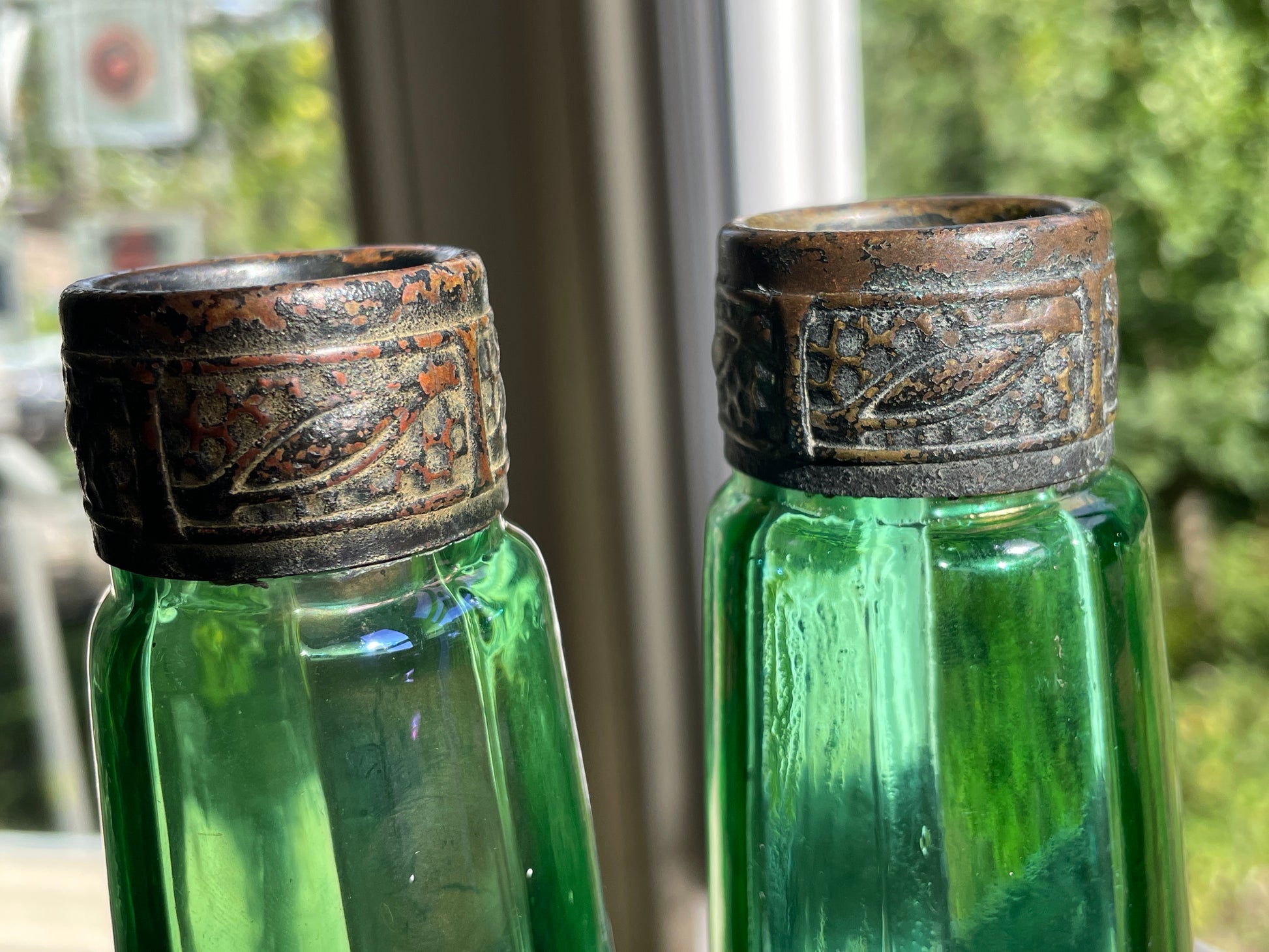 Each bottle has a faceted, ribbed body in vibrant emerald green with a subtle iridescent surface developed over time. The necks are fitted with embossed bronze/brass mounts, decorated with a repeating foliate pattern, now richly patinated with age.
