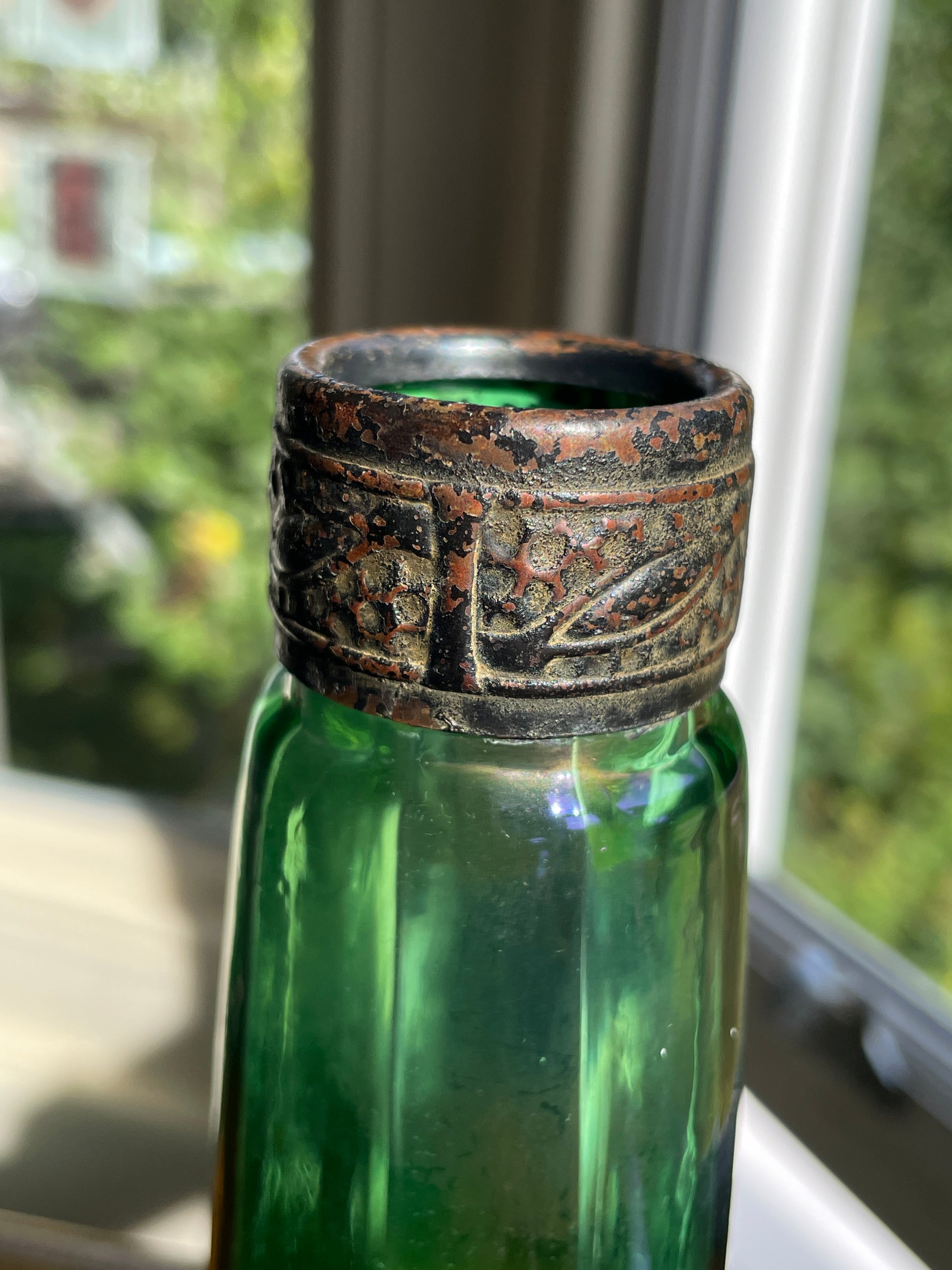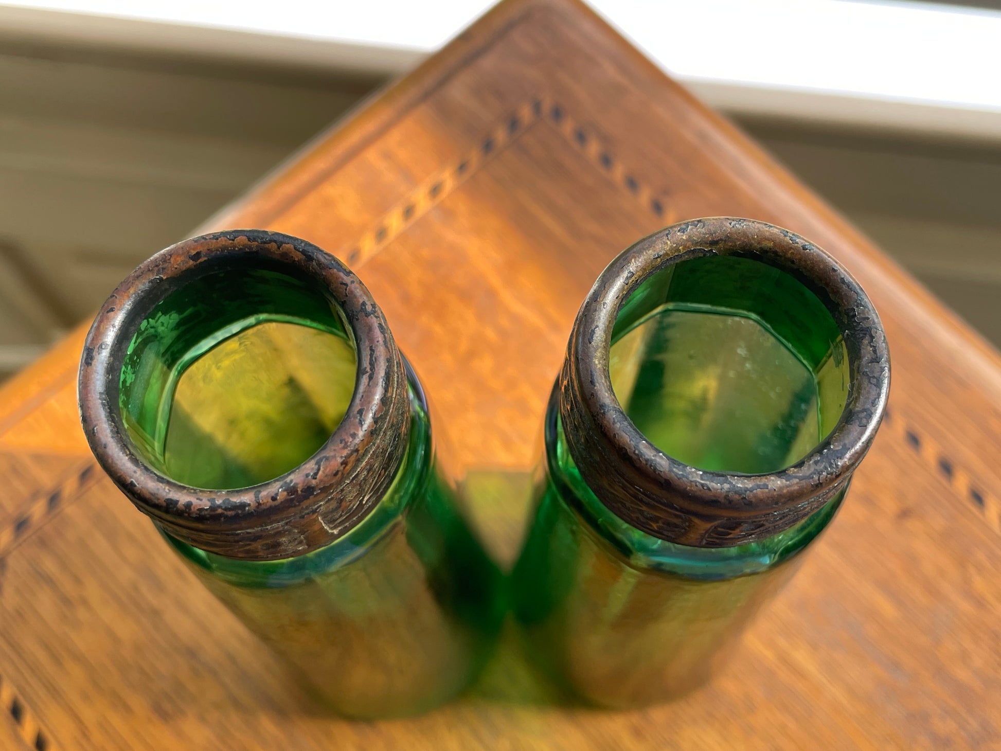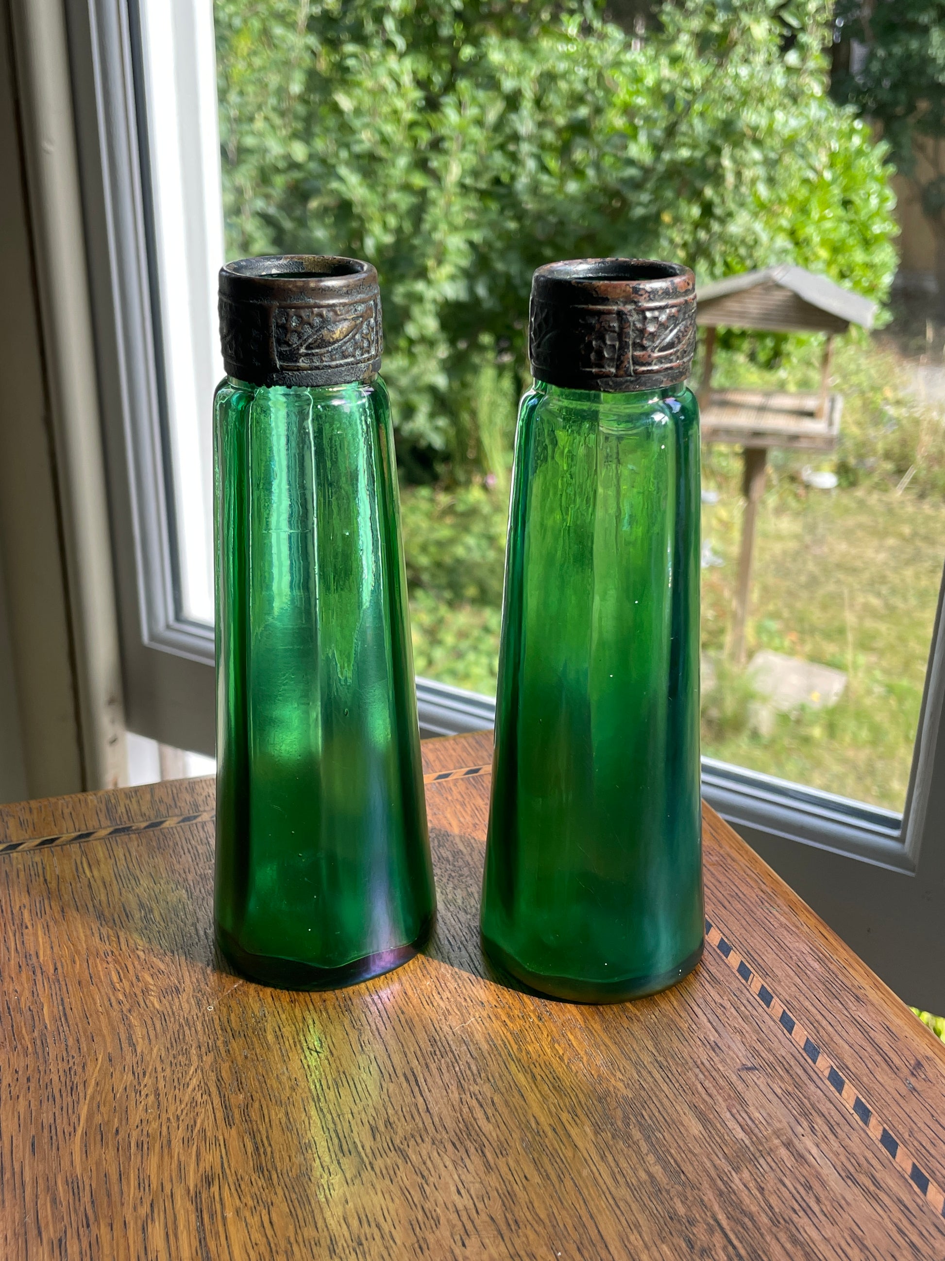 Each bottle has a faceted, ribbed body in vibrant emerald green with a subtle iridescent surface developed over time. The necks are fitted with embossed bronze/brass mounts, decorated with a repeating foliate pattern, now richly patinated with age.