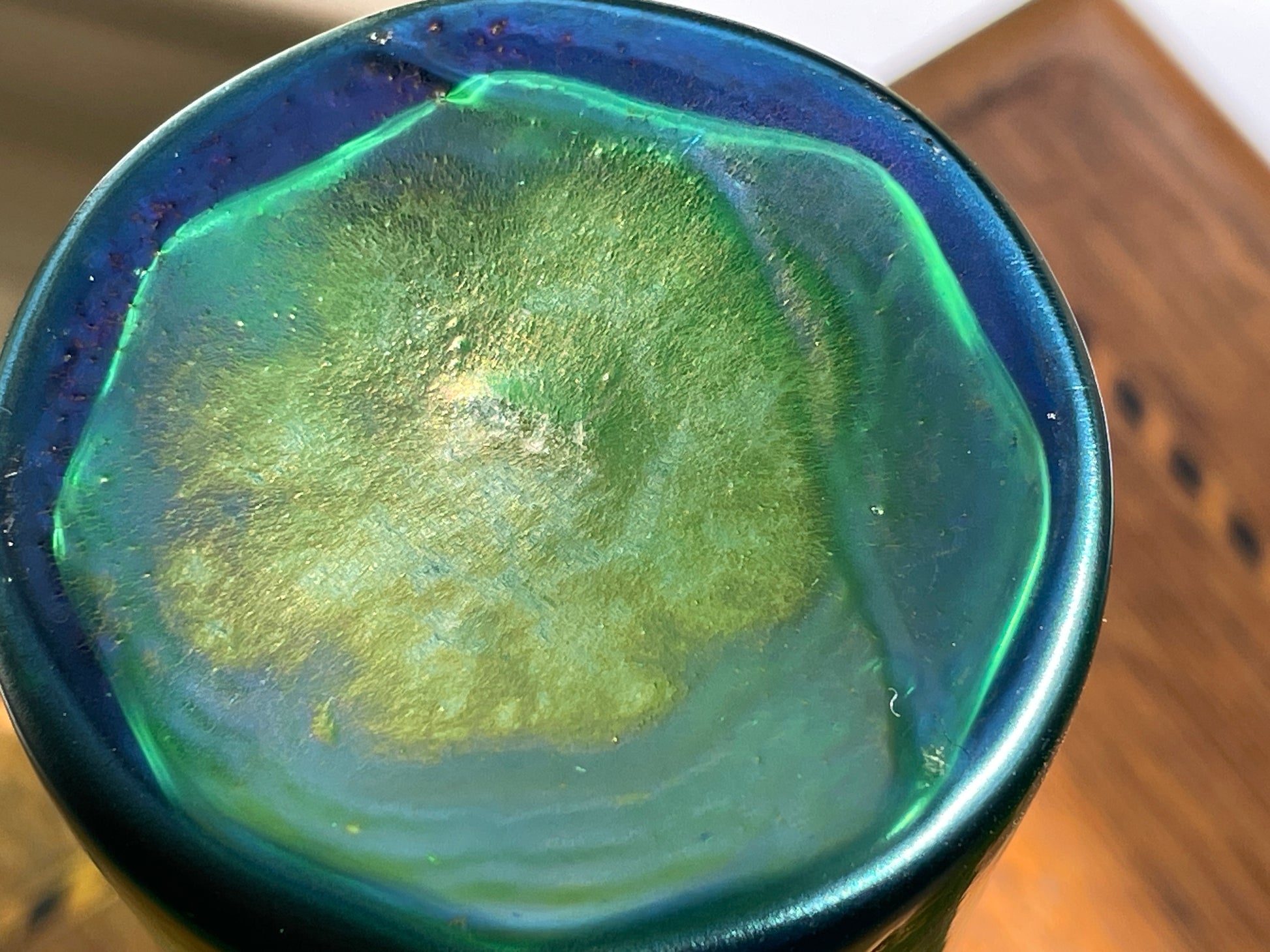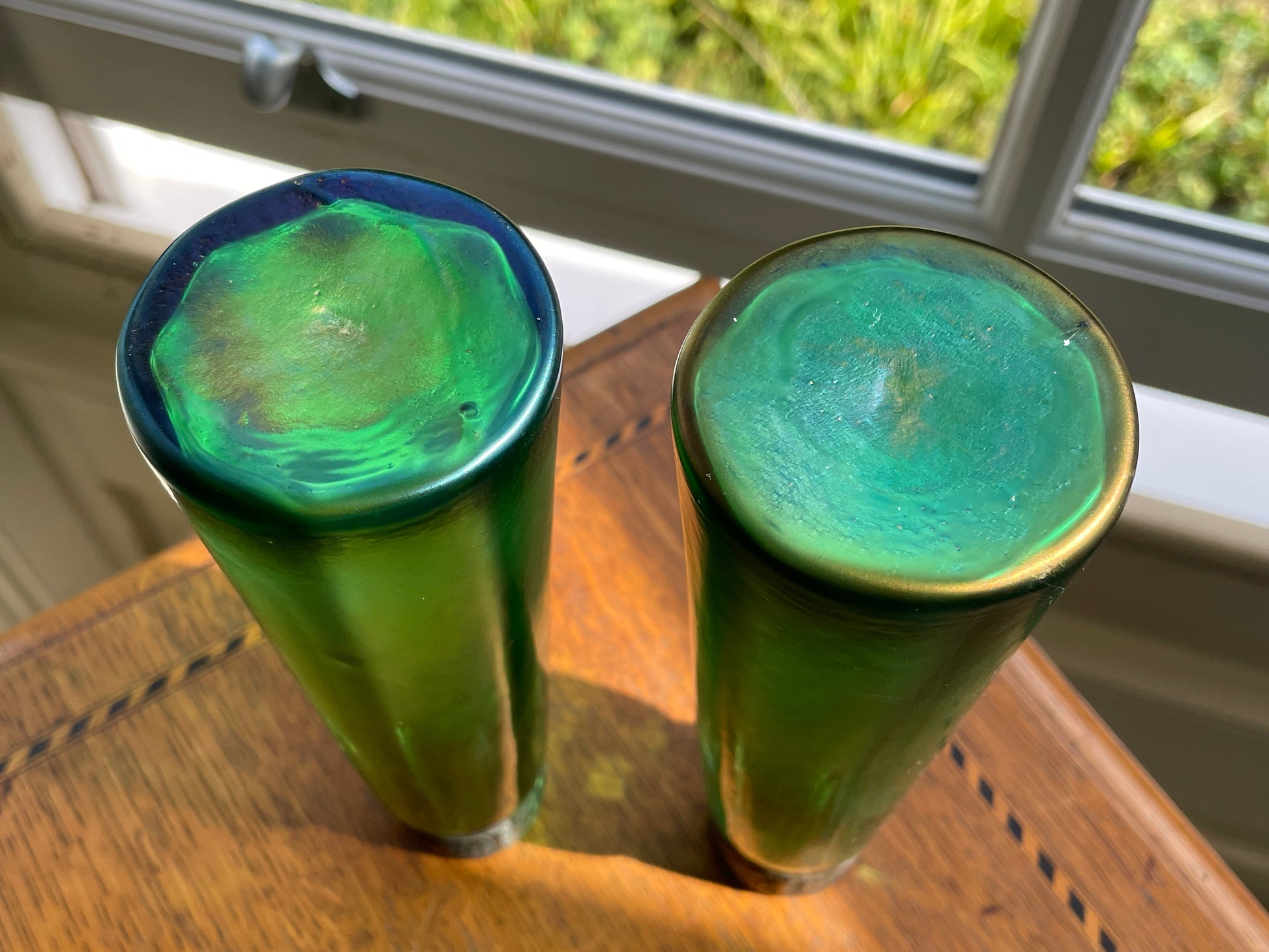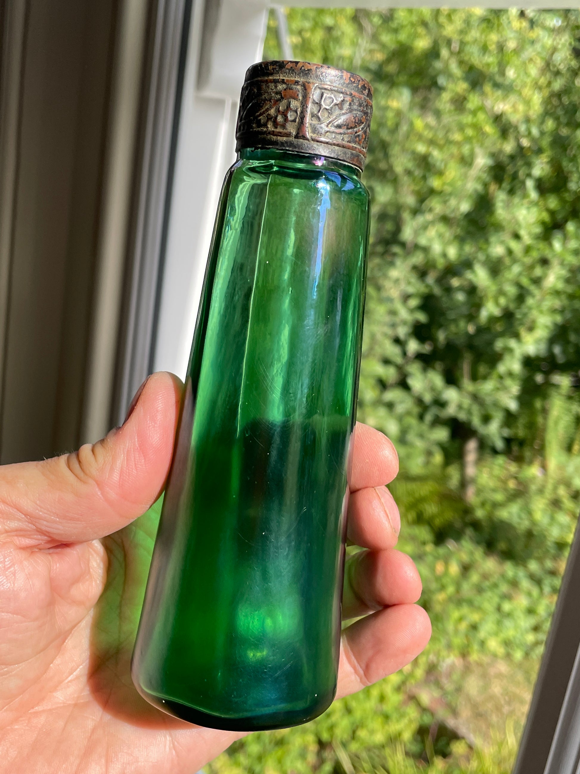 Ribbed/panelled emerald green glass with natural iridescence
