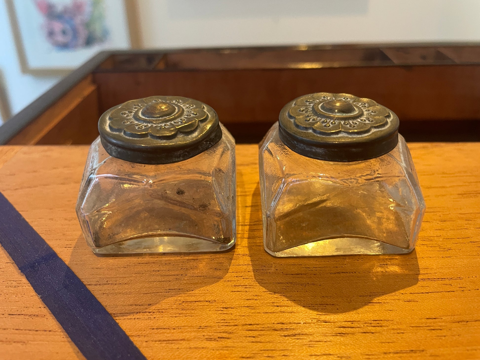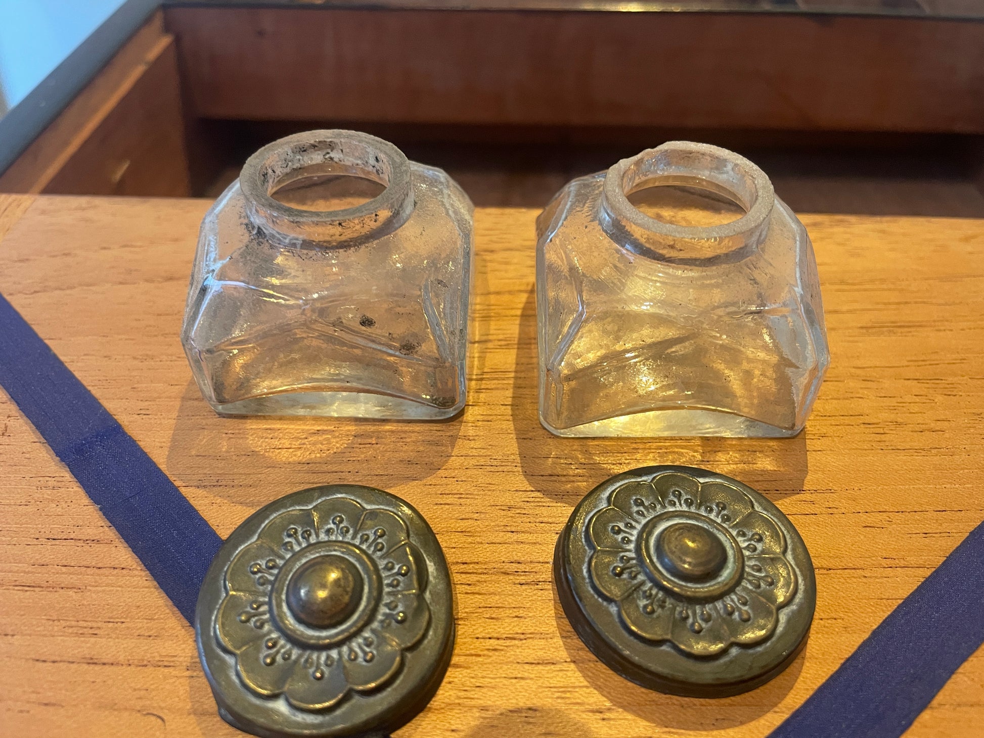 🌿 Original inkwells present; one lid sits slightly loosely. Nibbles to glass rims