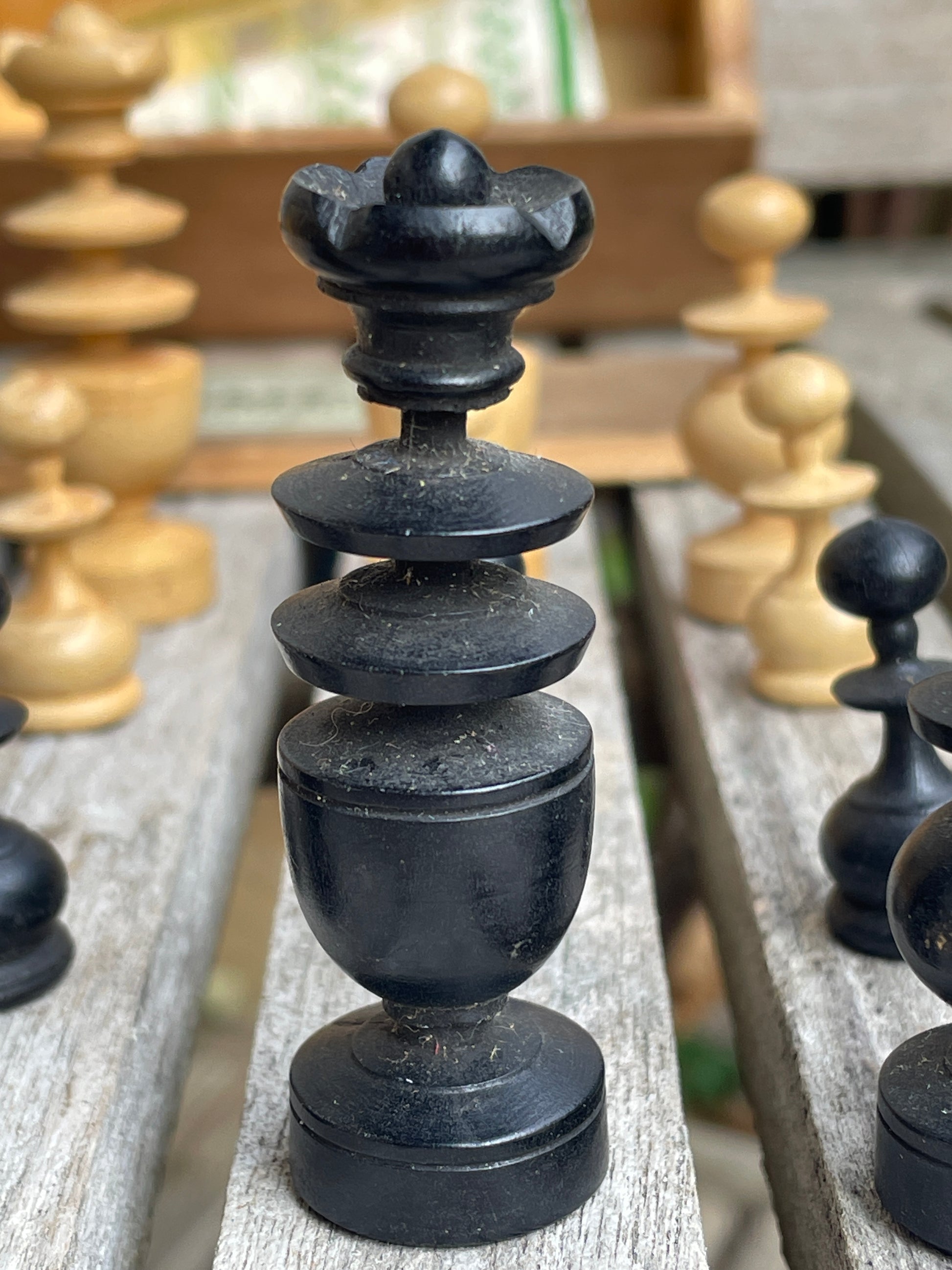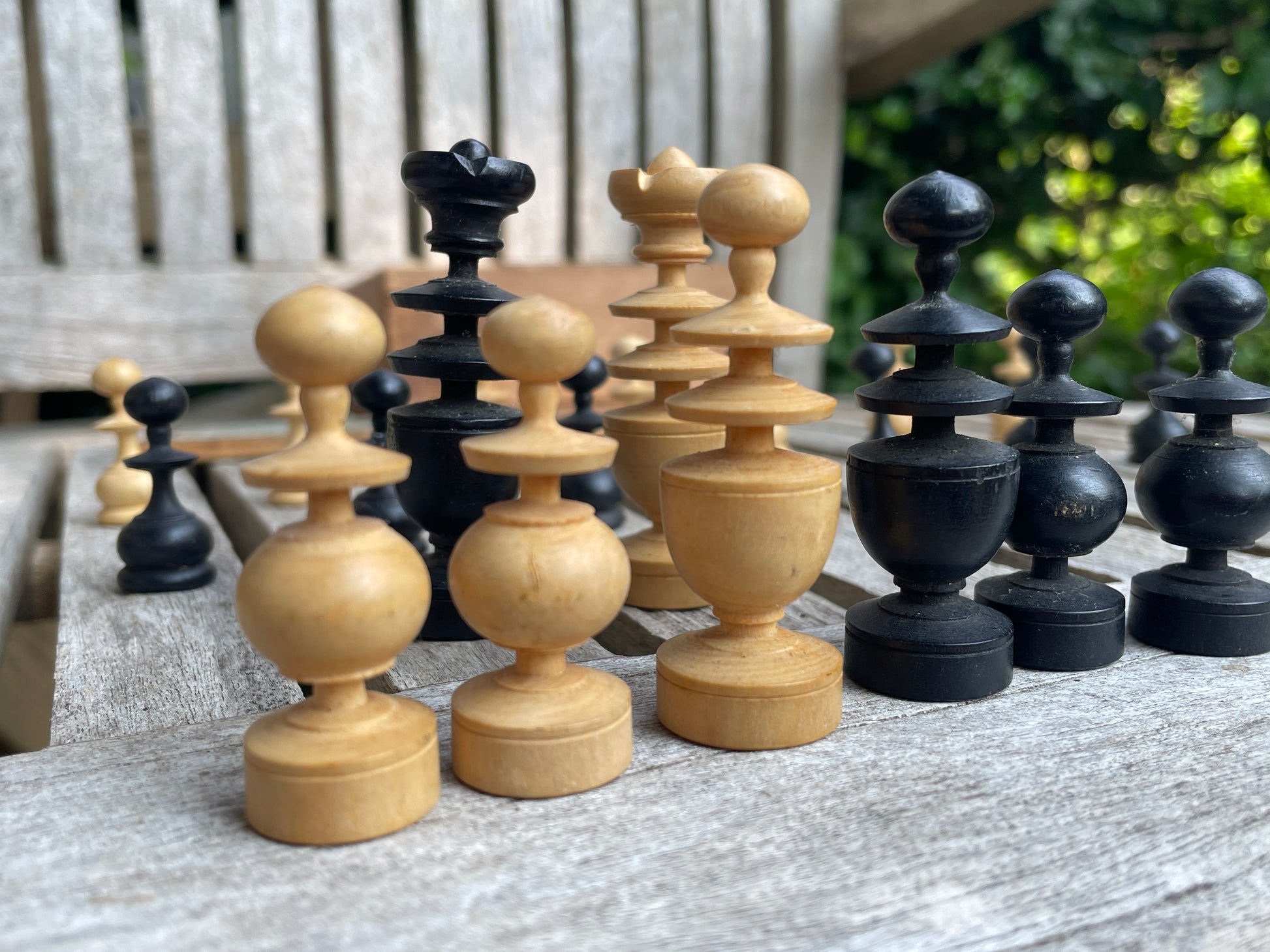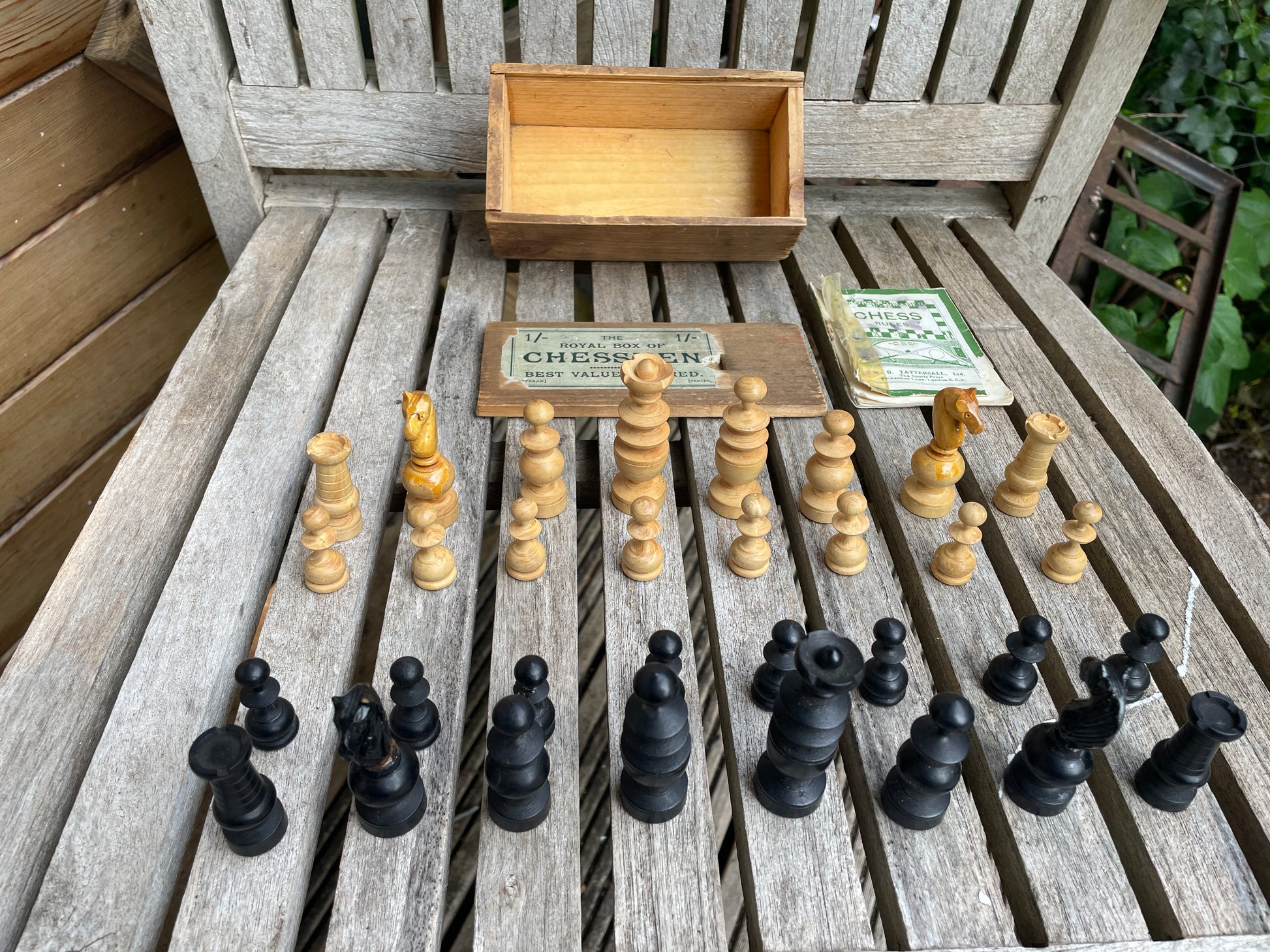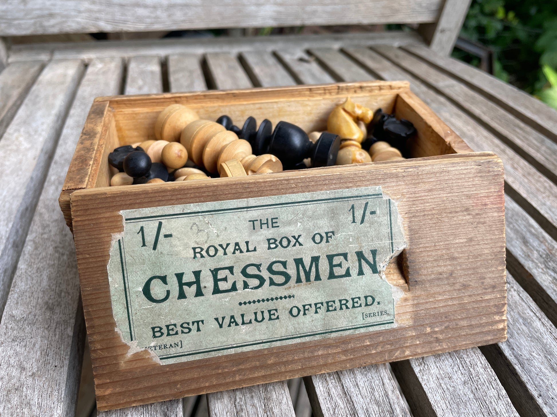 A charming and complete set of vintage turned wood chess pieces, presented in the original wooden “Royal Box of Chessmen.” Likely made in Britain c.1900–1920, this is a fine example of the Regency or Northern Upright pattern that preceded the Staunton design. Finely turned from natural and ebonised wood, the set includes all major and minor pieces with lathe-turned detail and attractive disc collars.