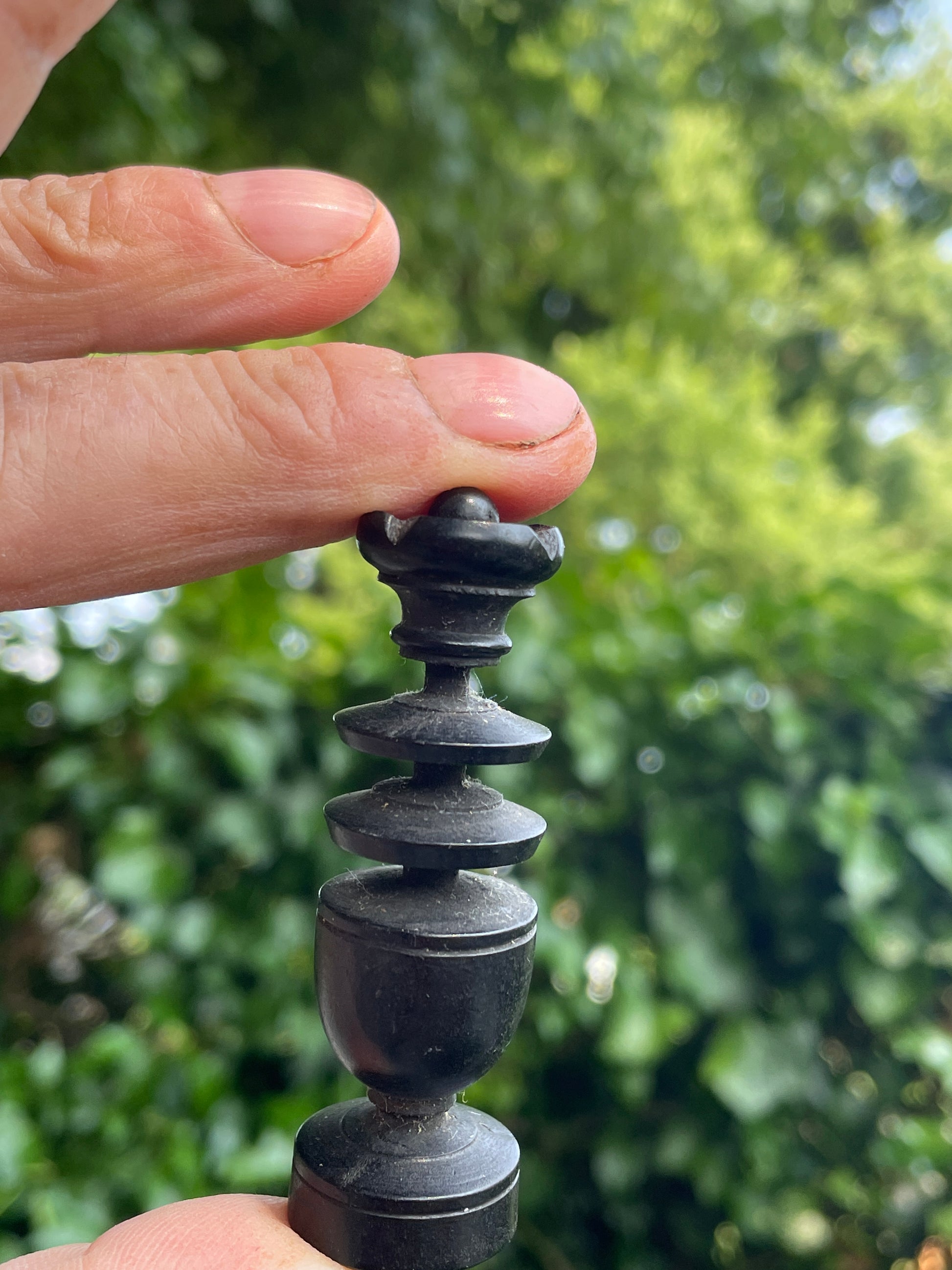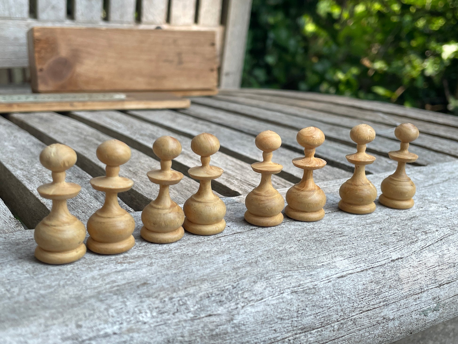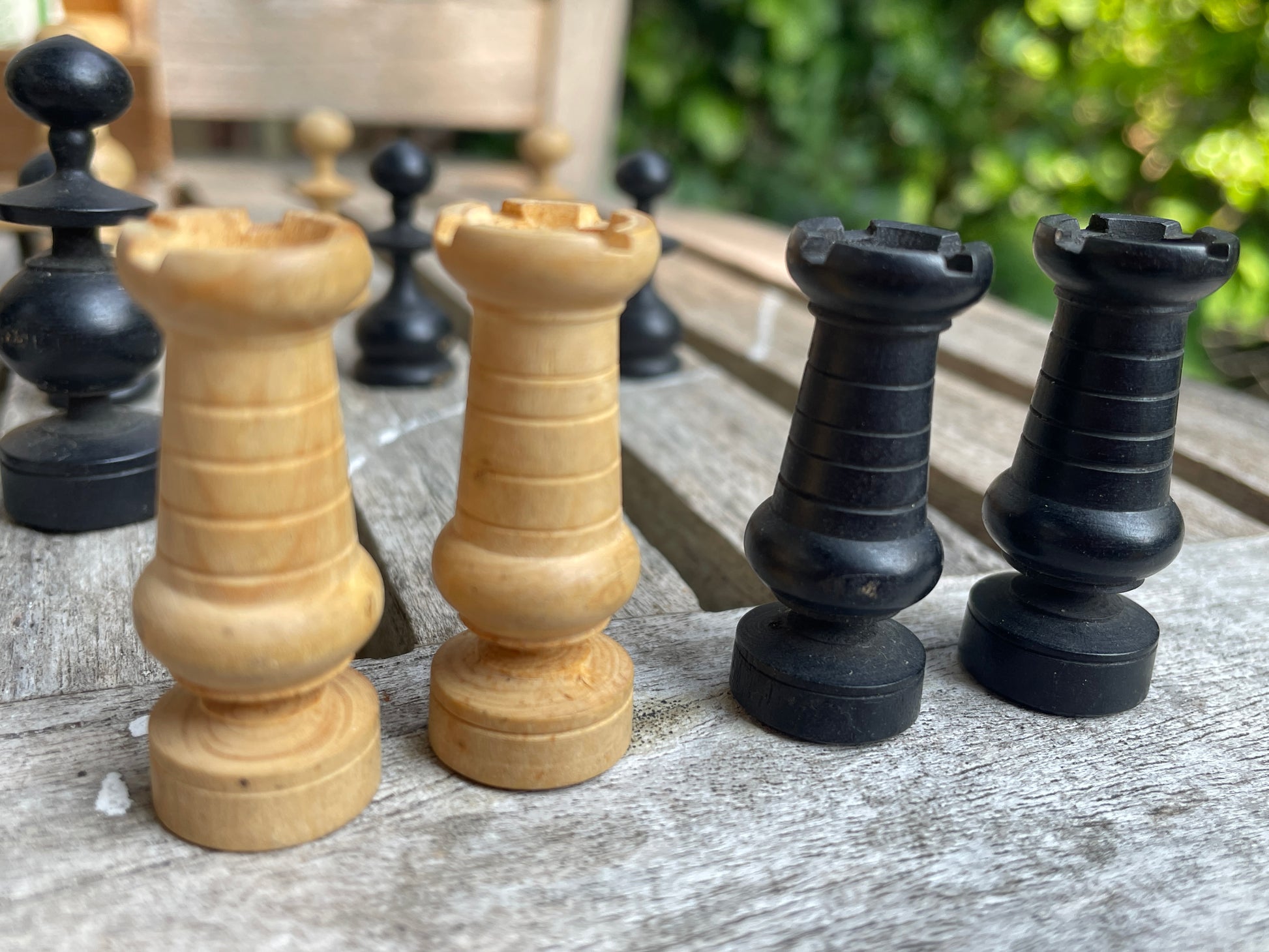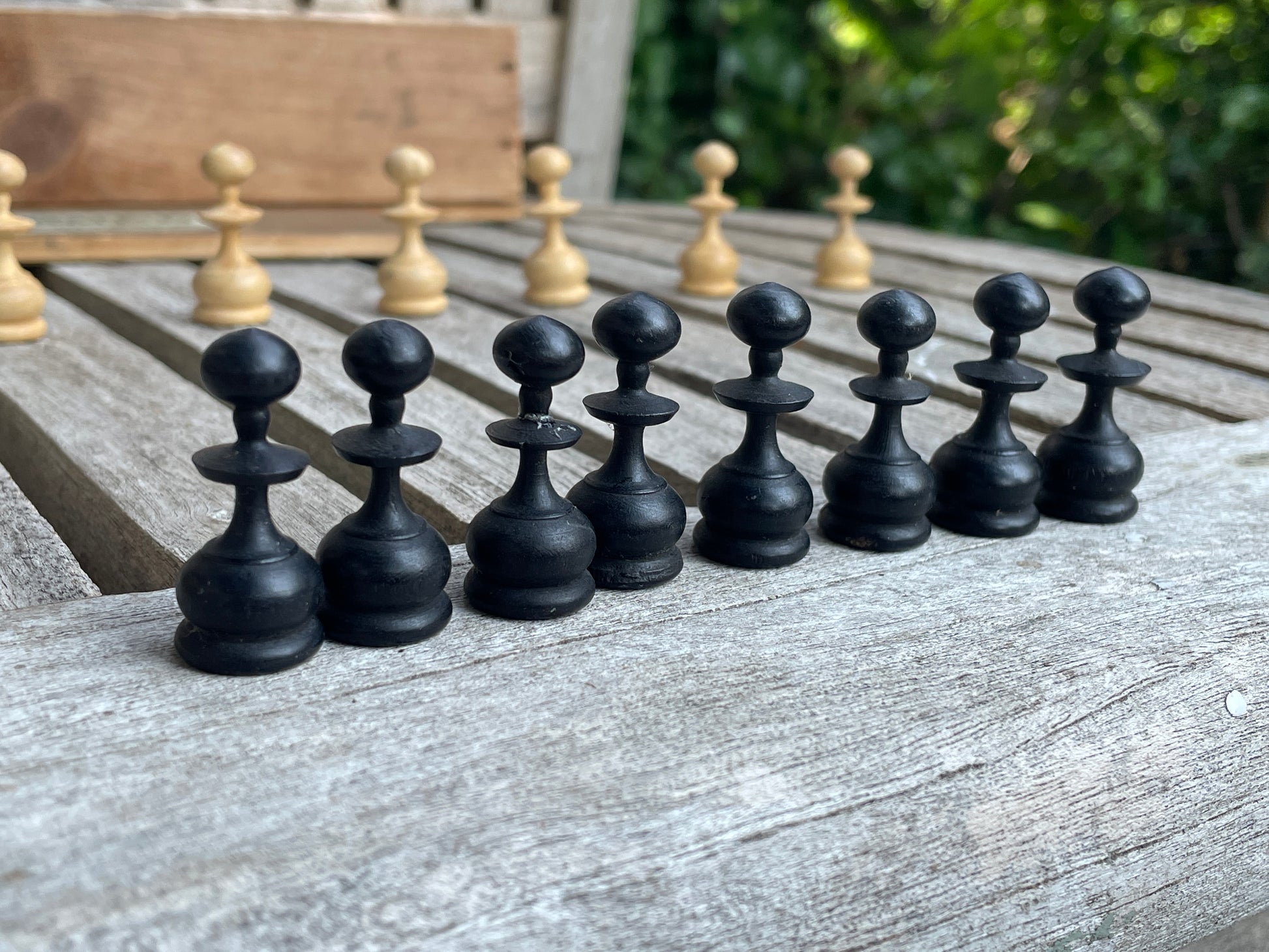 A charming and complete set of vintage turned wood chess pieces, presented in the original wooden “Royal Box of Chessmen.” Likely made in Britain c.1900–1920, this is a fine example of the Regency or Northern Upright pattern that preceded the Staunton design. Finely turned from natural and ebonised wood, the set includes all major and minor pieces with lathe-turned detail and attractive disc collars.