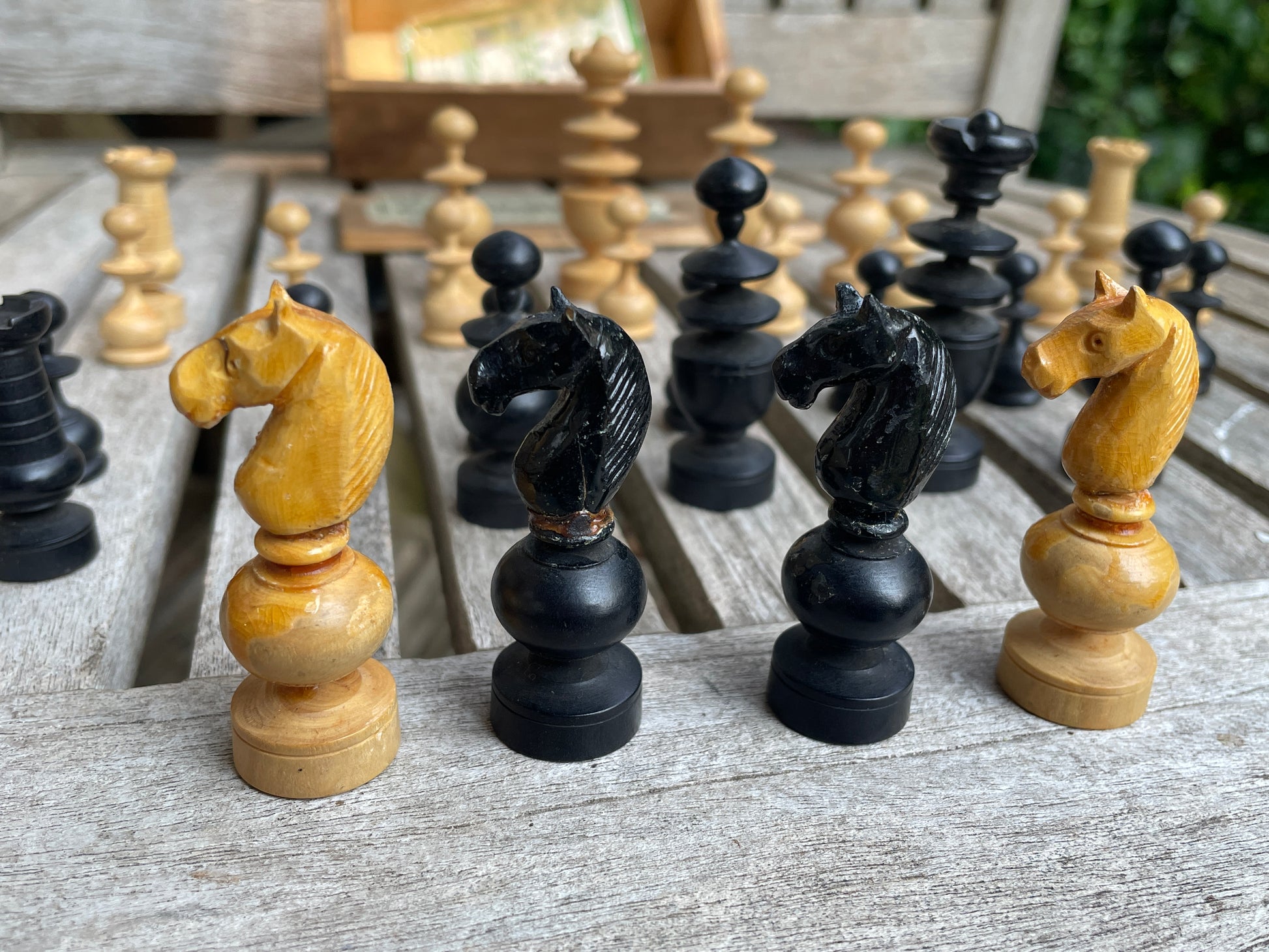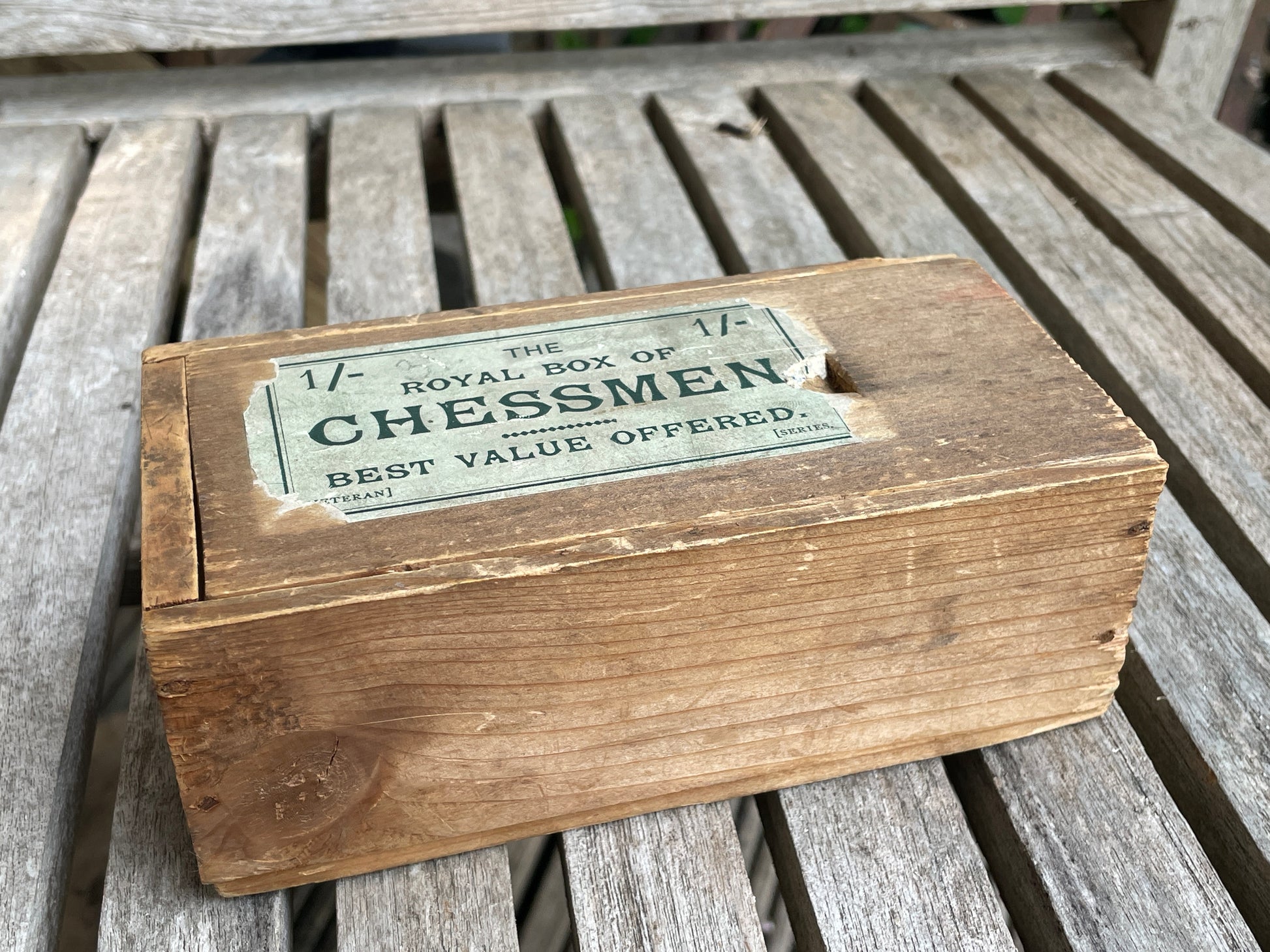The knights are particularly characterful with hand-carved features. The king stands approximately 6cm tall. Includes the original wooden slide-lid box with surviving printed label to front.