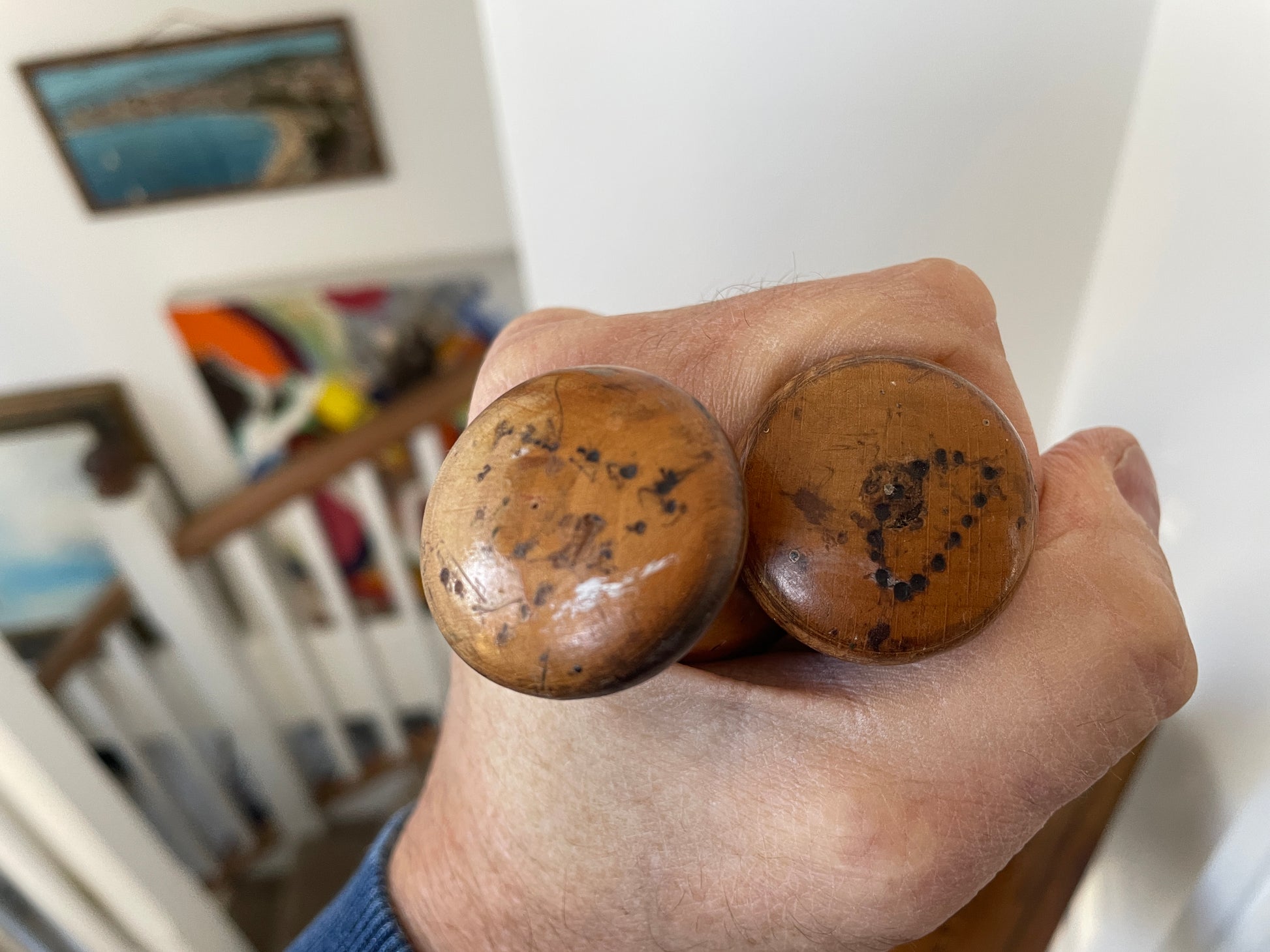The wood has developed a warm golden tone with a rich, tactile patina. Areas of historic surface wear, small knocks and handling marks all contribute to their authentic, well-used look. Despite their original functional purpose, Indian clubs are now highly sought after as sculptural decorative objects—excellent for display in home gyms, studios and vintage interiors.