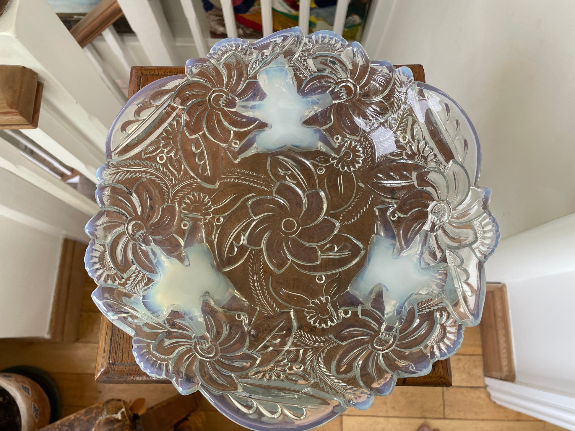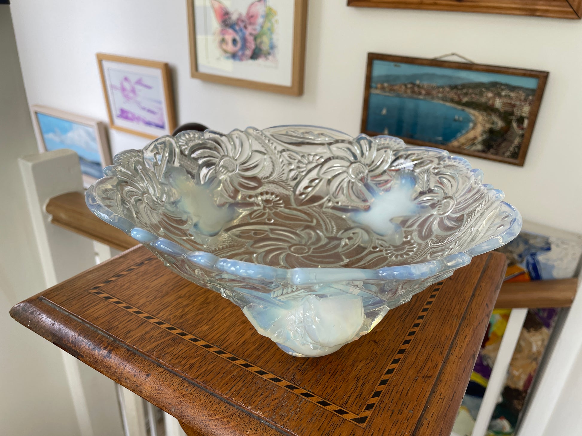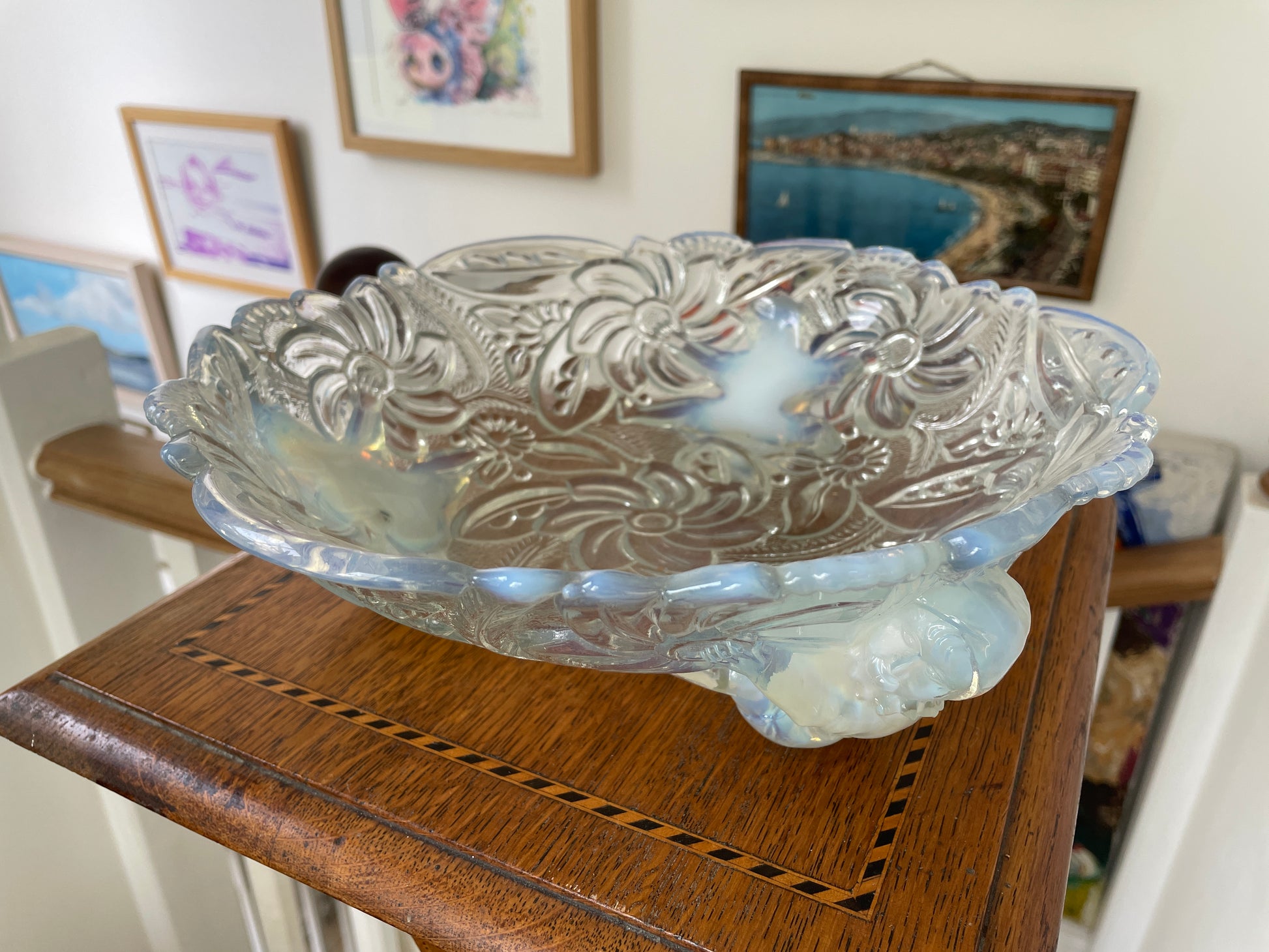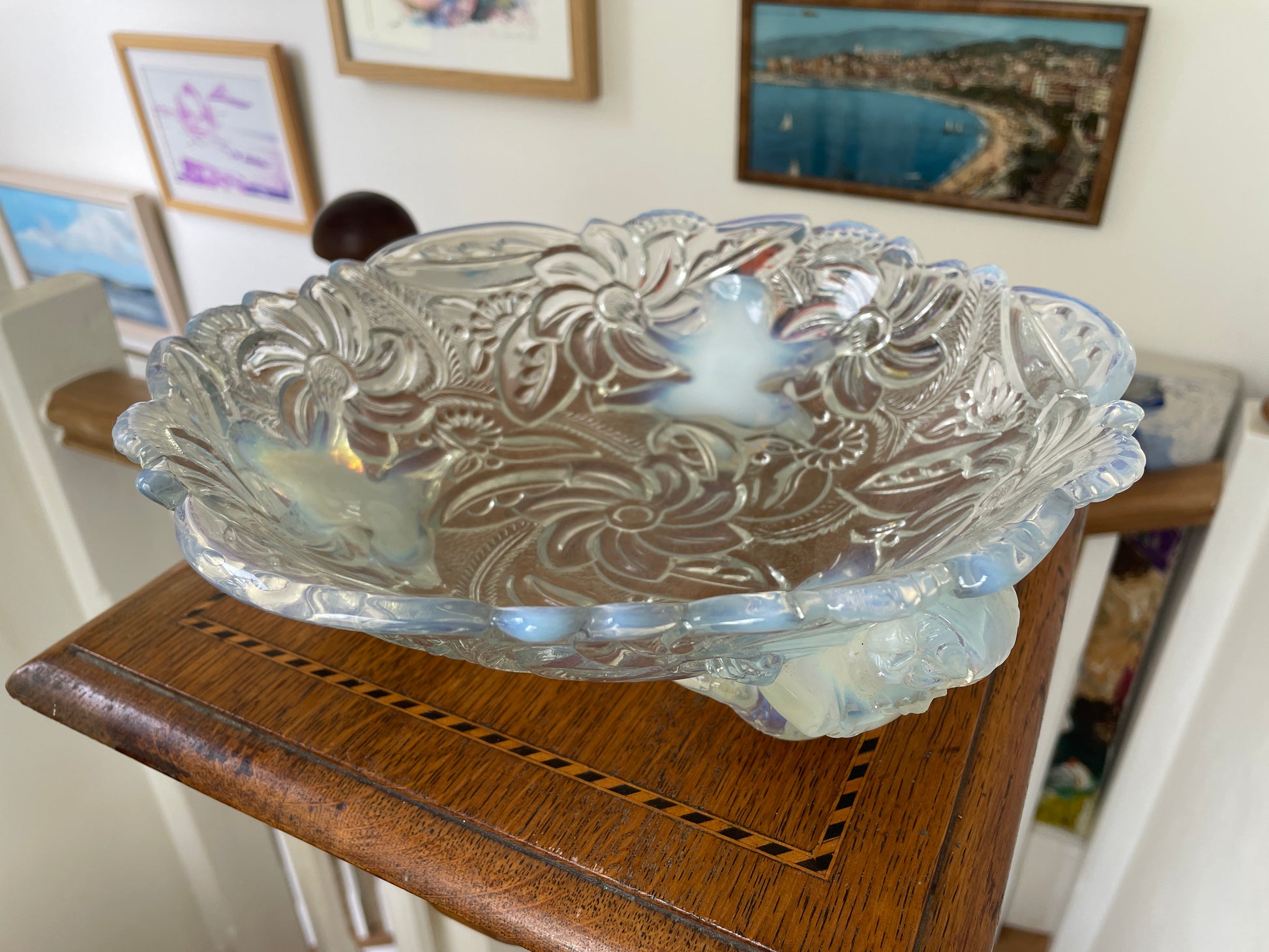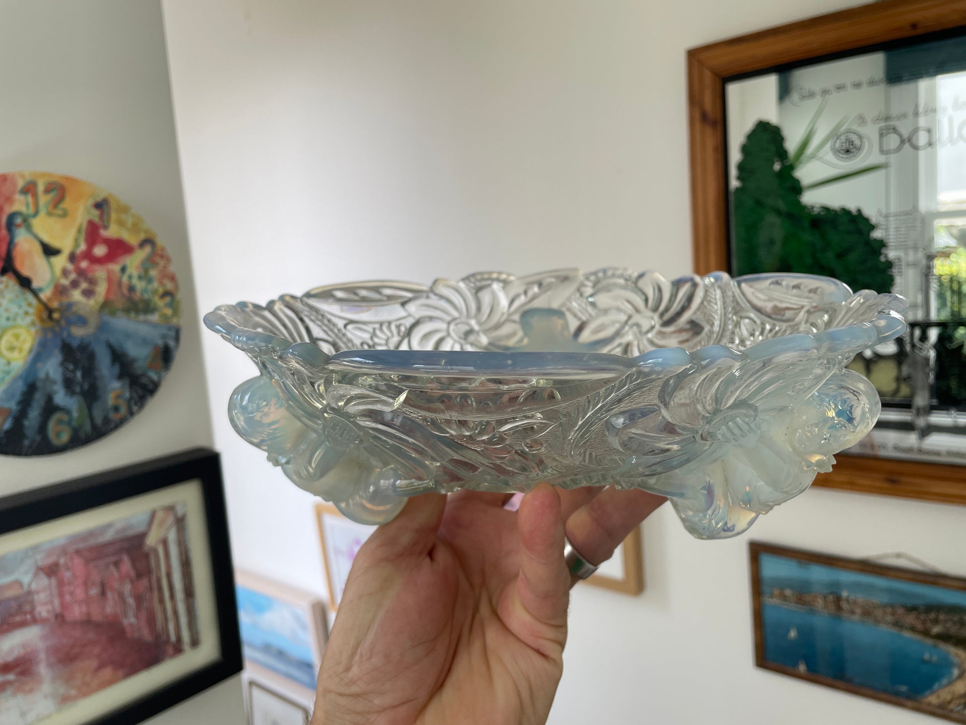 The glass displays the distinctive blue–white fire opal effect typical of Reich’s work, catching the light beautifully with iridescent tones. With its sculptural form and playful yet elegant design, this bowl reflects the finest qualities of Czech Art Deco glass production and is often compared to French contemporaries such as Lalique and Sabino.