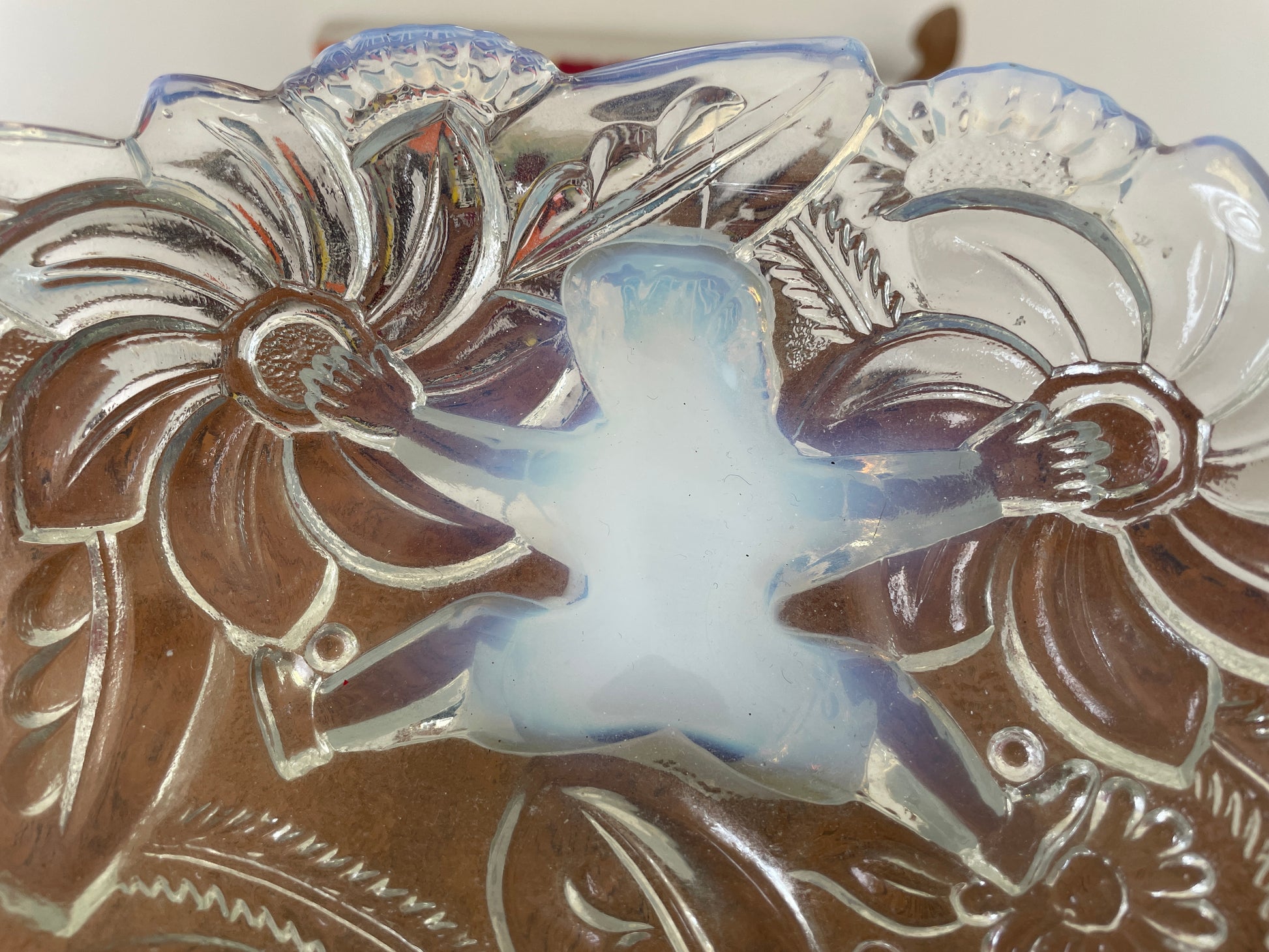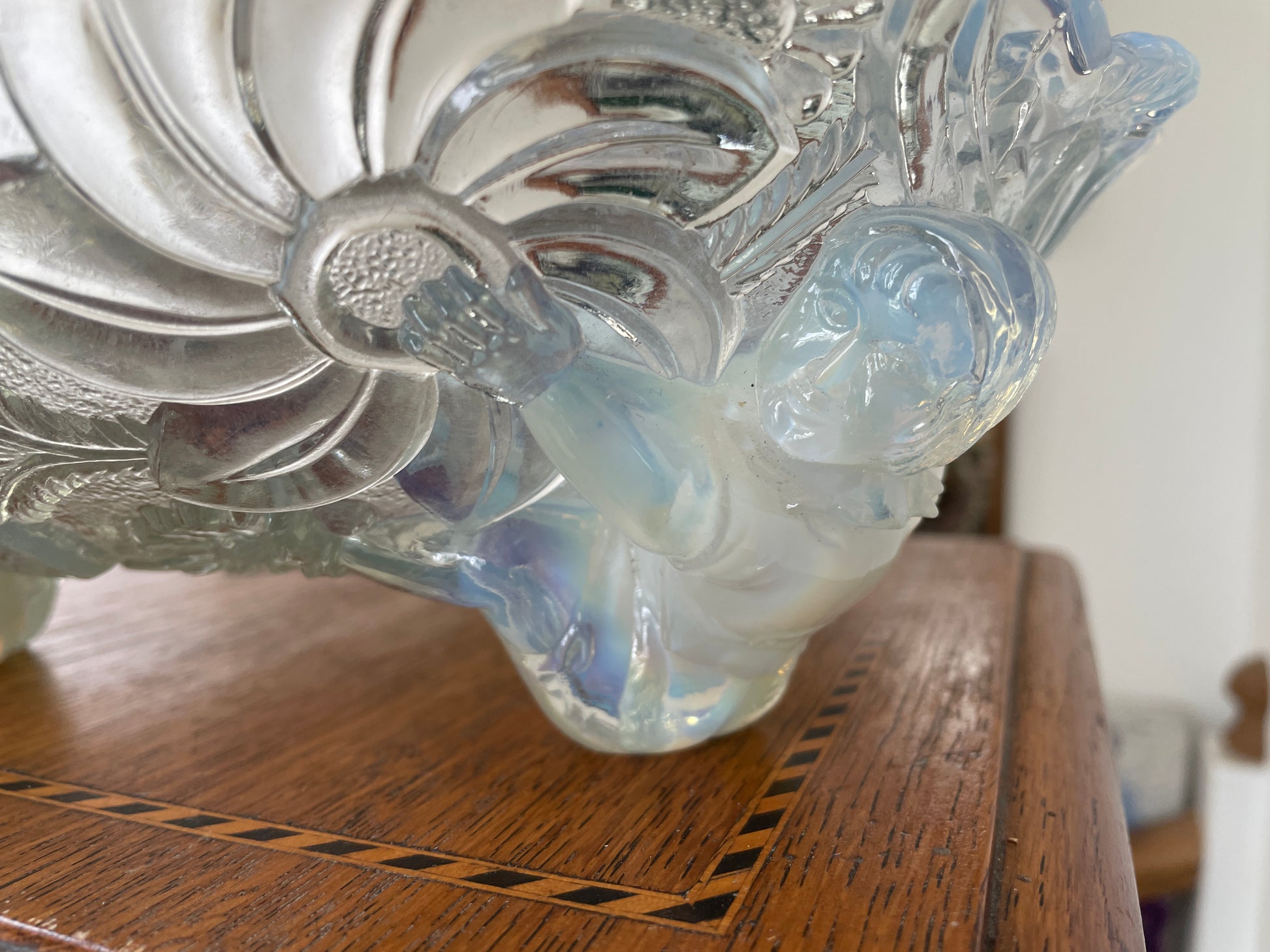 A very stand out piece of Art Deco opalescent glass attributed to Samuel Reich & Co., Czechoslovakia, circa 1930s. This highly decorative piece features three charming elf figures moulded in relief, forming the supports of the bowl, surrounded by stylised floral decoration in pressed opalescent glass.