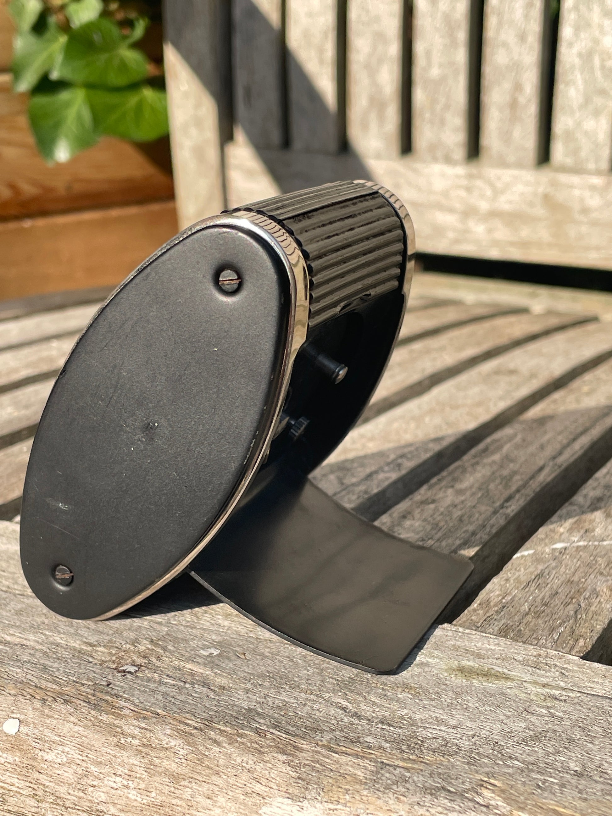 Very stylish Travel Alarm, black and silver in colour. The black coloured tambour slides over the clock face for protection when traveling, see image of it half closed.
