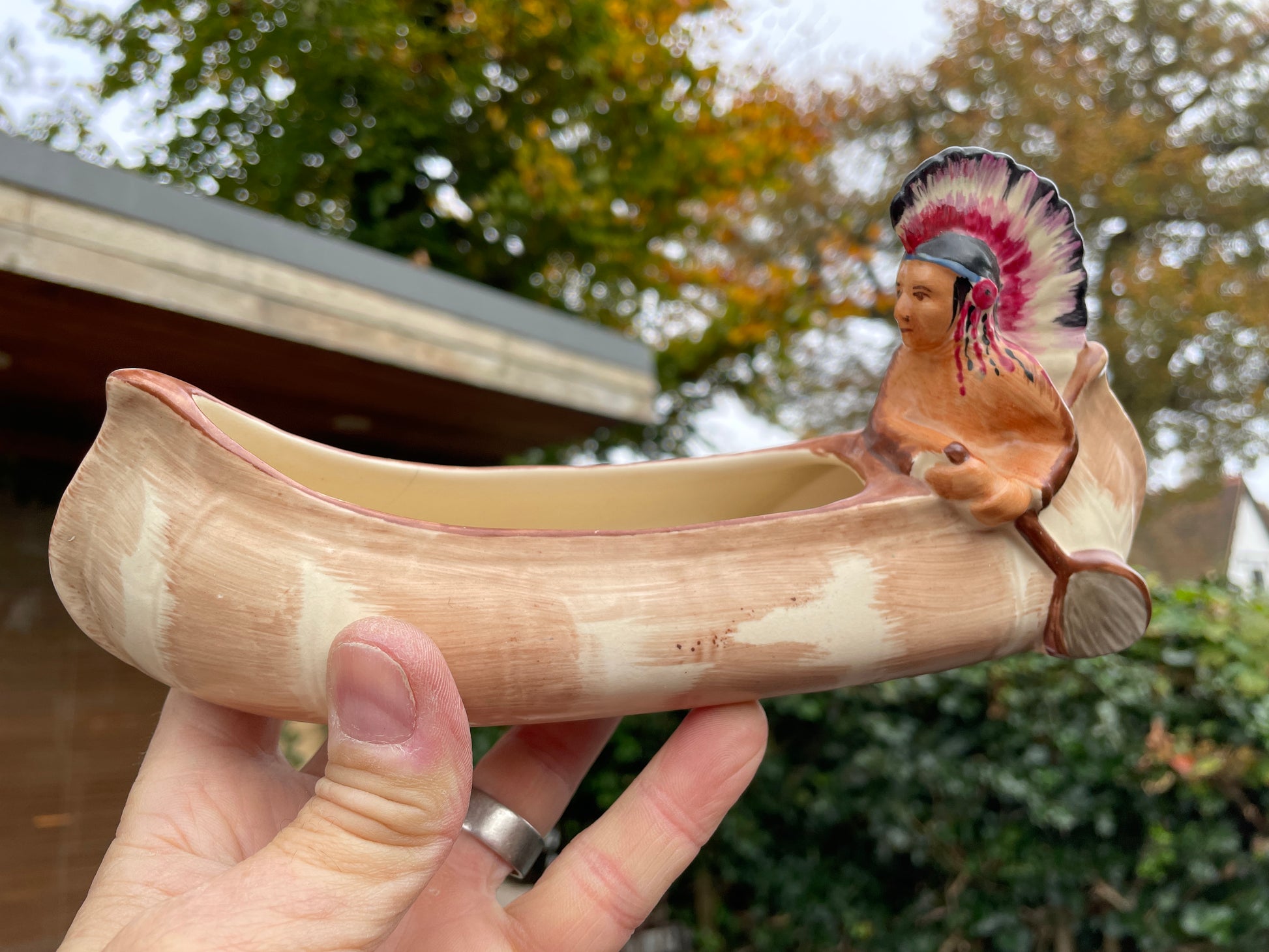 Burleigh Ware vintage Deco 1930's native American Indian in a canoe 22cm long