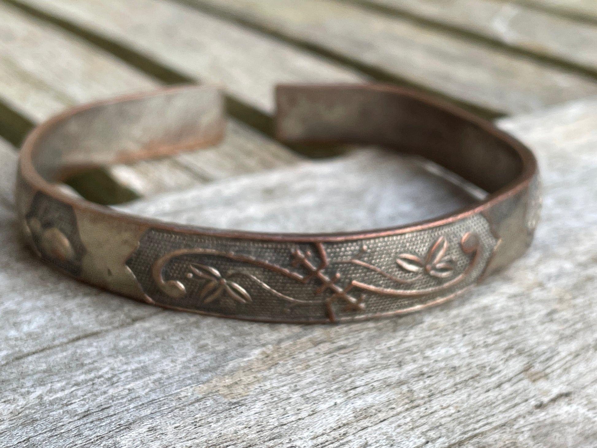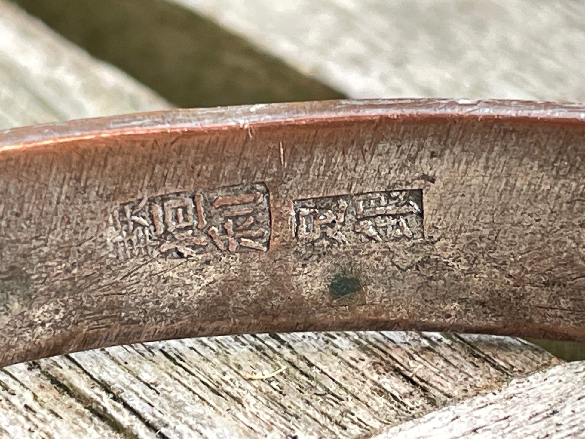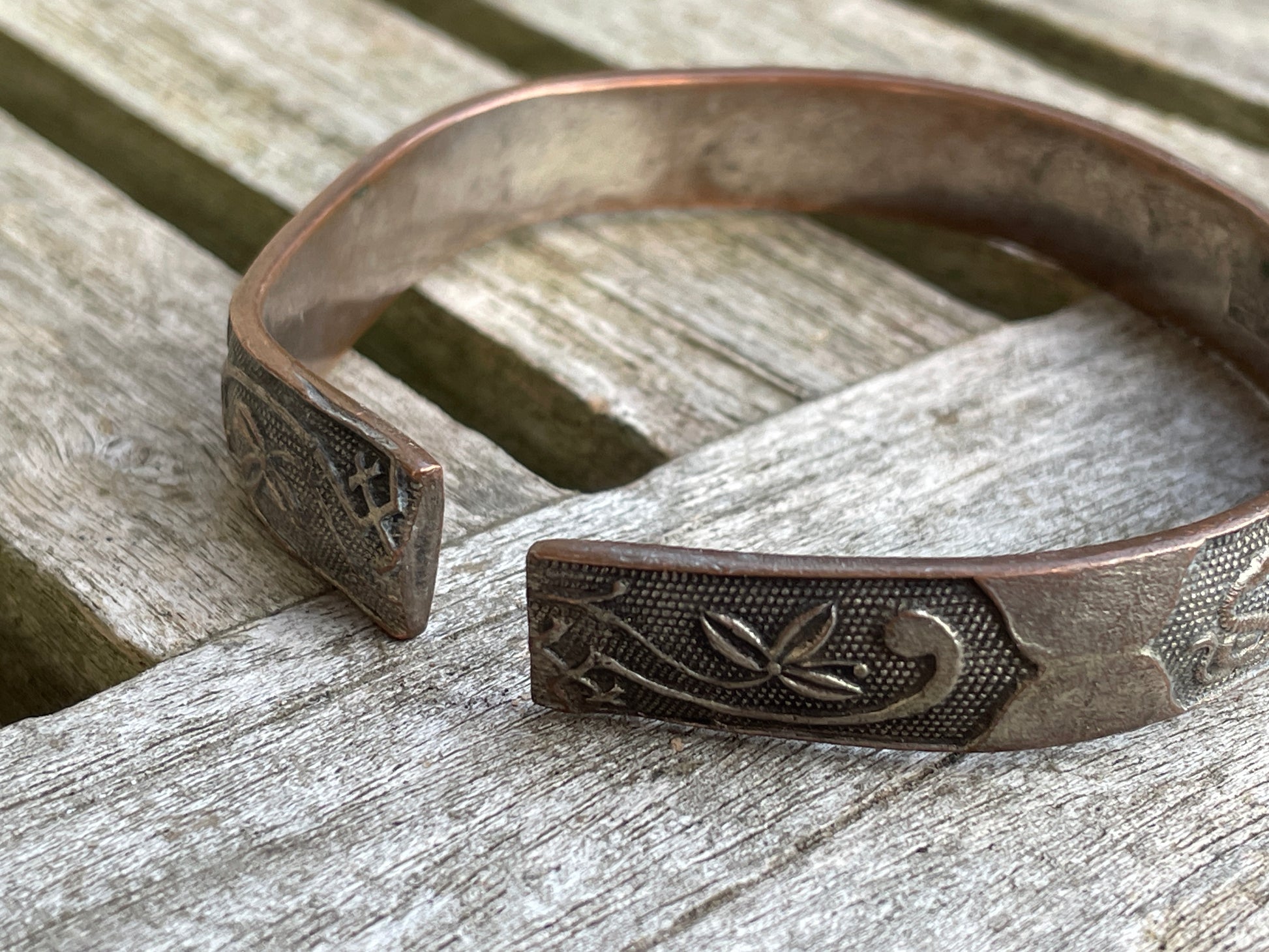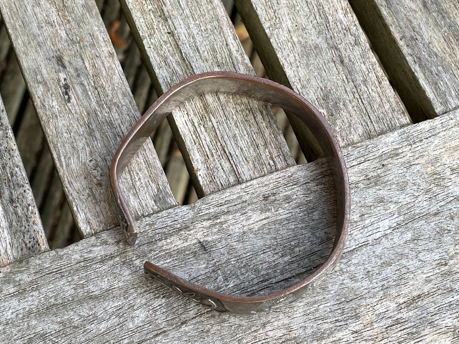 The bangle is slightly misshapen and weighs 41g and appears to be made form a copper alloy