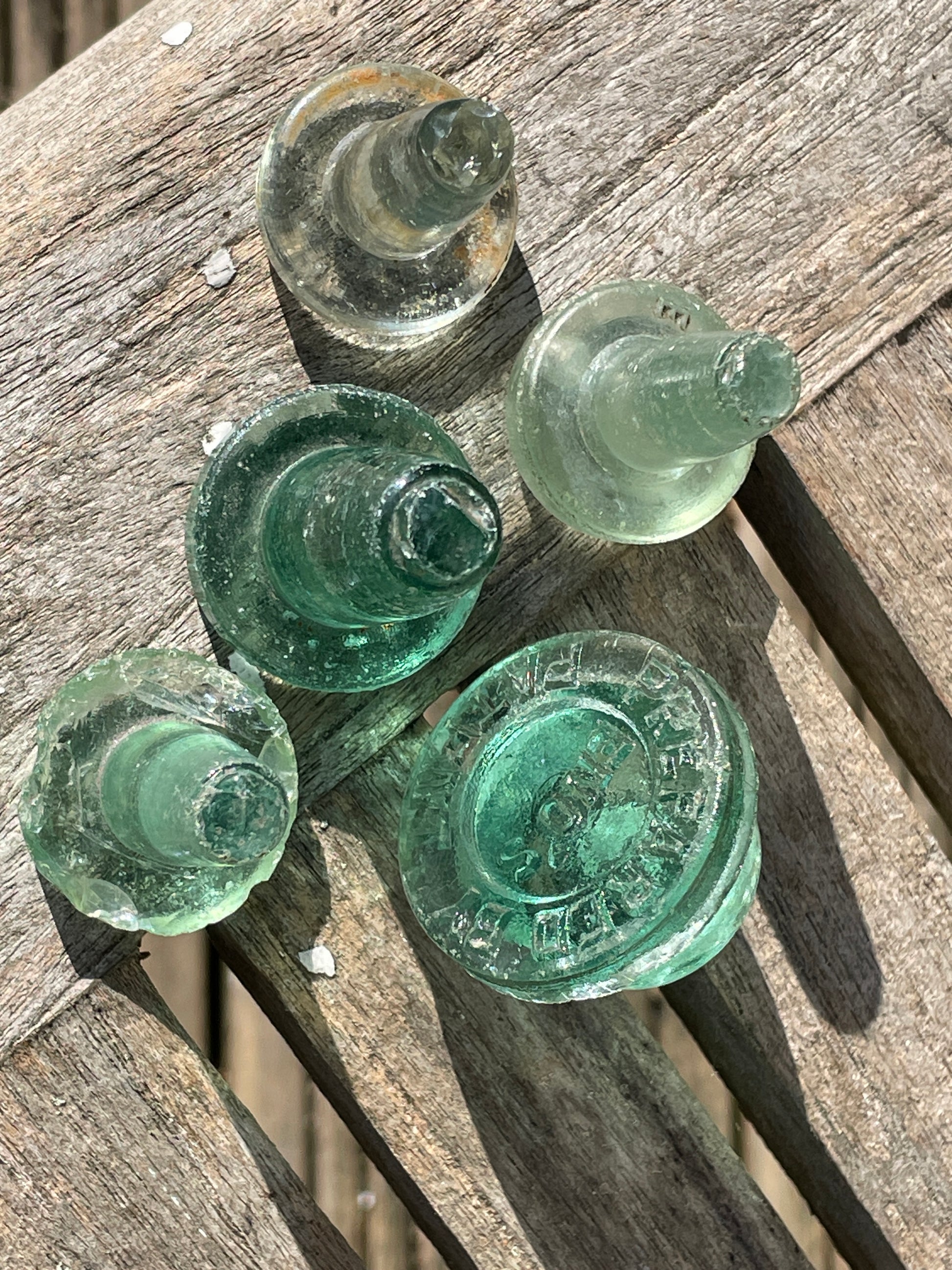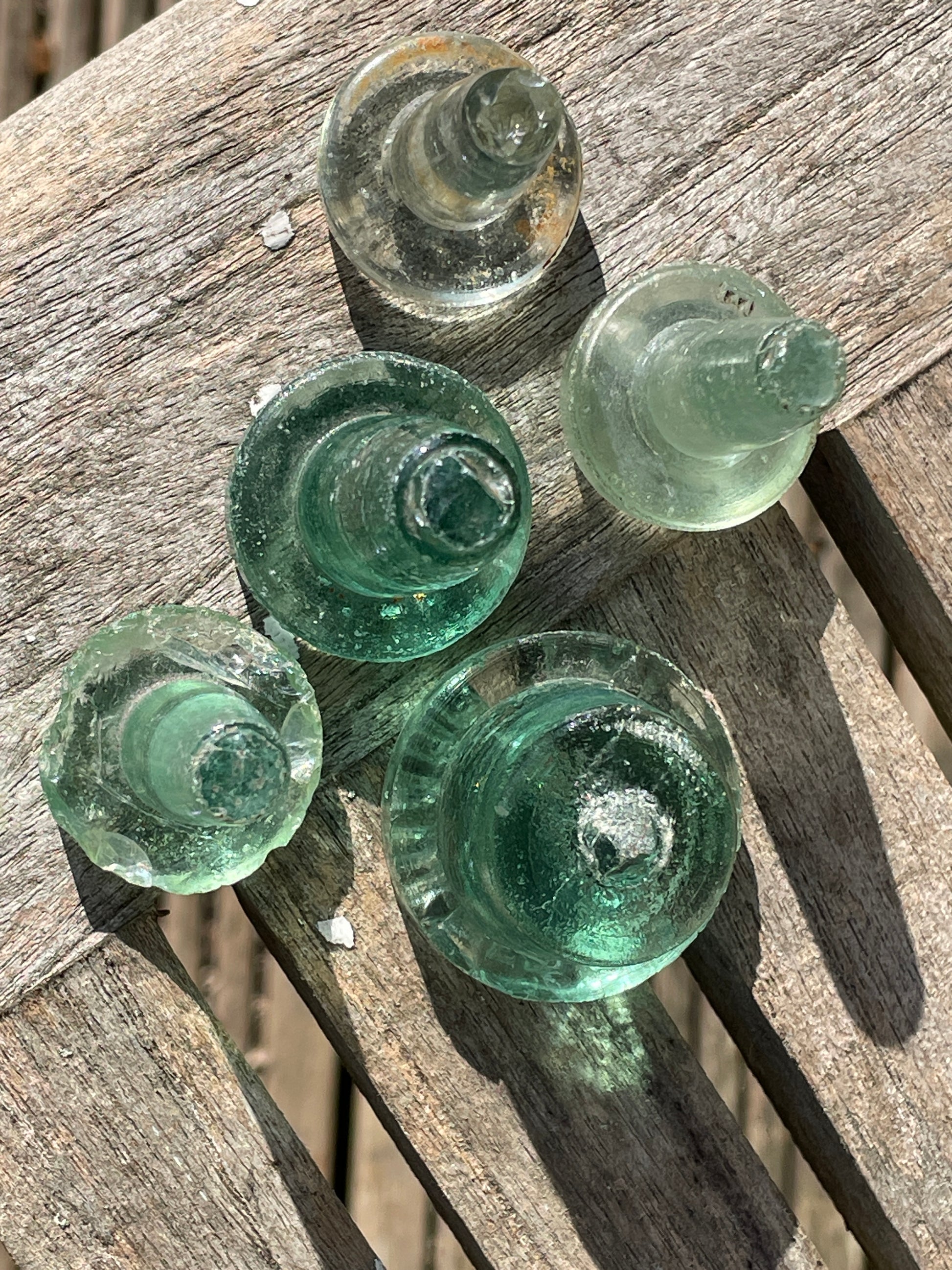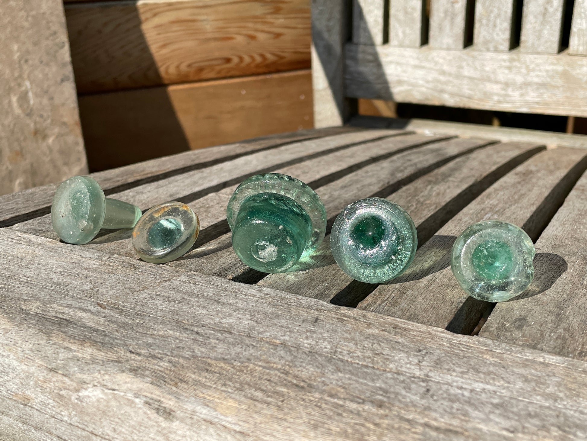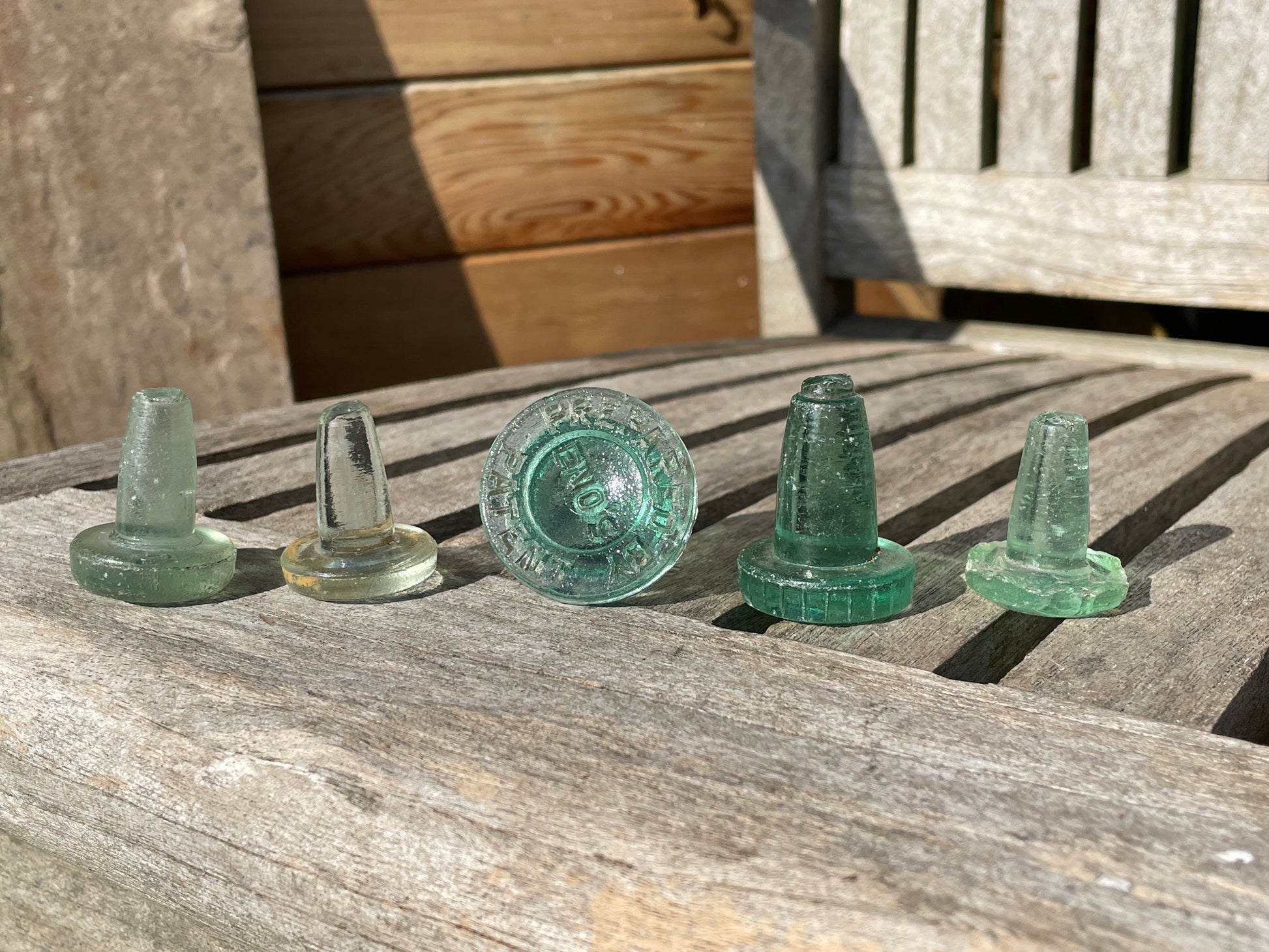 Five glass bottle stoppers one marked Prepared by Eno's Patent c1890's and earlier