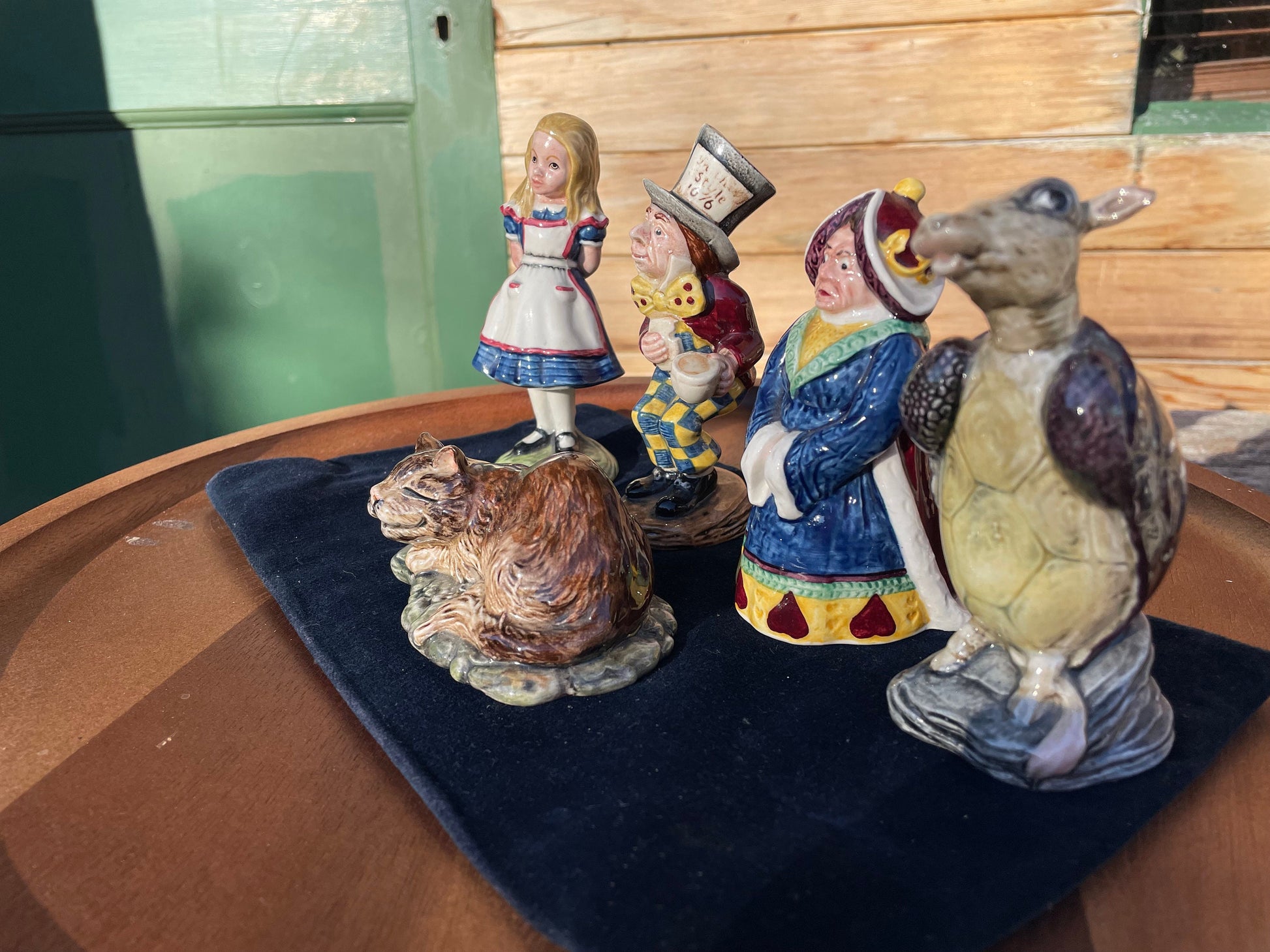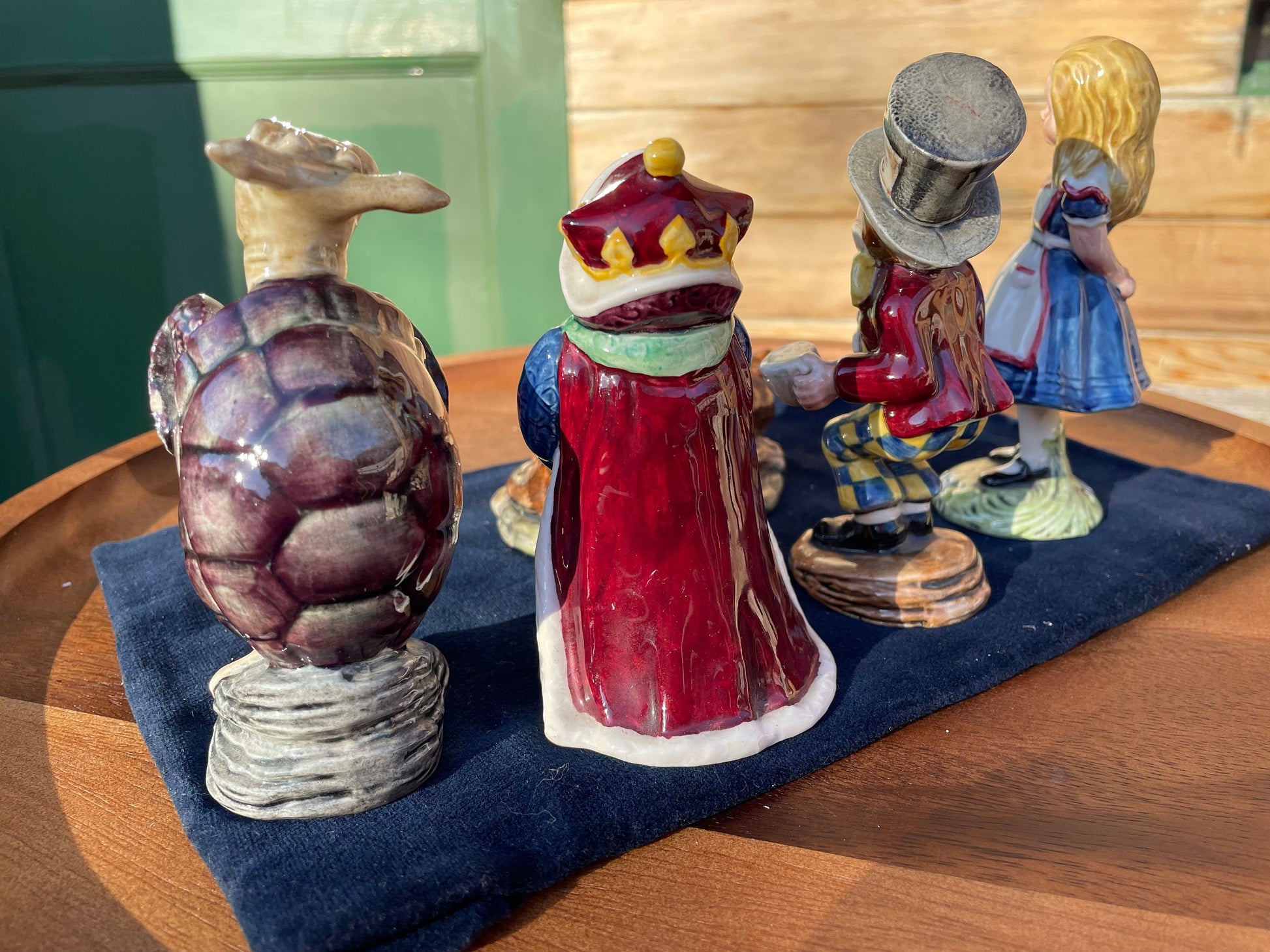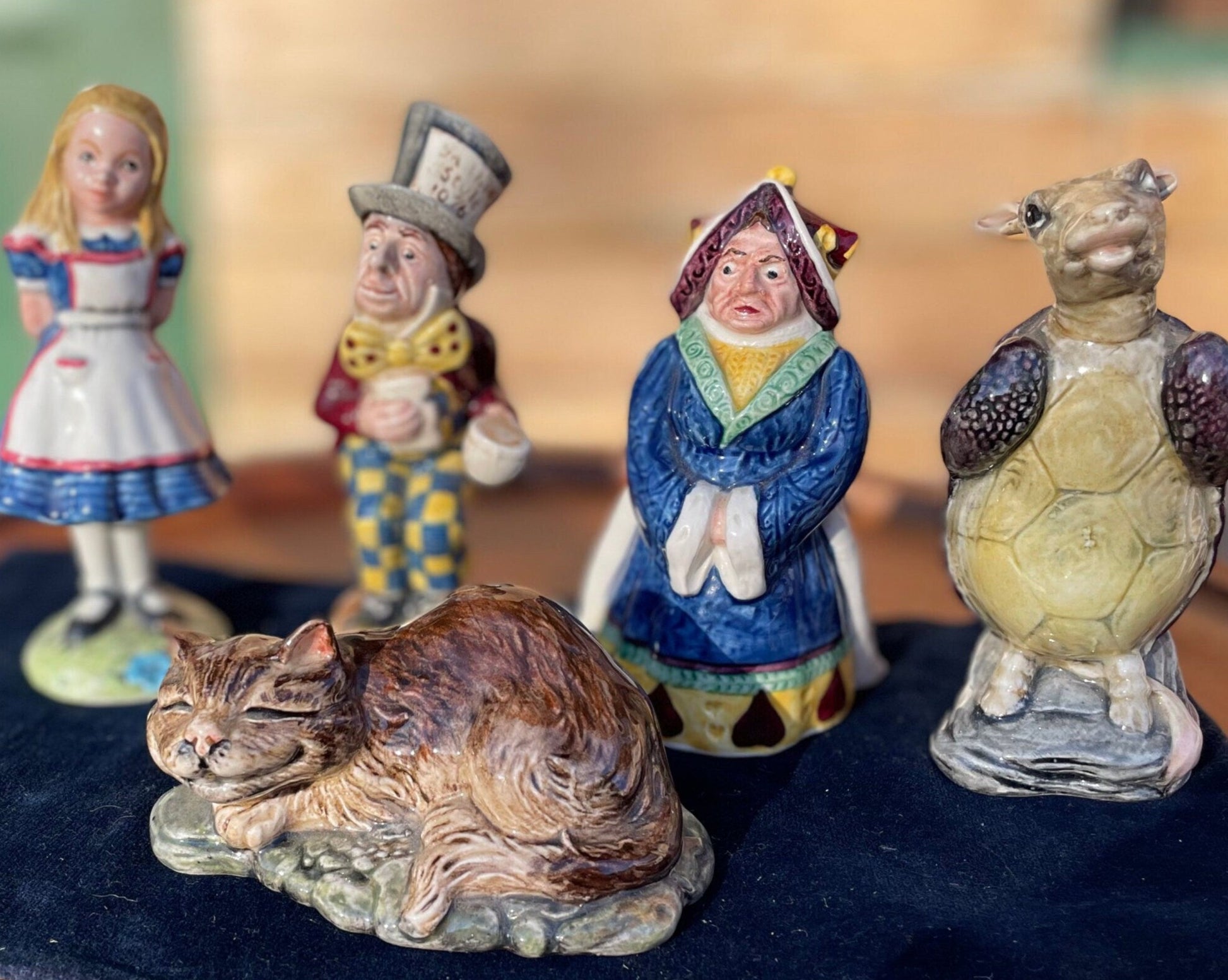 This Alice (in wonderland) miniature set comprises of the Queen of Hearts, Alice, Mad Hatter, Mock Turtle and Cheshire Cat, the largest 12.5cm high