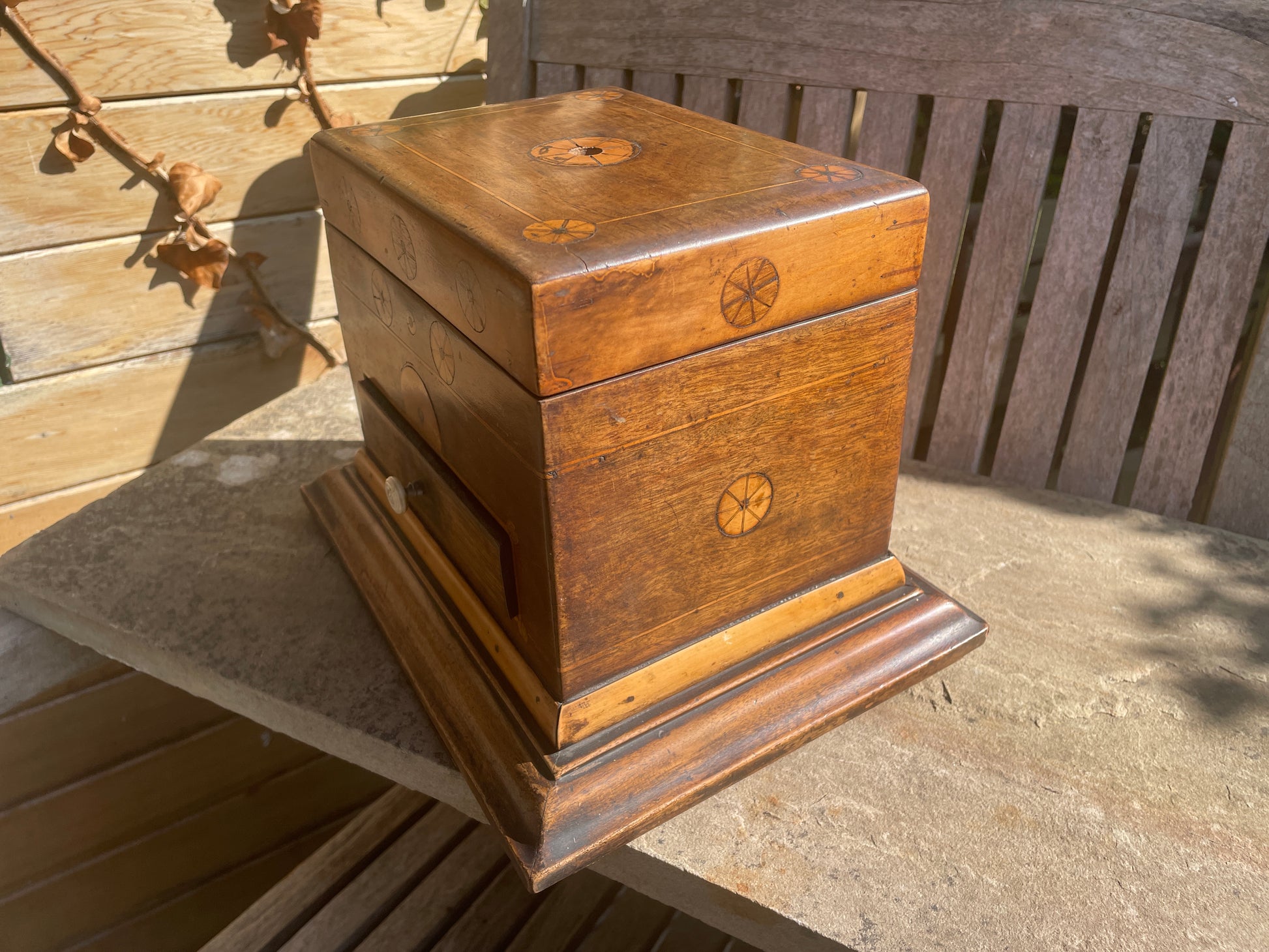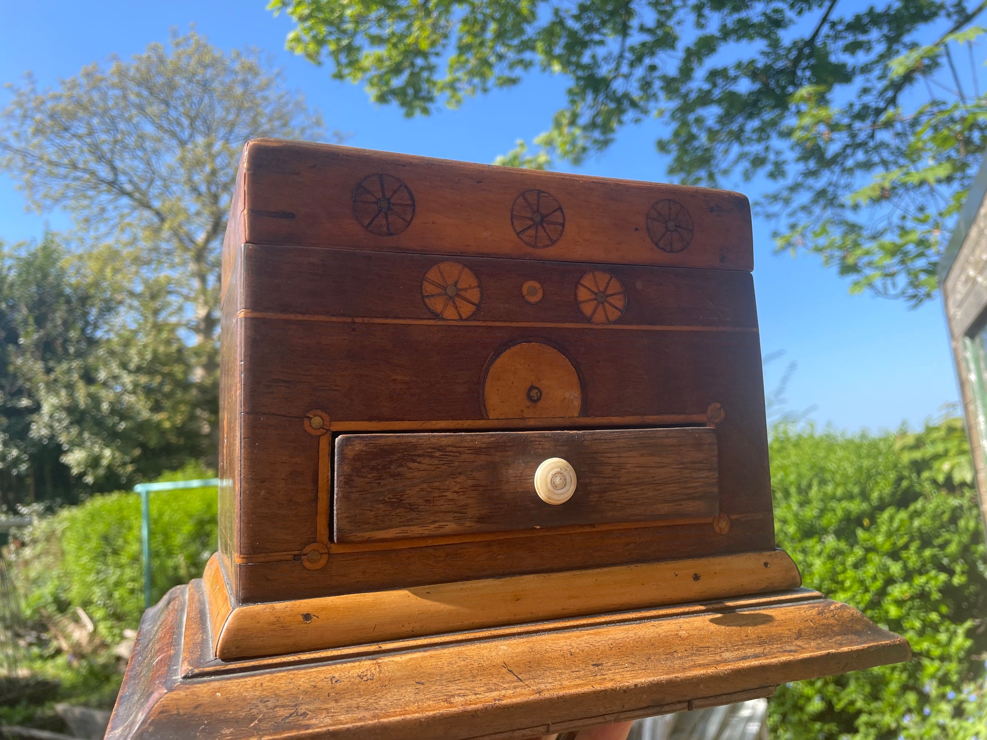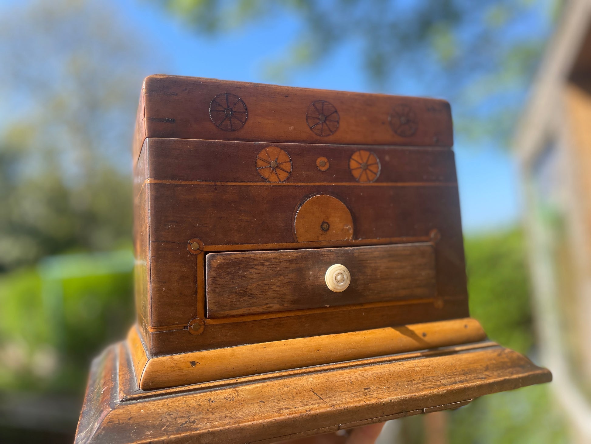 The inlaid design features a beautifully executed bobbin-like wheel motif, showing both skill and a touch of naive craftsmanship — the kind that gives true folk art its unique and heartfelt appeal.