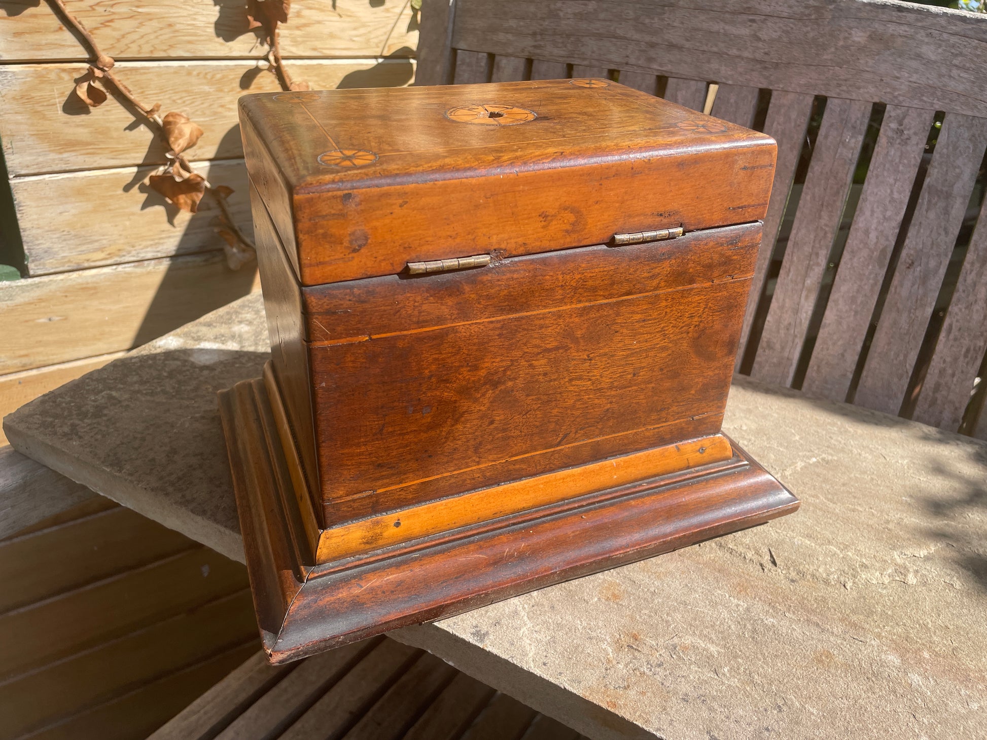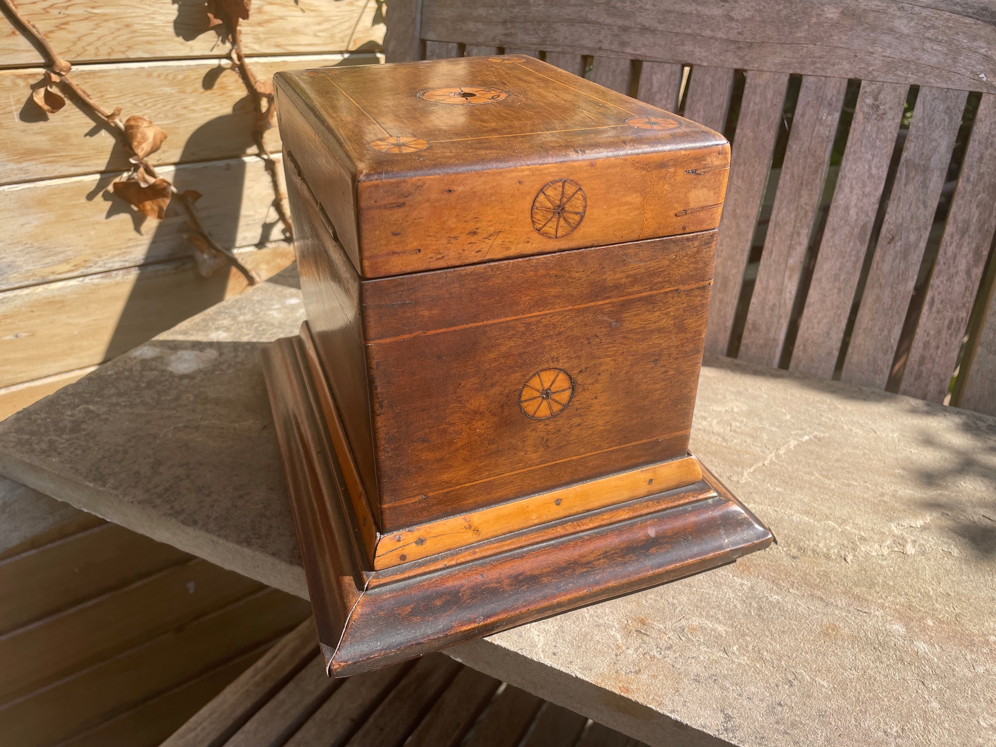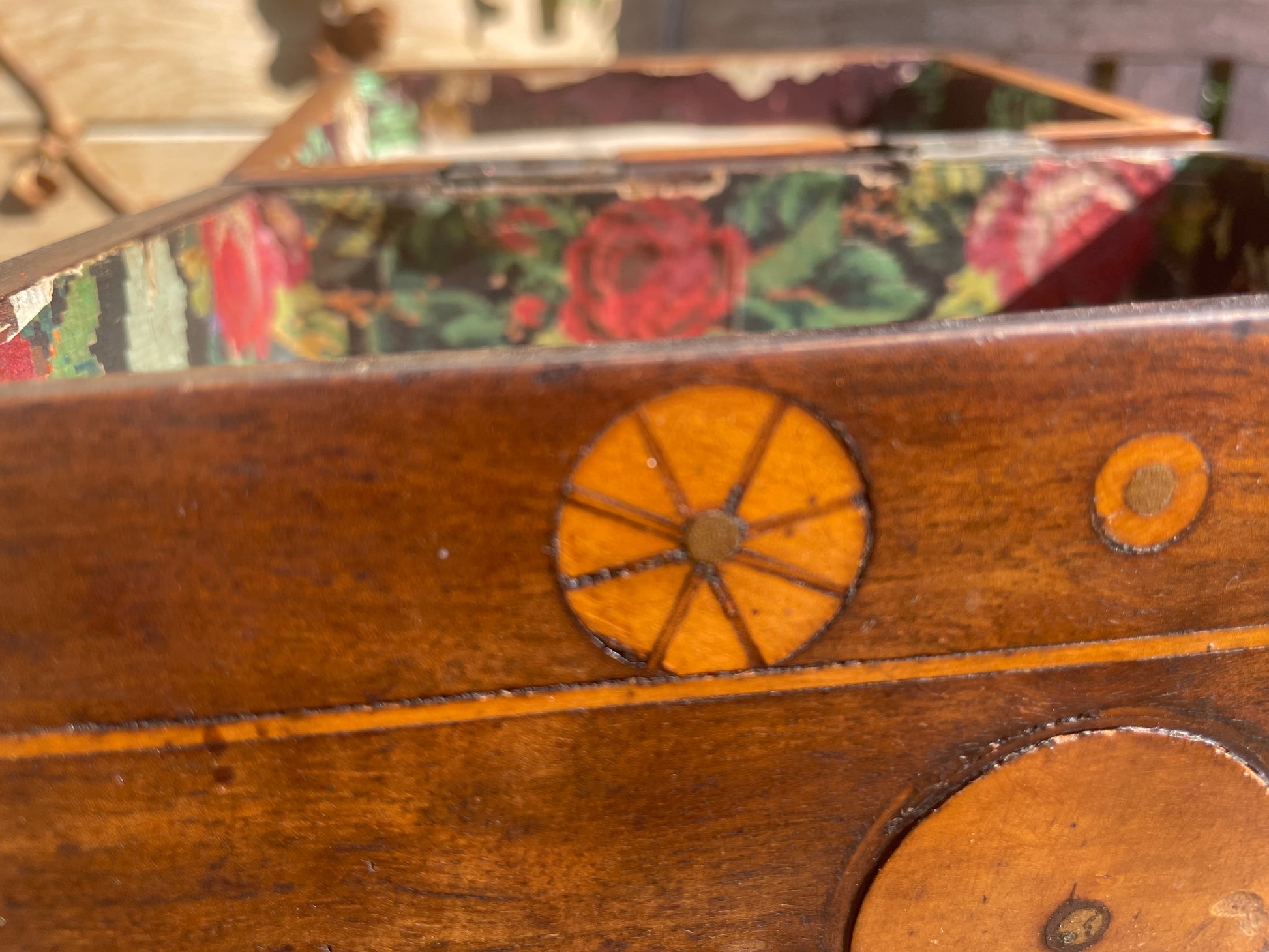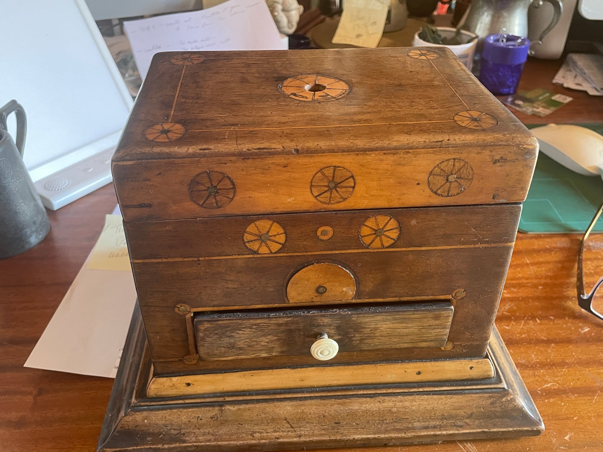 The inlaid design features a beautifully executed bobbin-like wheel motif, showing both skill and a touch of naive craftsmanship — the kind that gives true folk art its unique and heartfelt appeal.