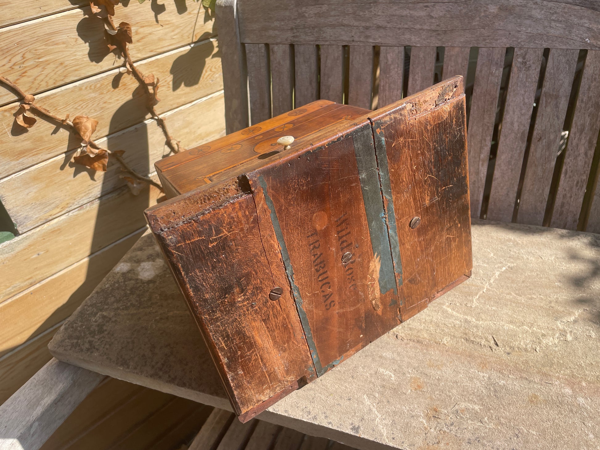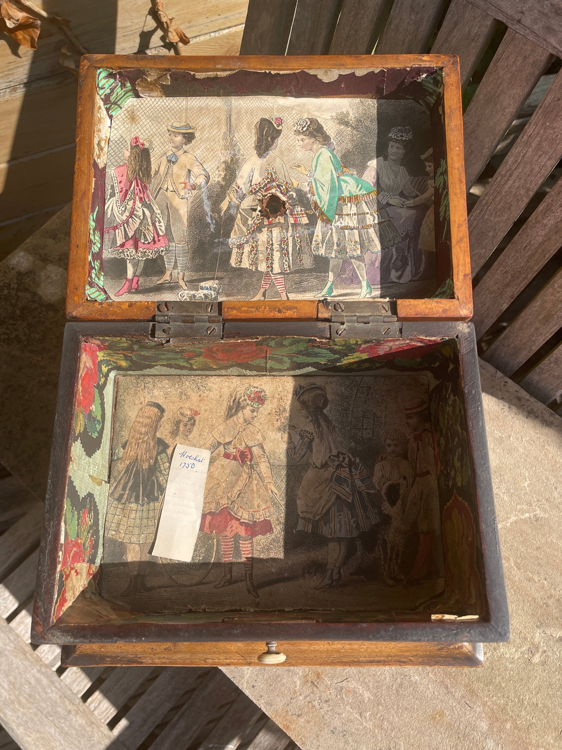 Handmade Antique Folk Art Box – Turn of the 19th Century – Unique Inlay & Decoupage Interior