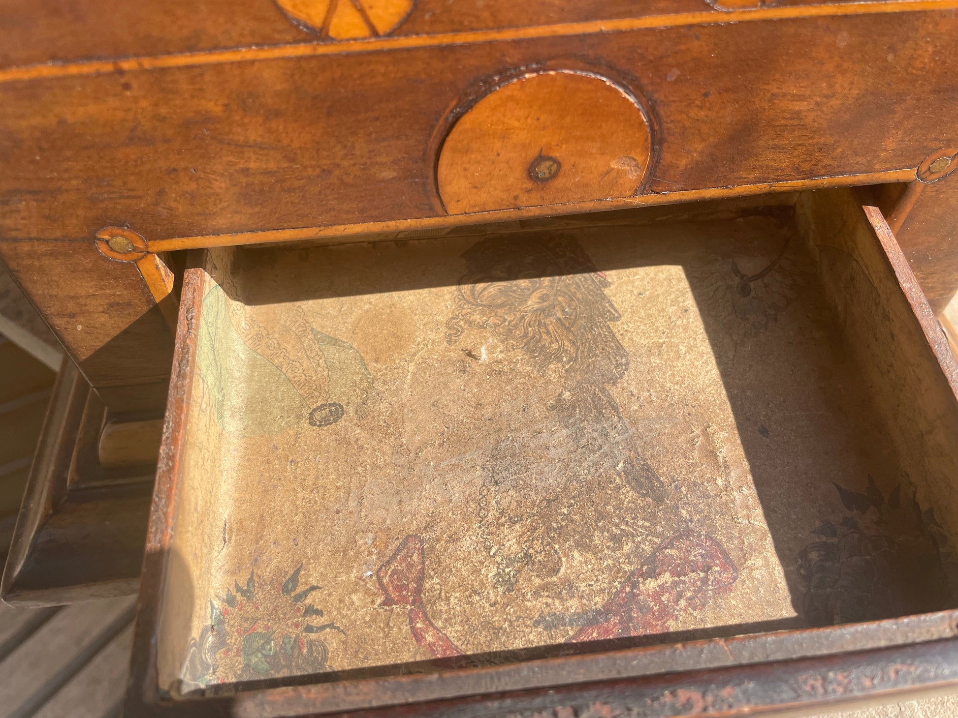 Interior: Both the main box and drawer feature a lovely decoupage-style decoration, typical of the era and in excellent condition