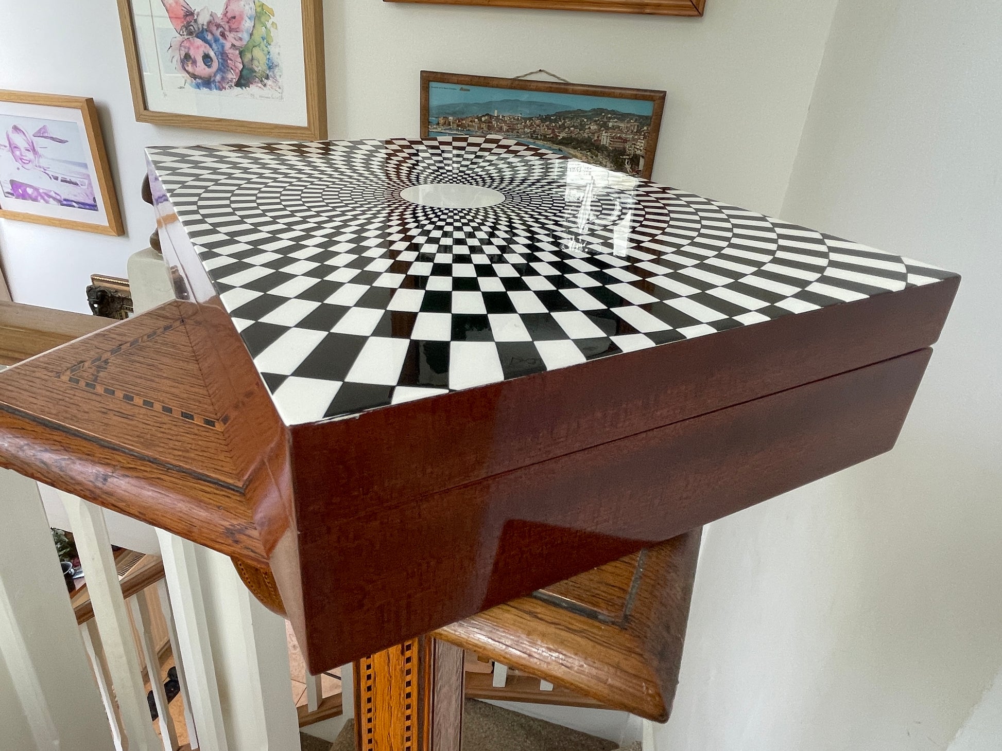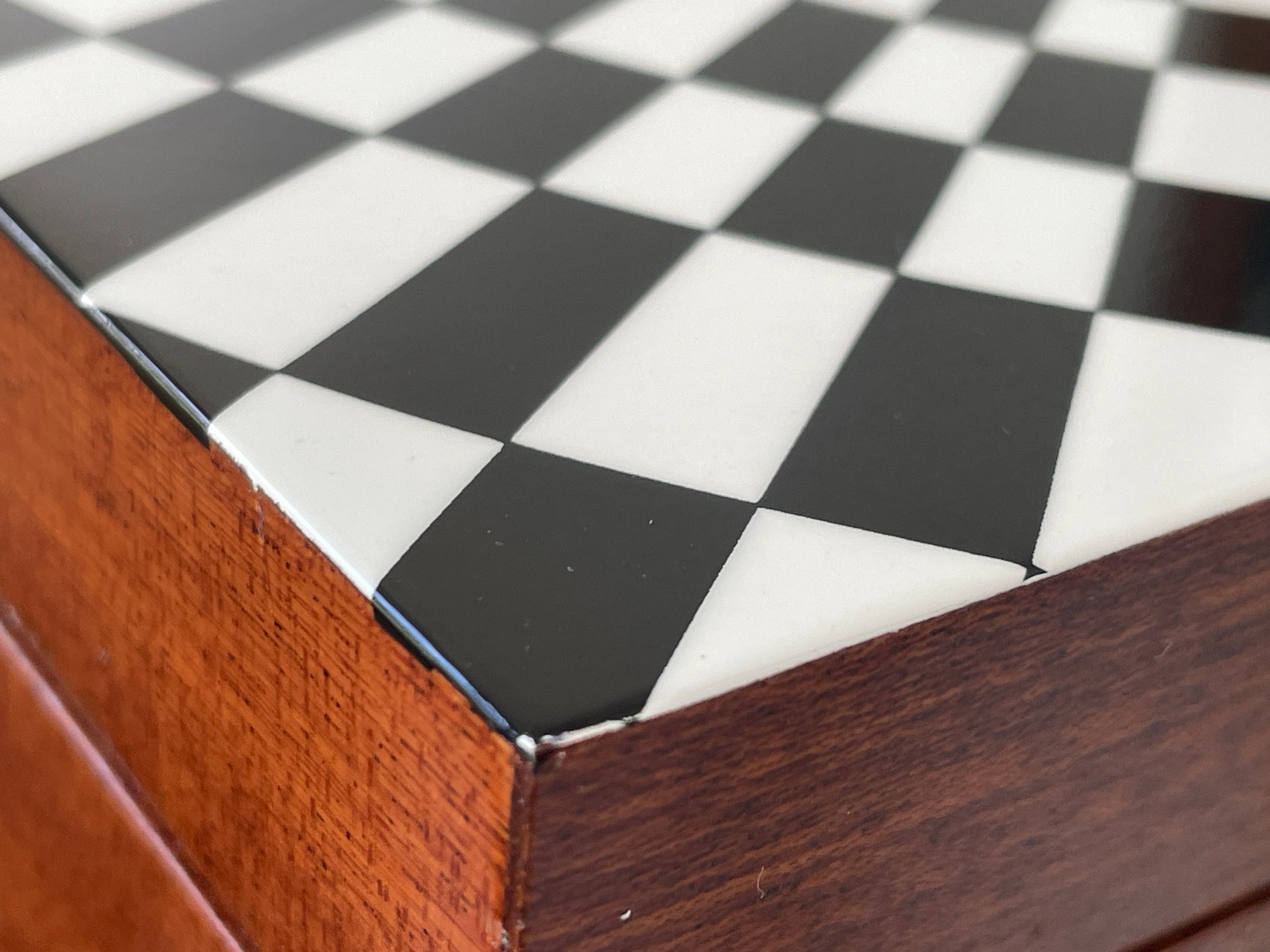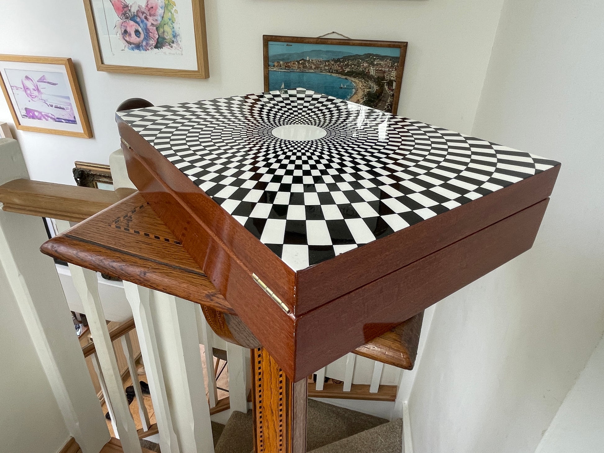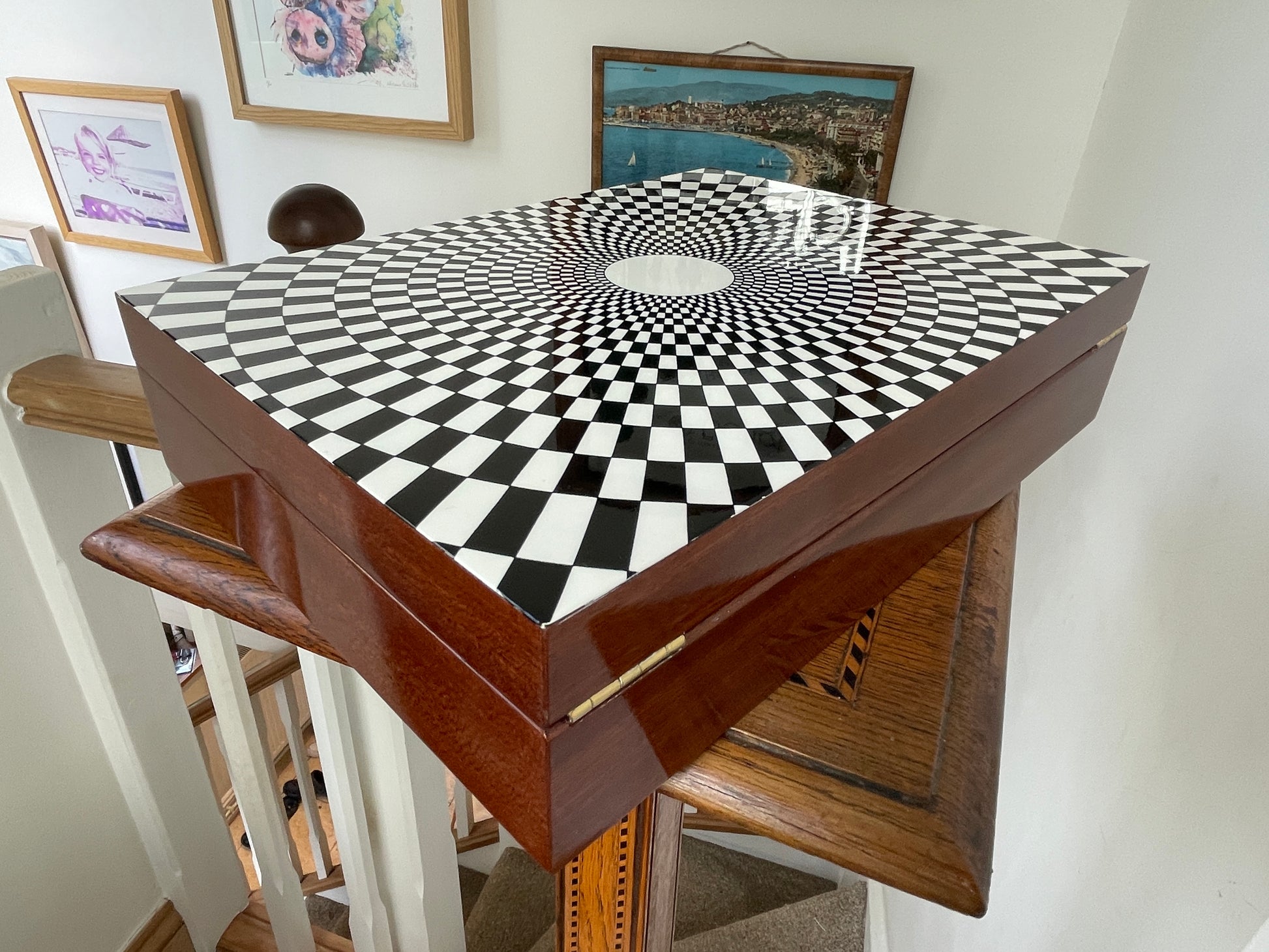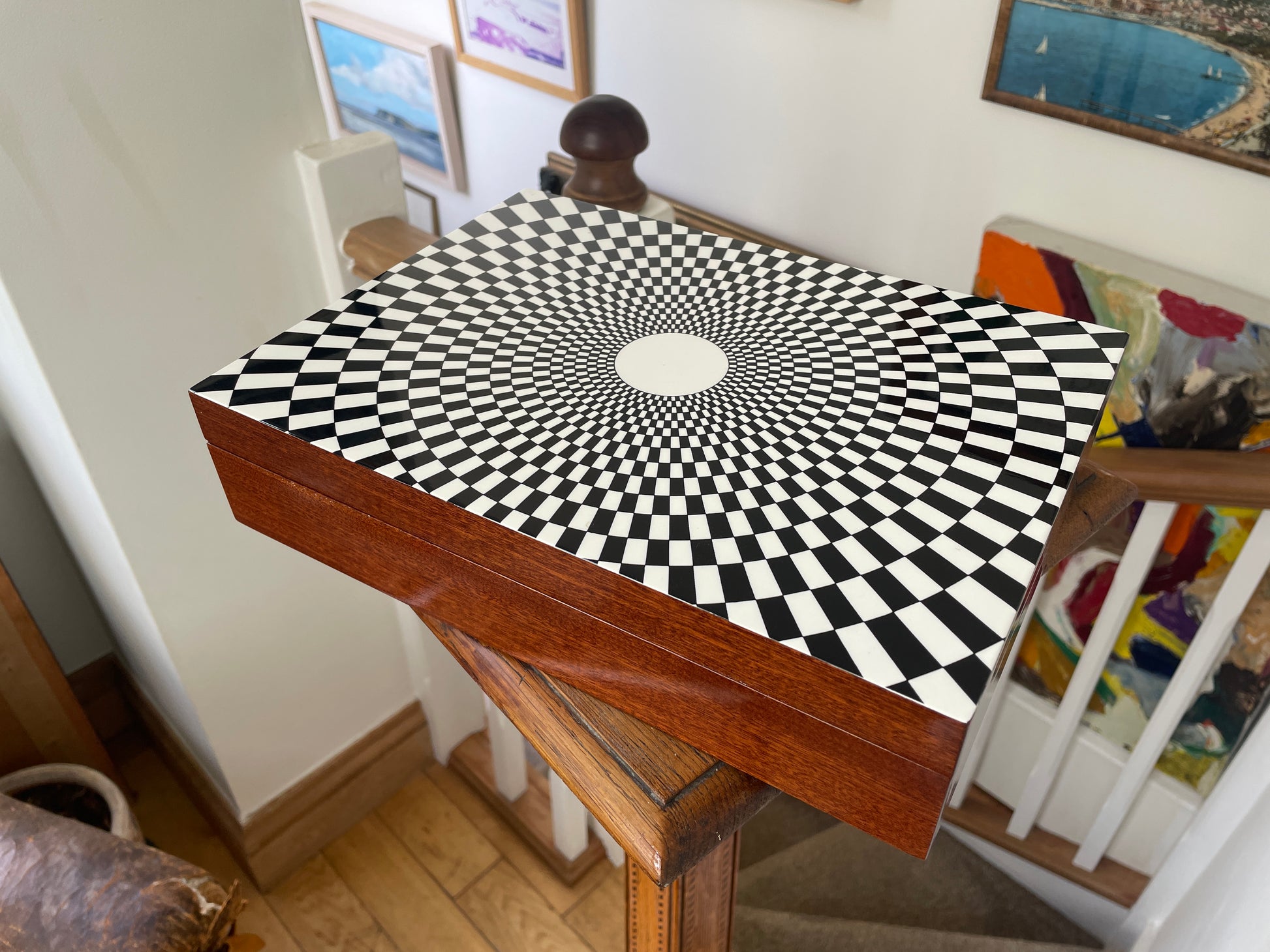 A striking Fornasetti “Egocentrismo” lacquered wooden box, decorated with the iconic black and white concentric checkerboard Op Art design. This bold optical illusion pattern is one of Fornasetti’s most recognisable and celebrated motifs, blending fine Italian craftsmanship with surrealist-inspired style.