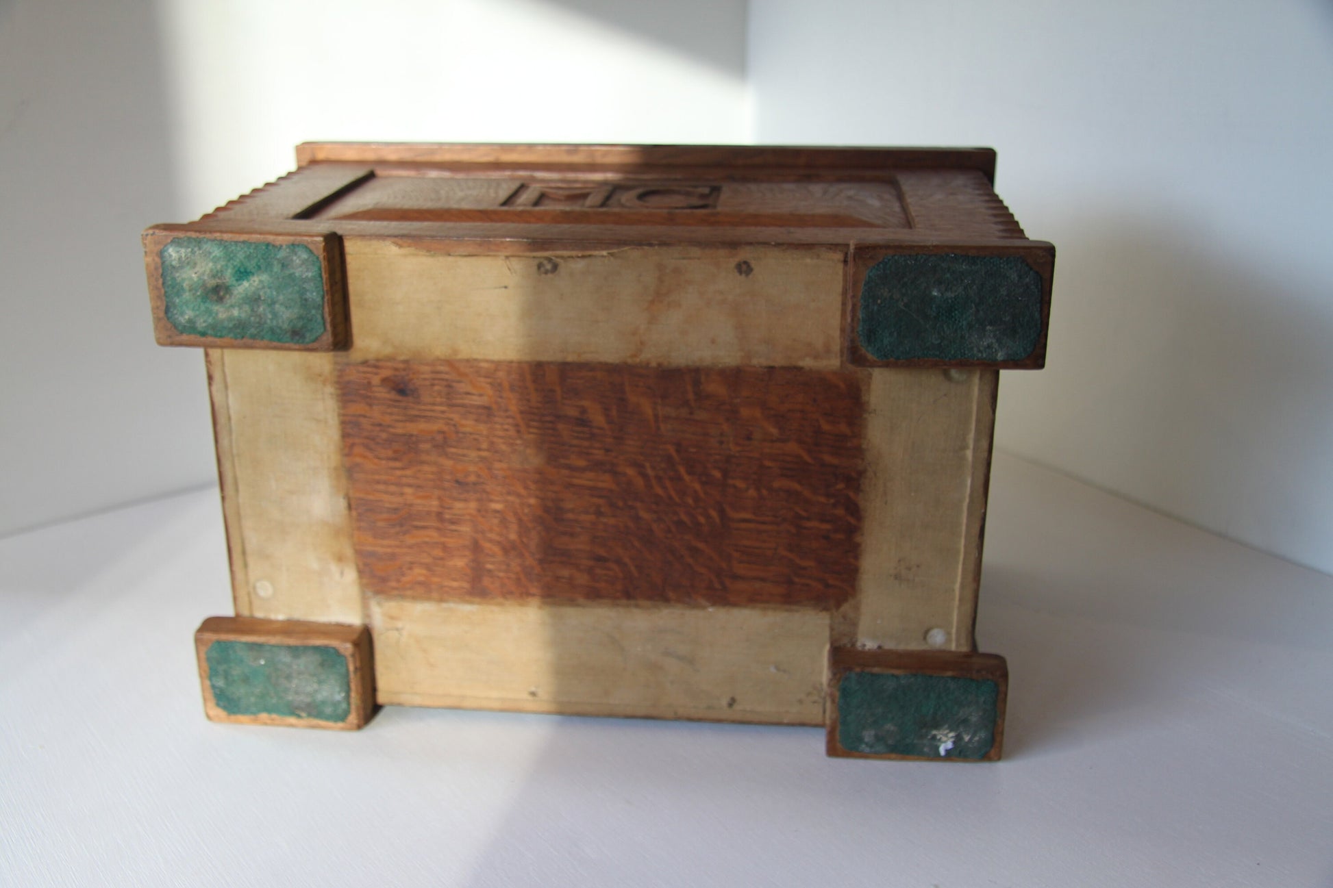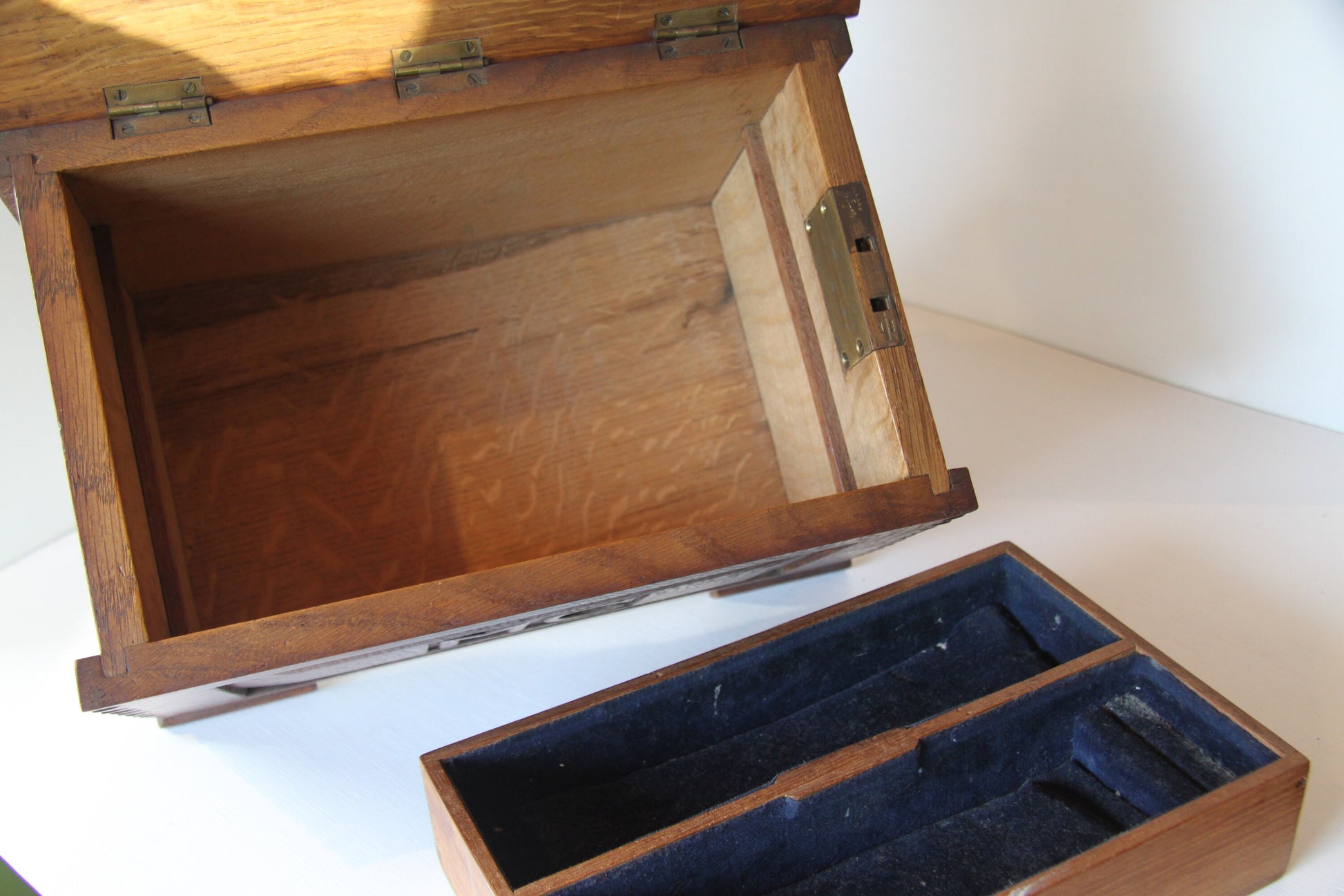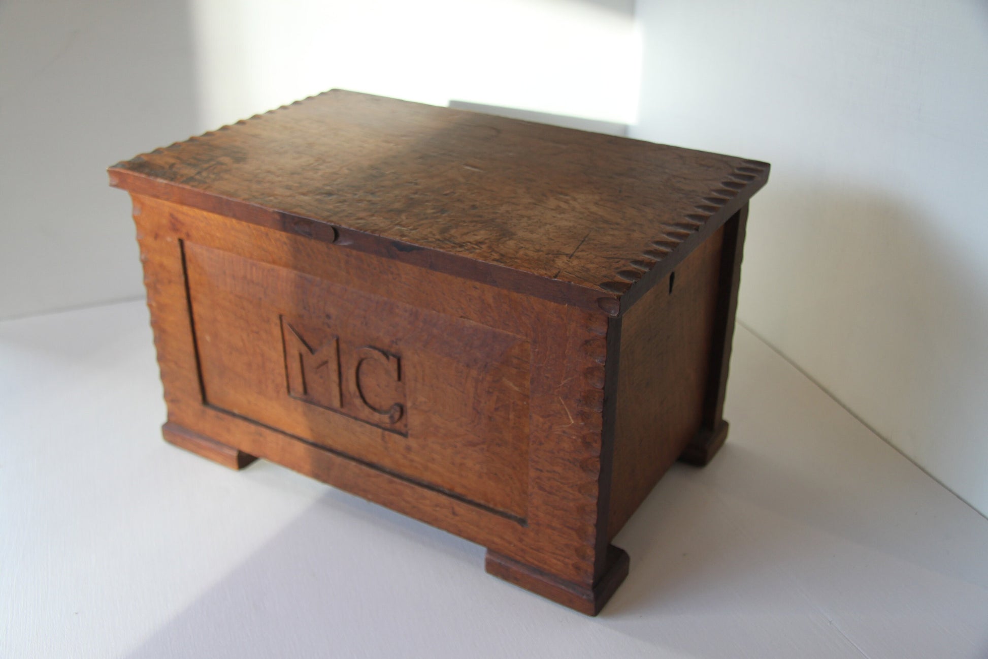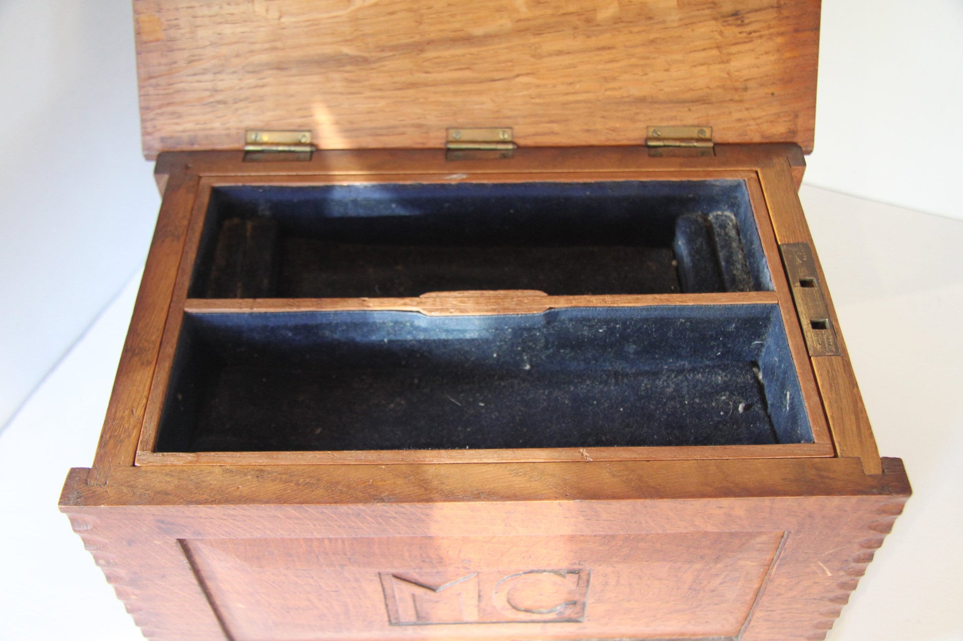 An early 20th century Gothic style oak jewellery box, with fitted inner tray that slides in beautifully (definitely its original lining box) and monogrammed panelled front "MC"