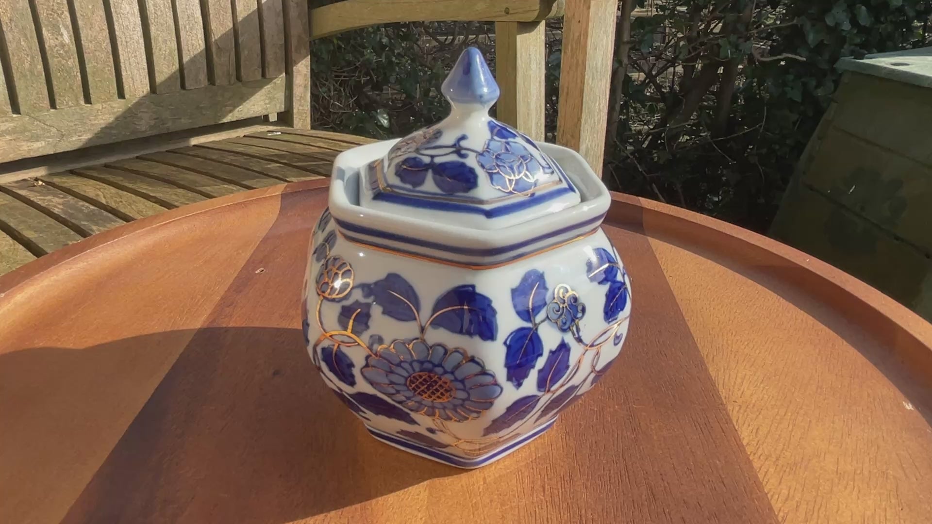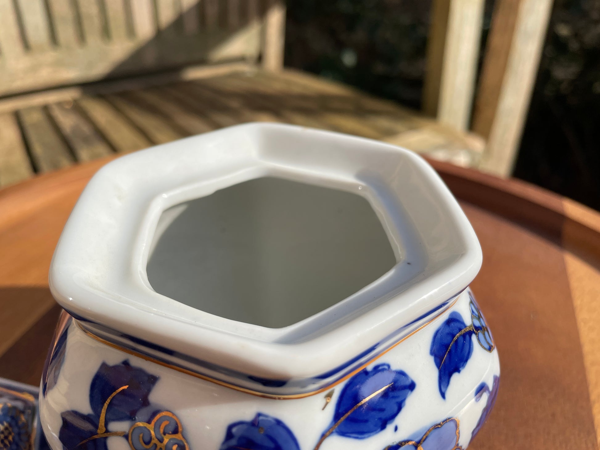 Hexagonal porcelain hand painted gilded oriental lidded pot 12cm tall