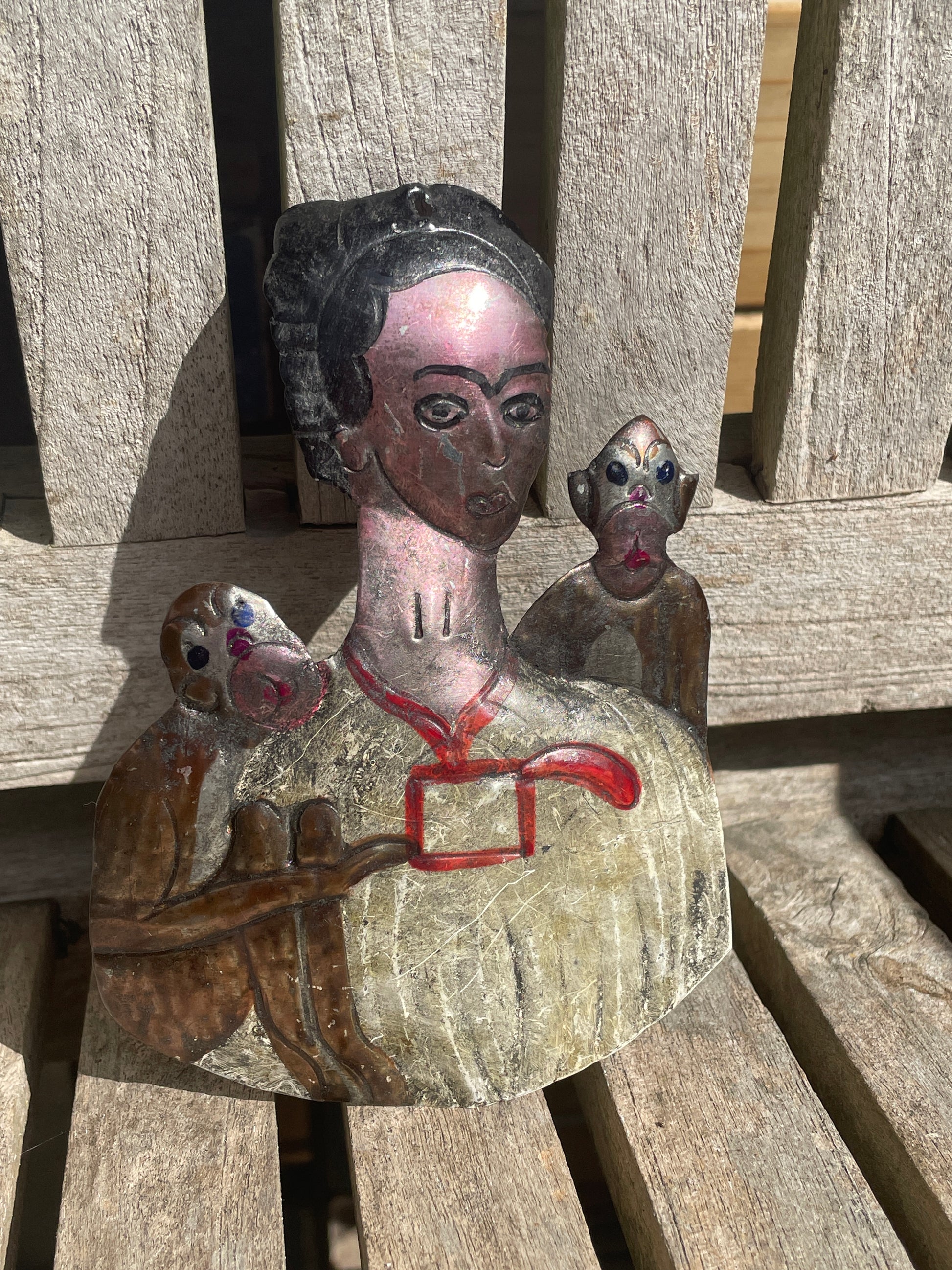 Crafted from hand-cut tin and decorated with vibrant hand-painted details, this folk art piece captures the bold, symbolic energy of Kahlo's art and legacy.