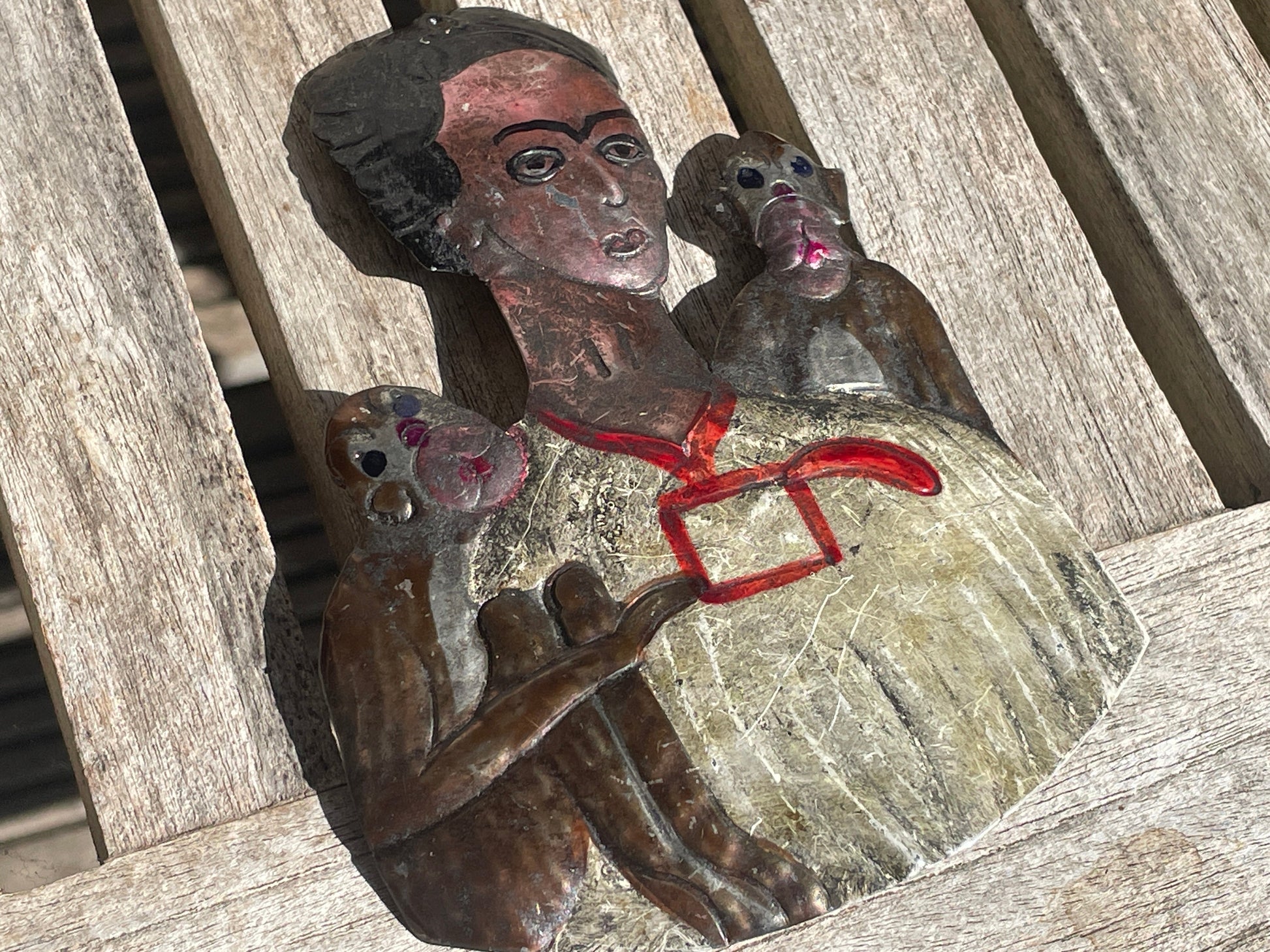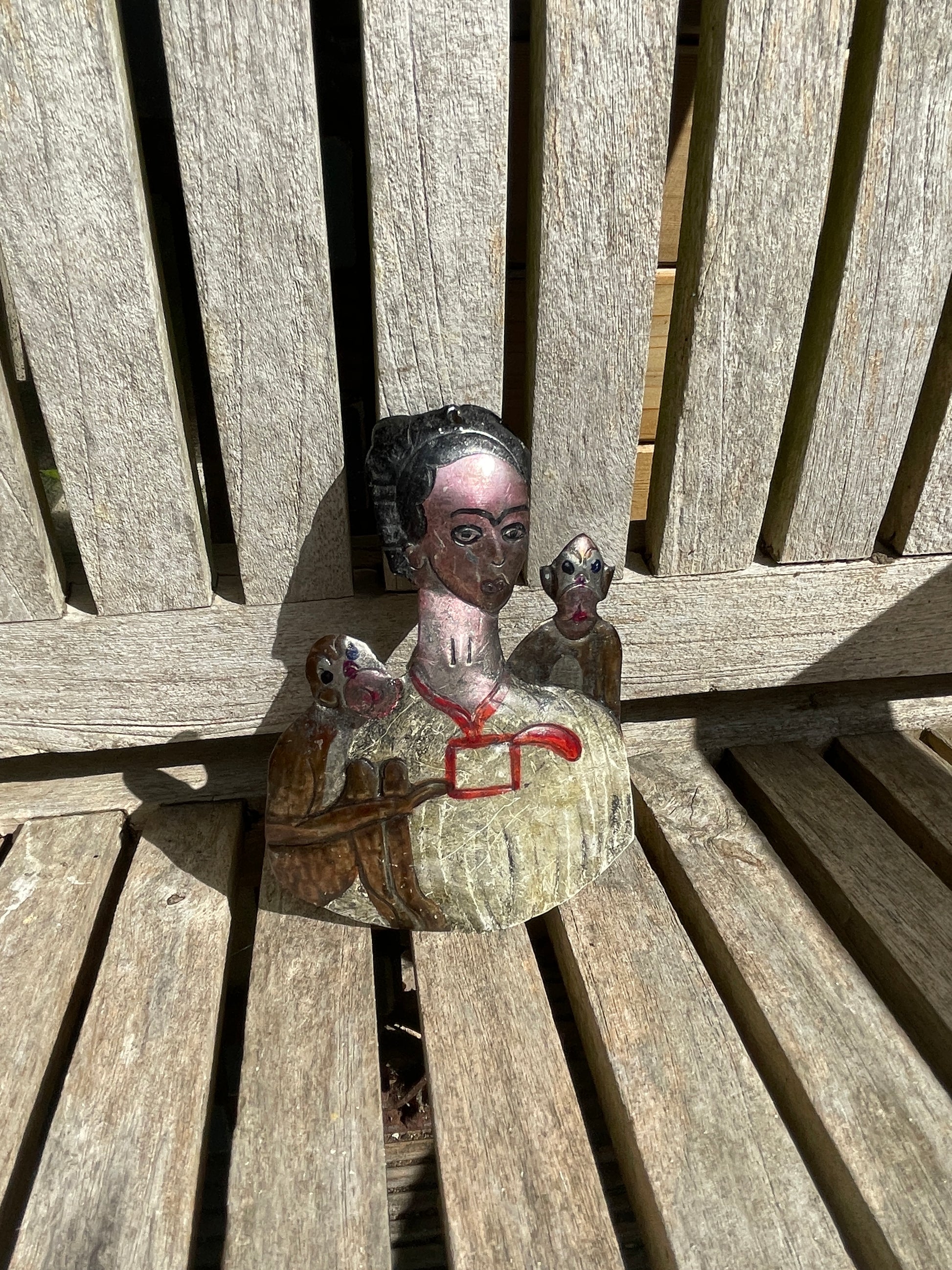 Mexican Tin Retablo of Frida Kahlo with Monkeys – Hand-Painted Folk Art