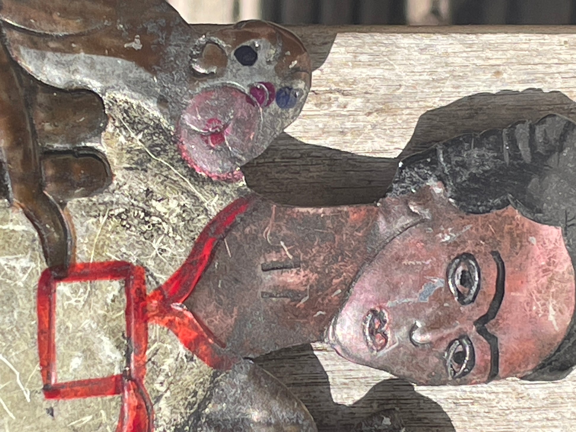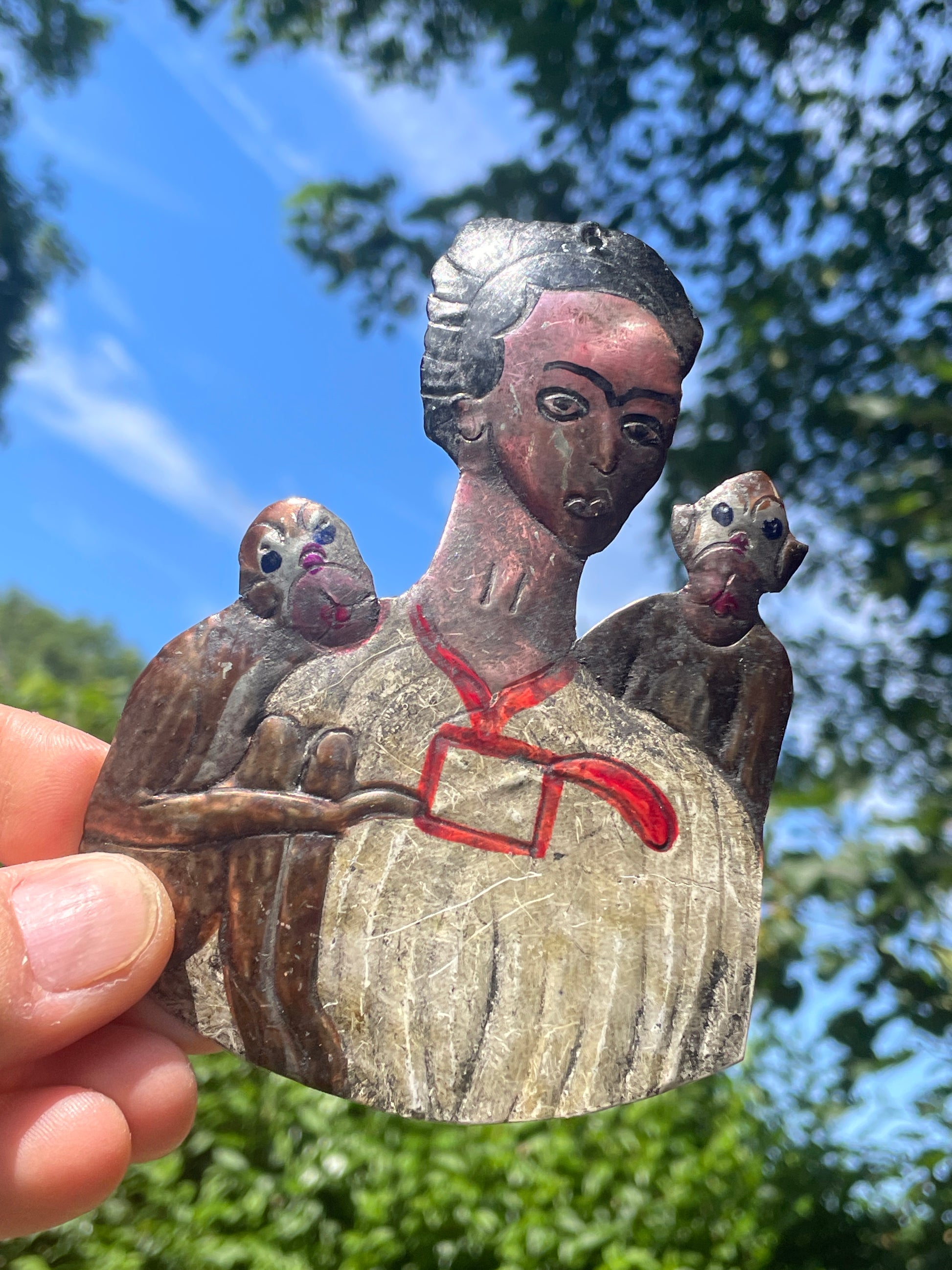 The piece features embossed details and painted accents in red, brown, and Ccream tones. The back remains unpainted and clearly shows tool marks from its handwork. There’s a small hole at the top for wall hanging.