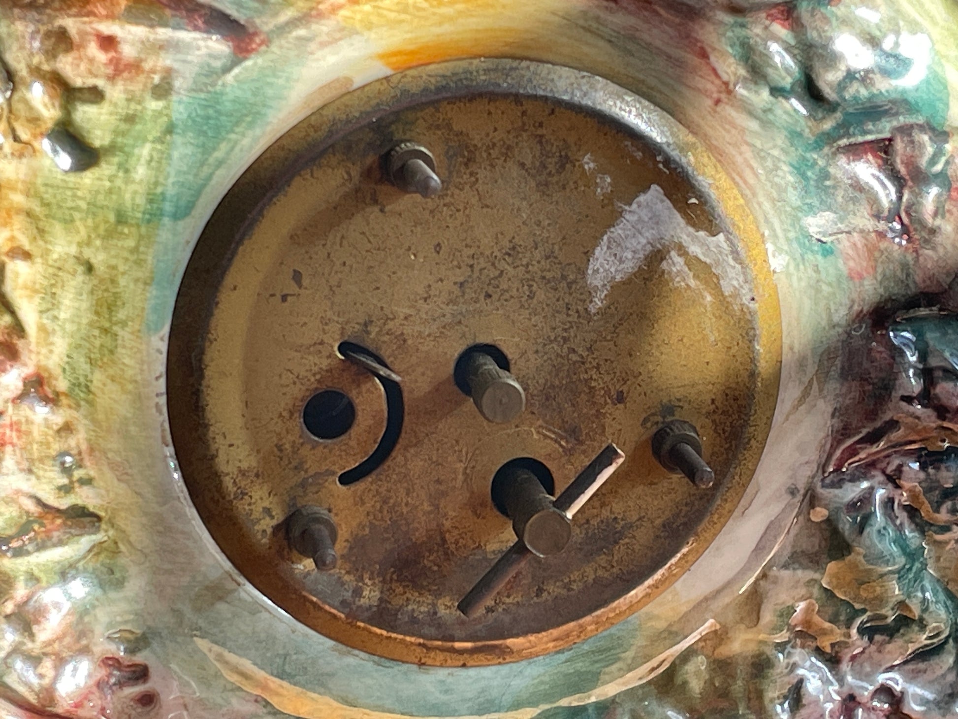 Made in Italy circa 1955–1965, this sculptural ceramic case is fitted with a Mercedes (West Germany) mechanical 30-hour wind-up movement accessed from the back. The clock ticks and runs but stops after a short time, suggesting it simply needs a light service or oil to run continuously.