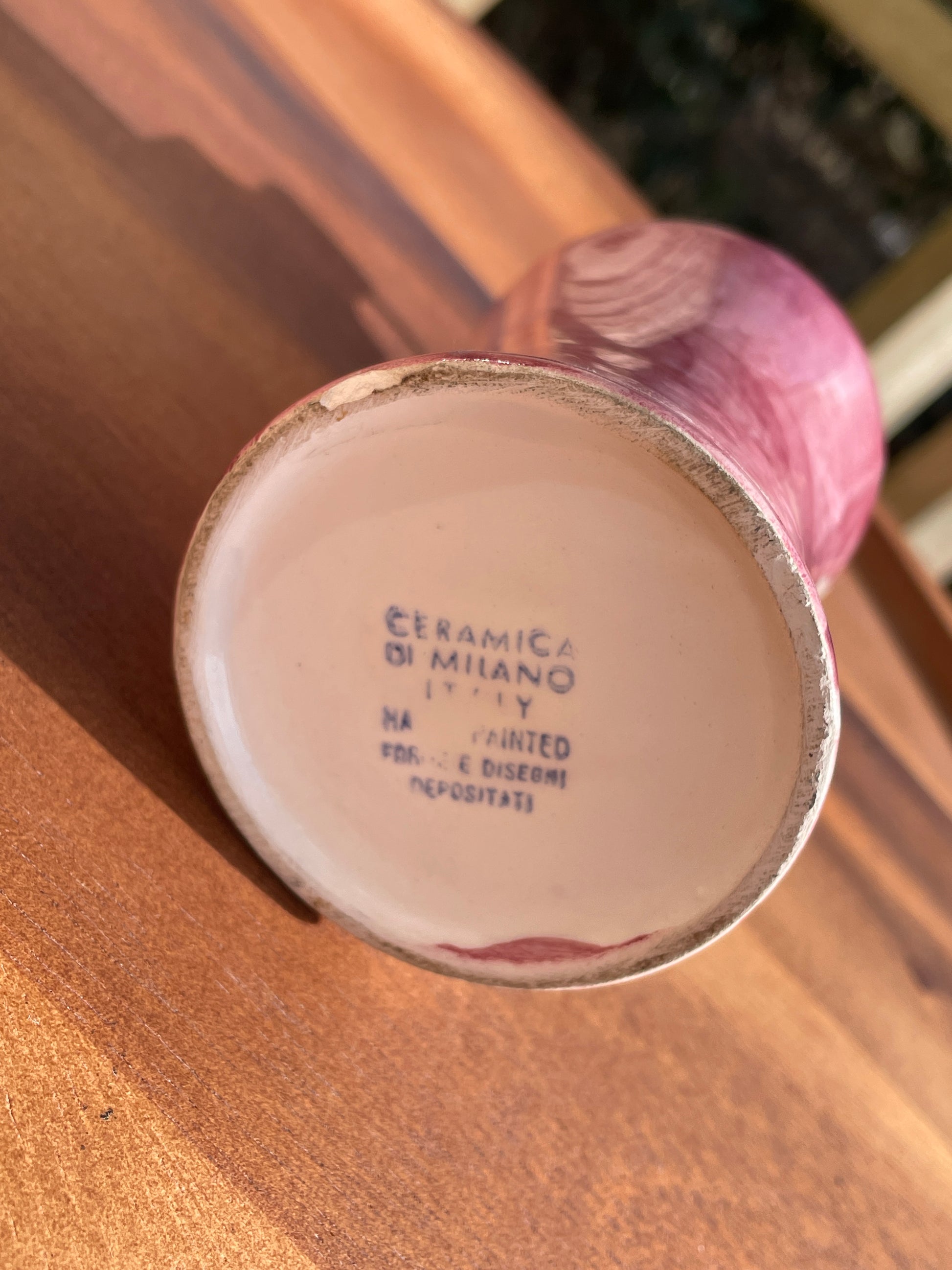 To the base 'Ceramic Di Milan Italy hand painted Forme e Disegni depoitati ' translated as 'Ceramic Di Milan Italy hand painted Shapes and Designs'