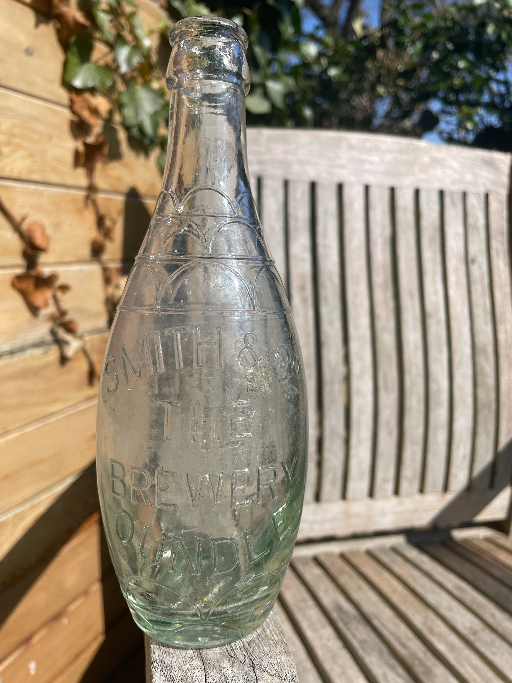 Original decorative Smith and Co. The Brewery Oundle torpedo shaped clear glass bottle 1938