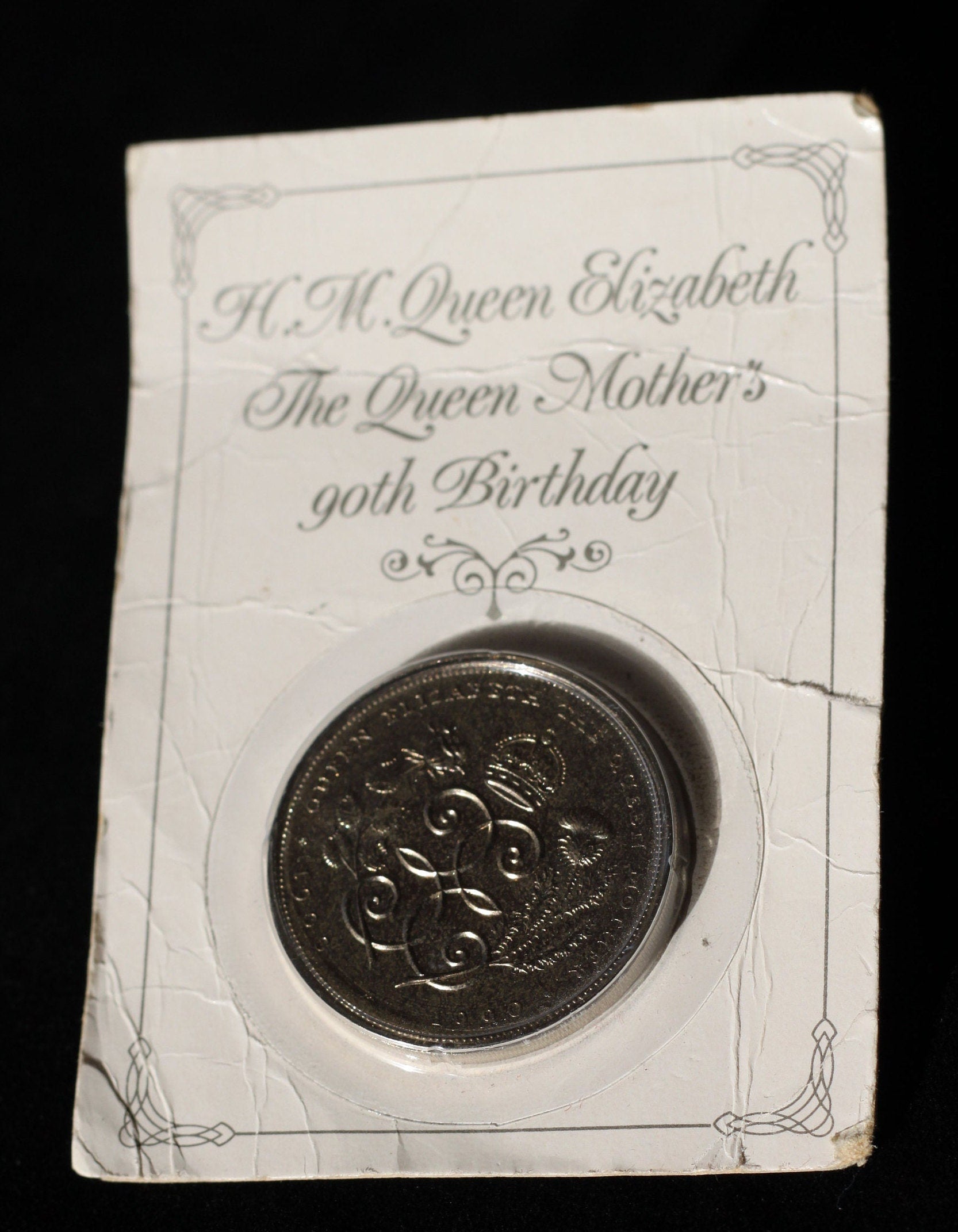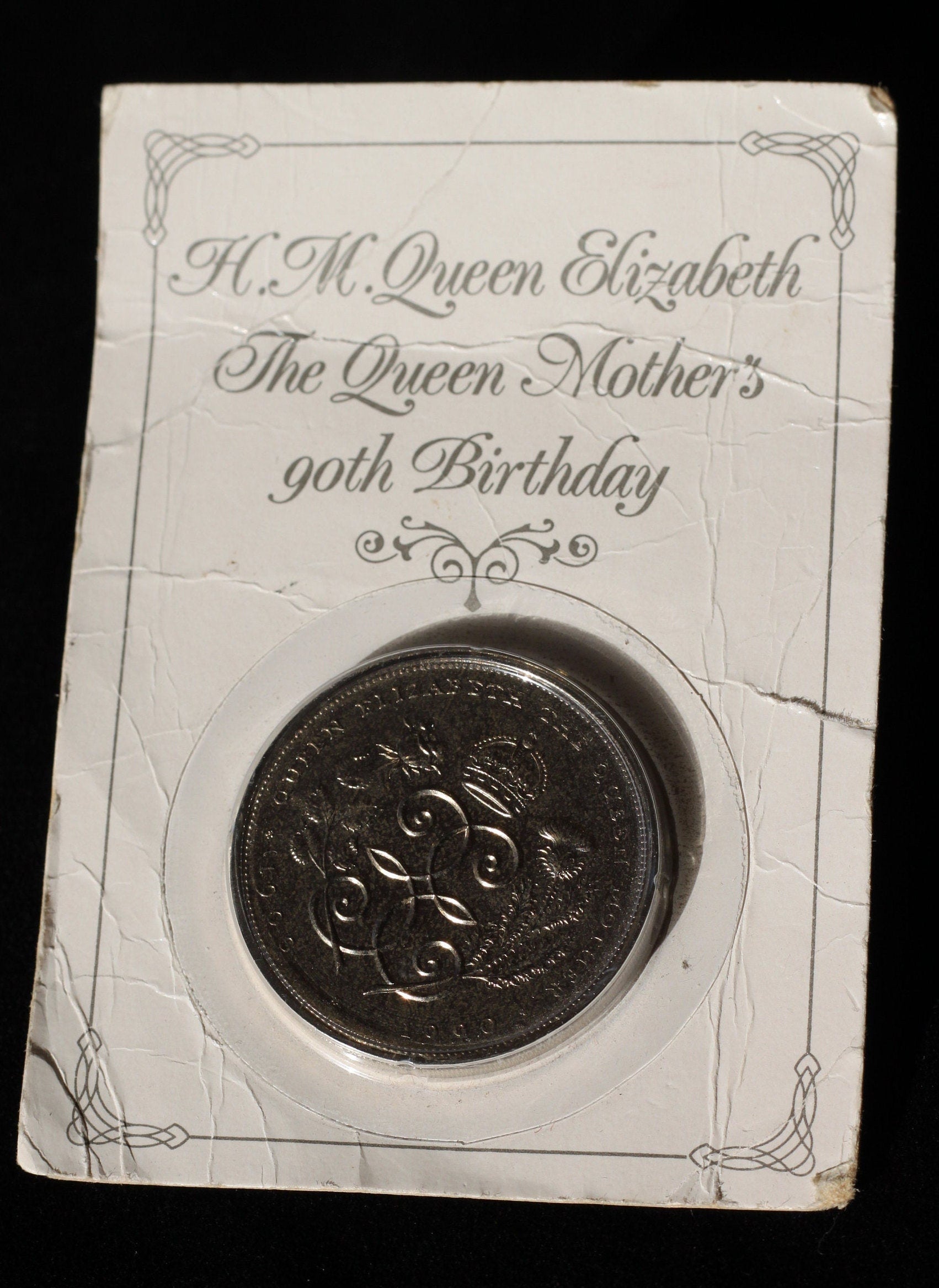 Here we have HM Queen Elizabeth's Mothers 90th Birthday Great Britain five pound coin issued to commemorate H.M. Queen Elizabeth, The Queen Mother's
