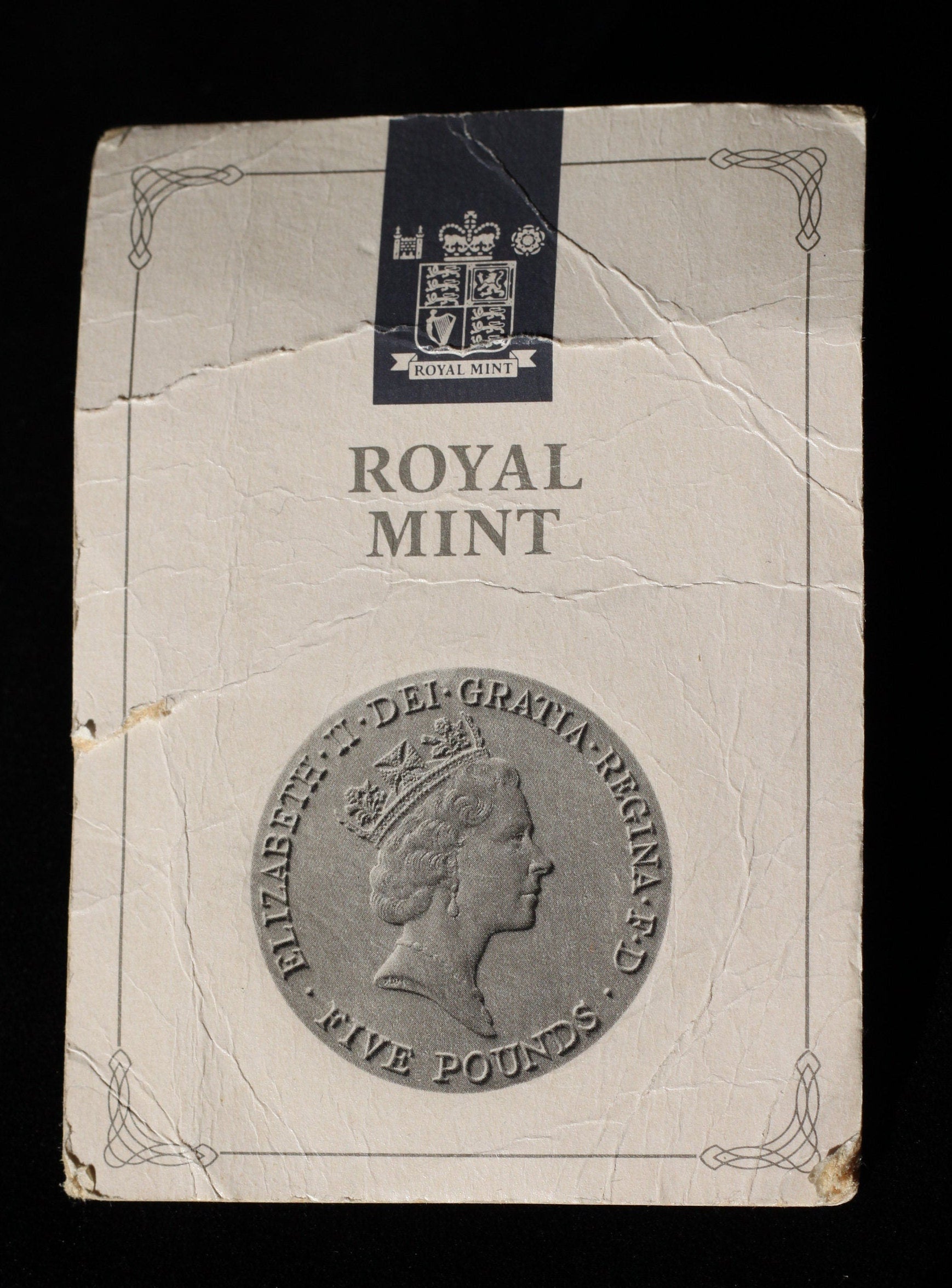 In commemorative packaging (see images) . In 1990, the Royal Mint re-tariffed crowns from their previous 25 pence value to 5 and this was the first of its kind - paying tribute to the Queen Mother on her 90th birthday.