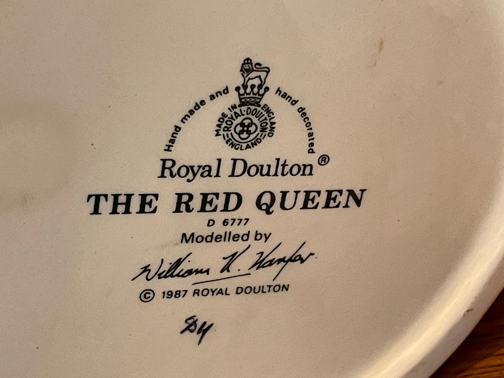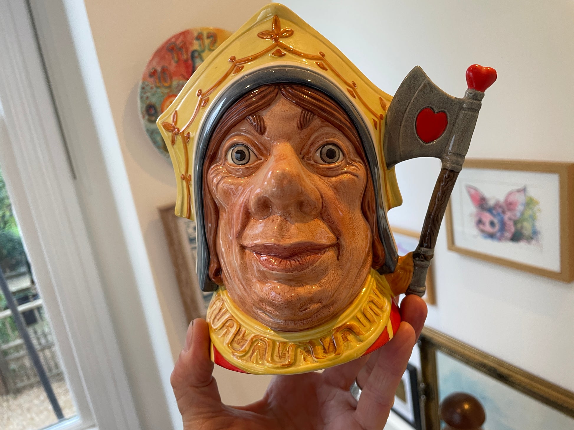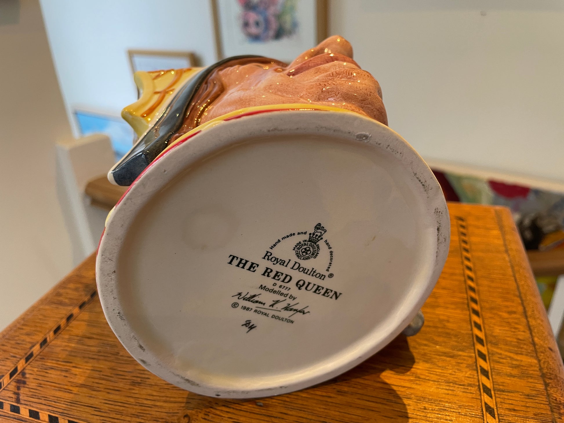 A Royal Doulton character jug representing The Red Queen, modelled by renowned sculptor William K. Harper and first issued in 1987 as part of the beloved Alice in Wonderland series. This large-size jug is packed with sculptural detail: the Red Queen’s commanding expression, richly painted crown, and the distinctive axe-shaped handle topped with a heart — a clever nod to Lewis Carroll’s iconic character.