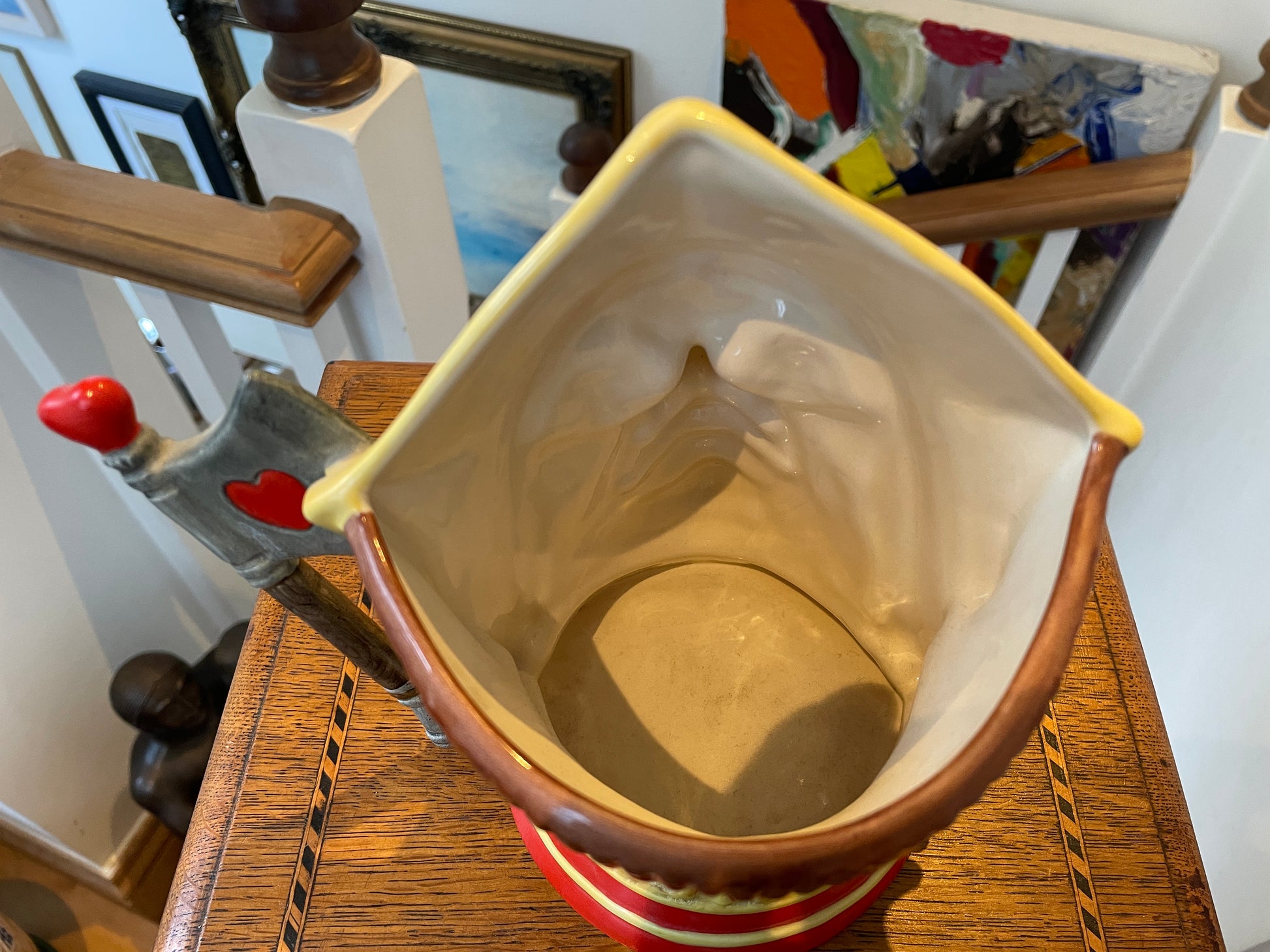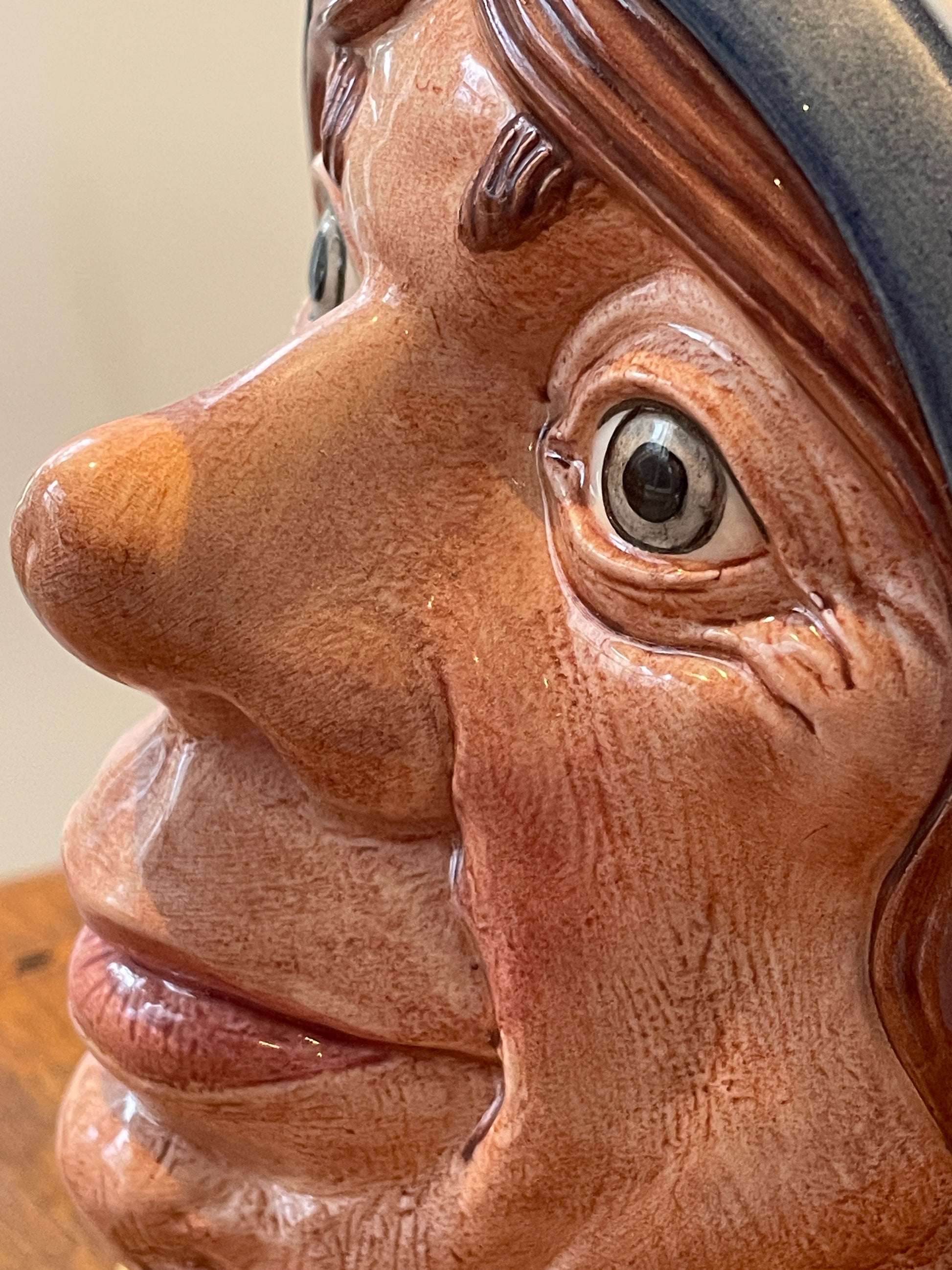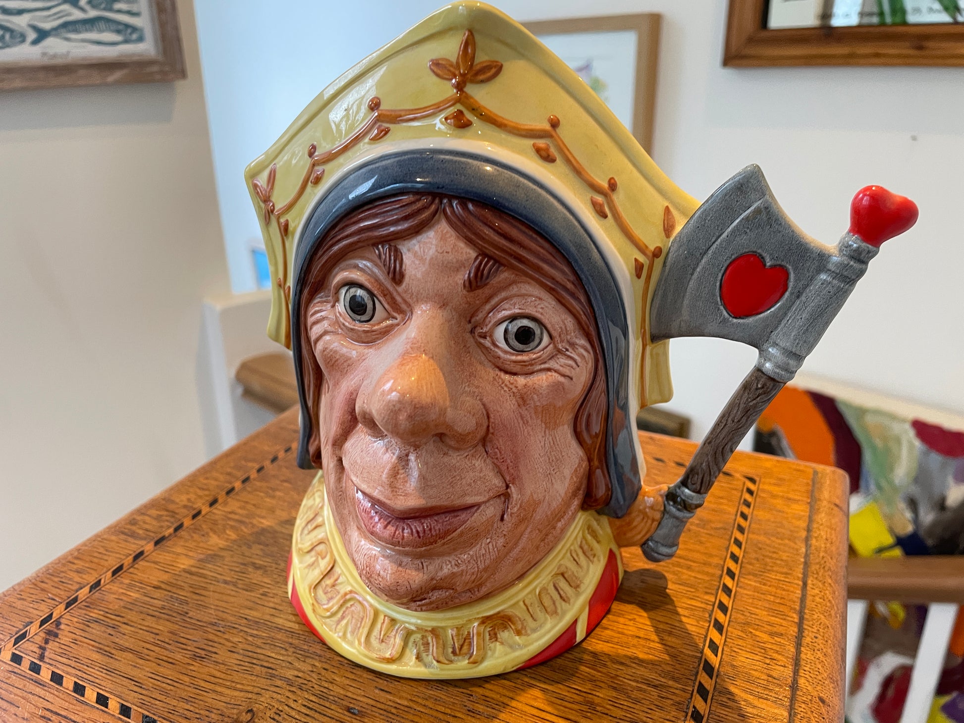 A Royal Doulton character jug representing The Red Queen, modelled by renowned sculptor William K. Harper and first issued in 1987 as part of the beloved Alice in Wonderland series. This large-size jug is packed with sculptural detail: the Red Queen’s commanding expression, richly painted crown, and the distinctive axe-shaped handle topped with a heart — a clever nod to Lewis Carroll’s iconic character.