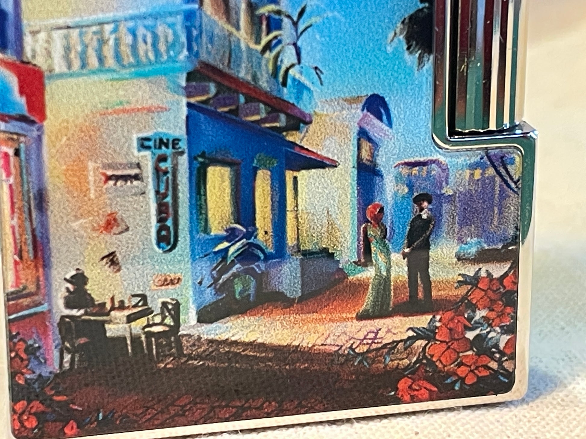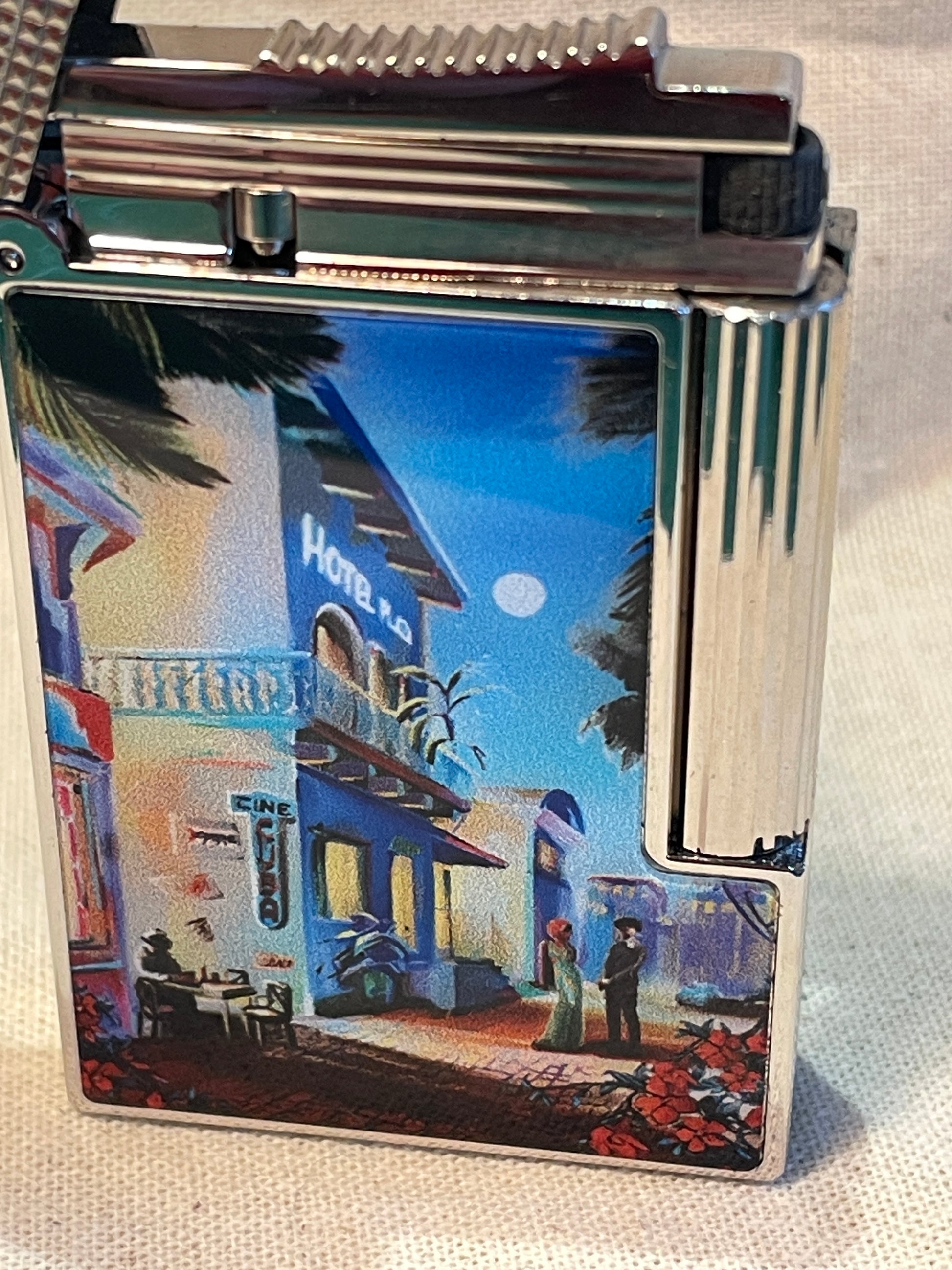 An authentic S.T. Dupont Ligne 2 “Cuba” lighter, inspired by the colourful streets of Havana and finished with printed lacquer panels depicting vibrant urban scenes. This is the Large Classic Ligne 2 model, manufactured in France and finished in a platinum-tone micro diamond guilloché.