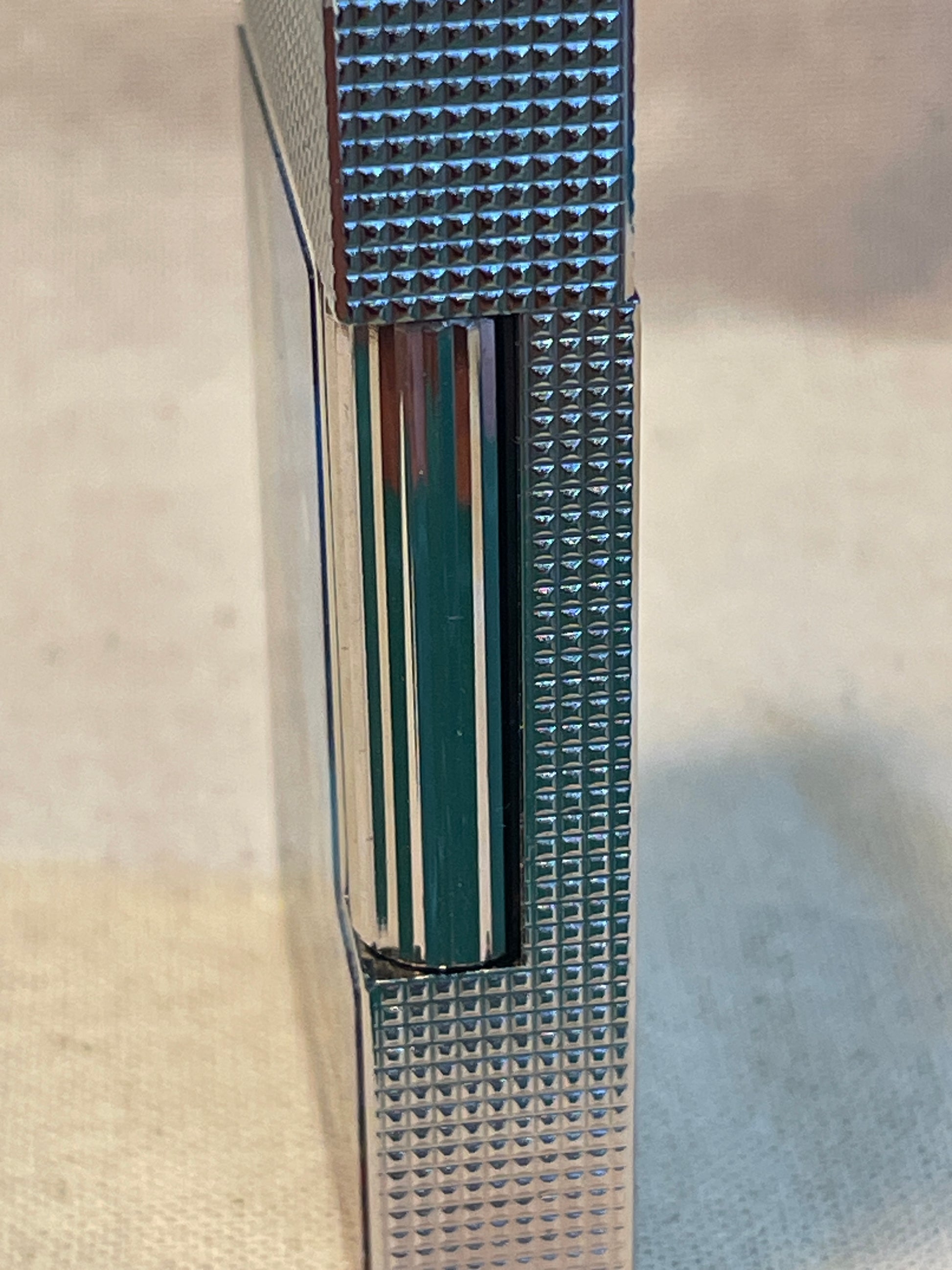 The top and sides are engine-turned with the classic micro diamond head pattern, while the lid is engraved with the S.T. Dupont logo. The ignition roller is engraved with 24 grooves to improve grip. The base is stamped “S.T. Dupont Paris – Made in France” with production code 1PBAY16, confirming authenticity.